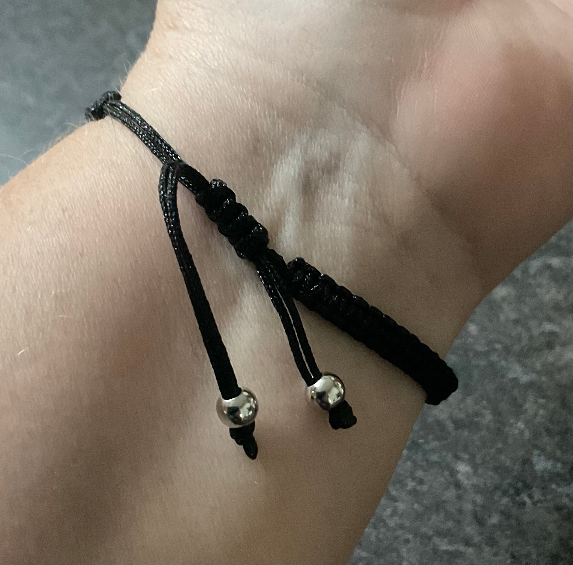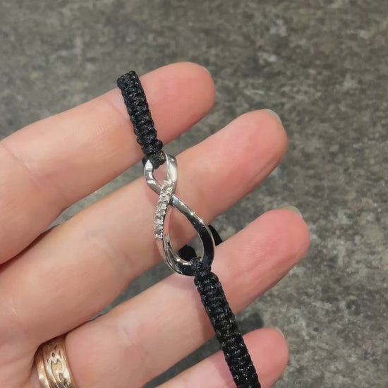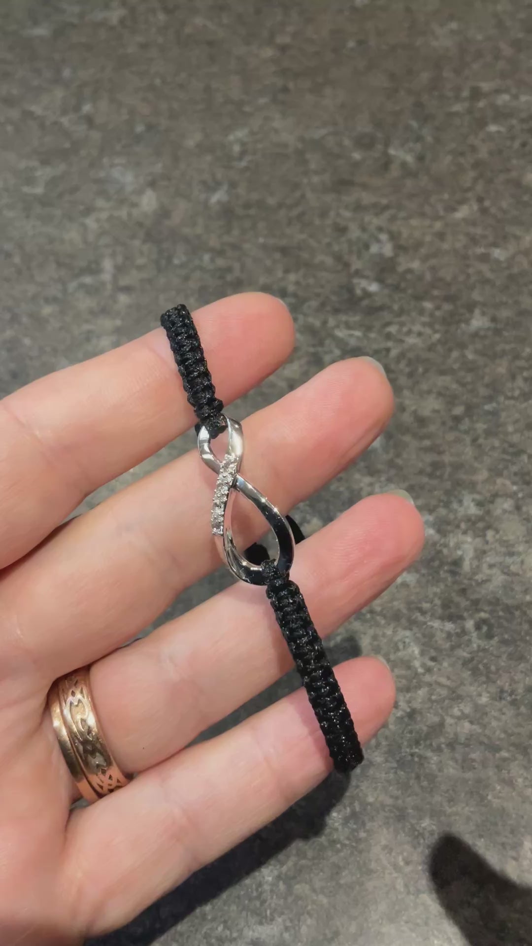 Clogau White Topaz Eternity friendship bracelet with adjustable black cord band in silver and rose gold in excellent, unworn condition. The back of the eternity design is stamped Clogau with the silver hallmark. The design measures 3cm long and 1.3cm wide. The sliding clasp allows it to easily pass over pretty much any size hand and then be adjusted to fit comfortably to your particular wrist size. It will come in a white Clogau bracelet box.