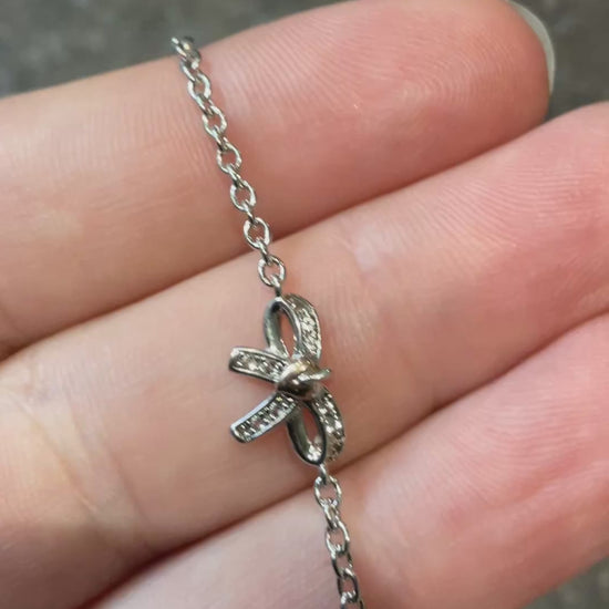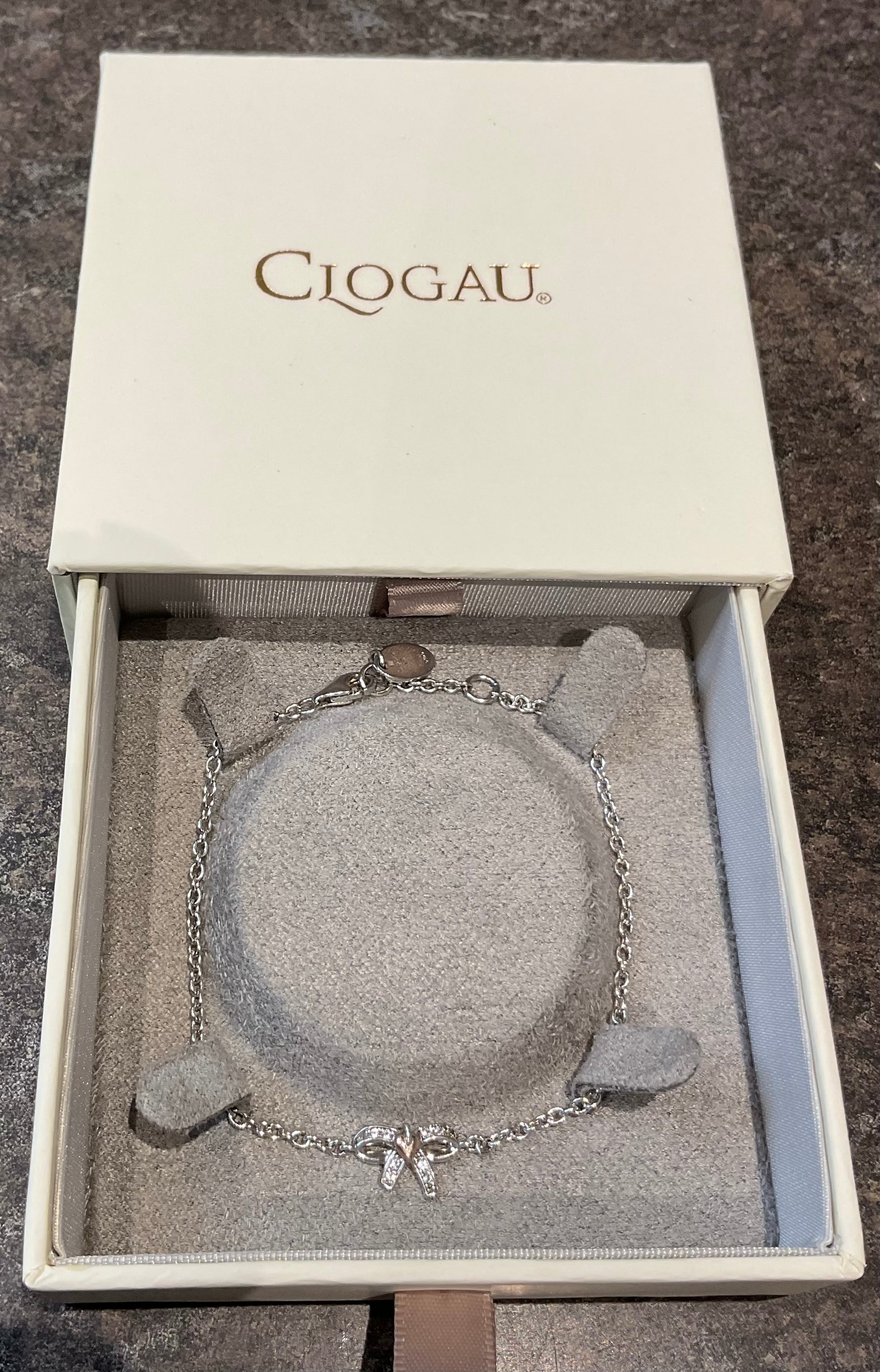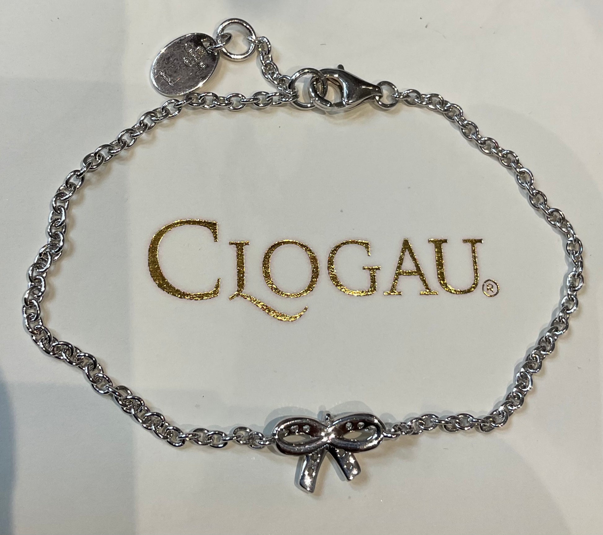 This lovely, dainty little Clogau Tree of Life Bow bracelet can be worn at 17.5cm or 18.5cm. The sterling silver bow measures 12x7mm and is set with sparkling white topaz stones, at the centre is a rose gold Tree of Life leaf. At the end of the silver chain is the Clogau tag with the Clogau stamps and hallmark. This bracelet will come in a Clogau box and is in great preowned condition with small signs of wear on very close inspection. I am also selling the matching earrings and ring.