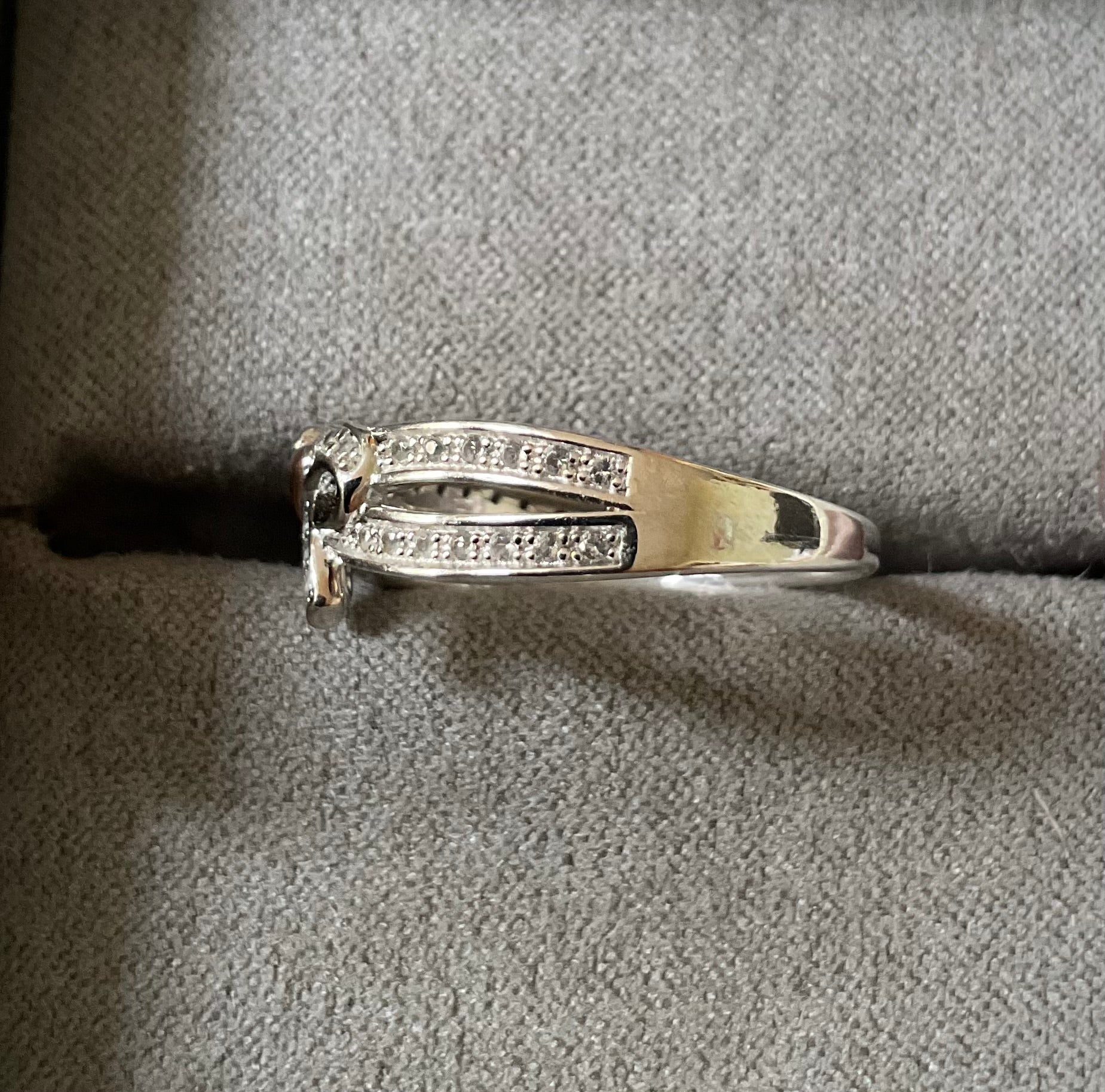 This is such a pretty Clogau ring, with split shoulders set with white topaz stones and a central bow, again set with white topaz, featuring a rose gold heart at its centre. The ring is a size P and measures 7mm at its widest (top to bottom of bow). The band has all the expected Clogau silver stamps and hallmarks and the ring comes in a White Clogau box with Clogau cleaning cloth. It’s in lovely condition, you’d have to look very closely for any signs of wear.