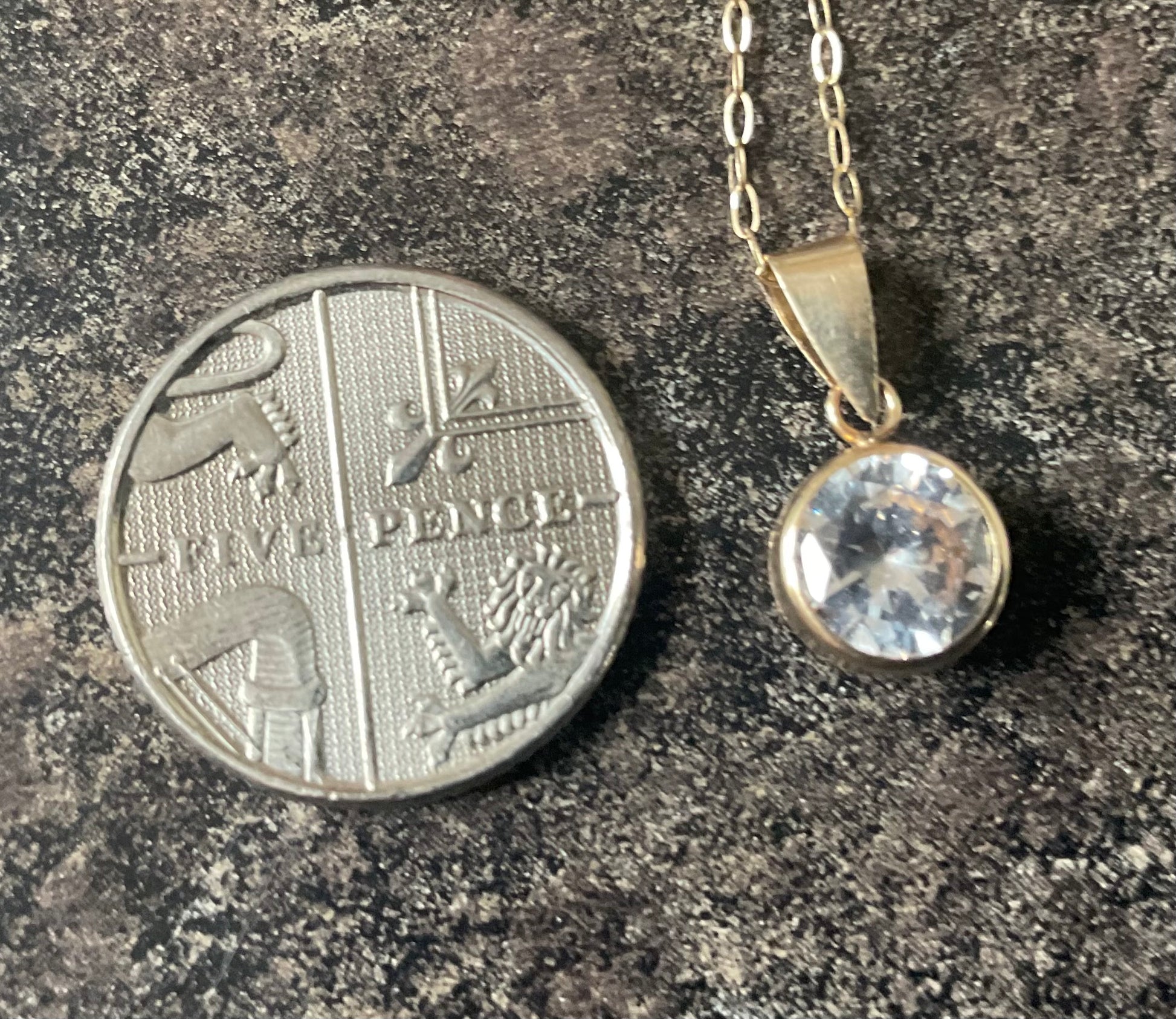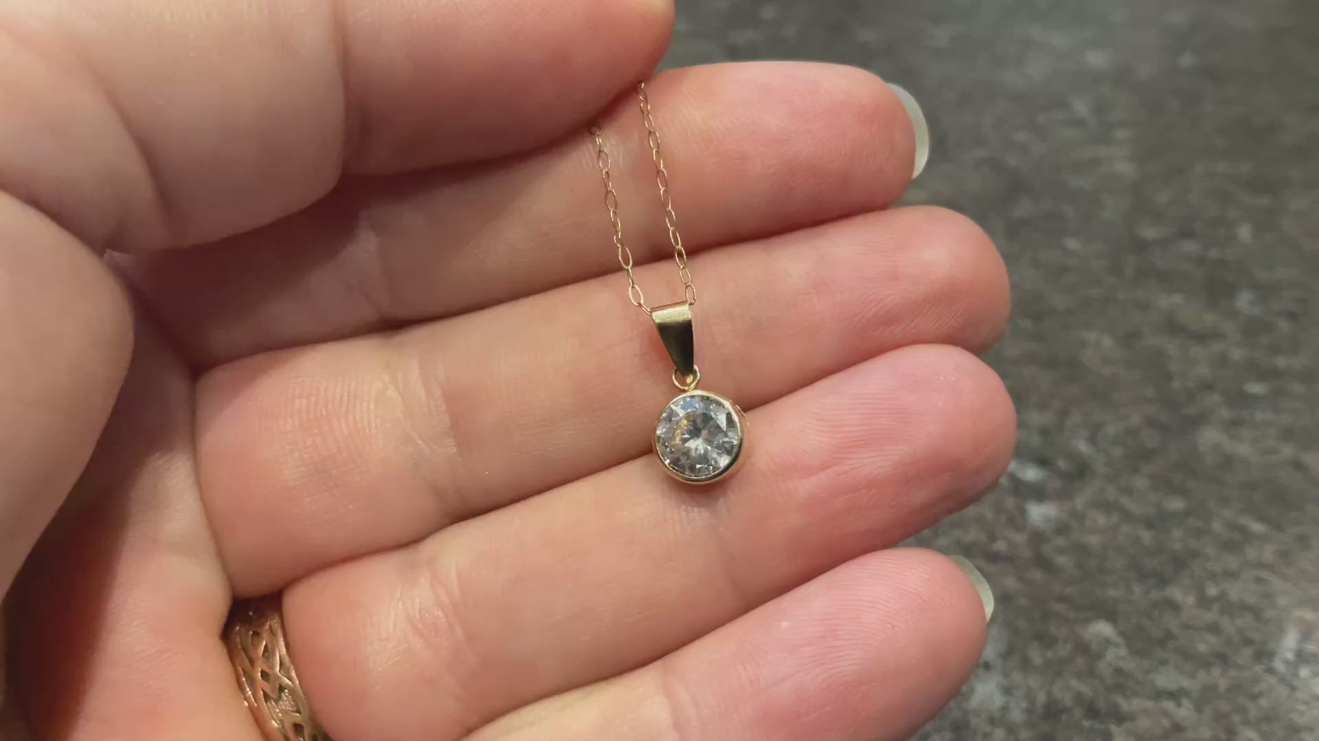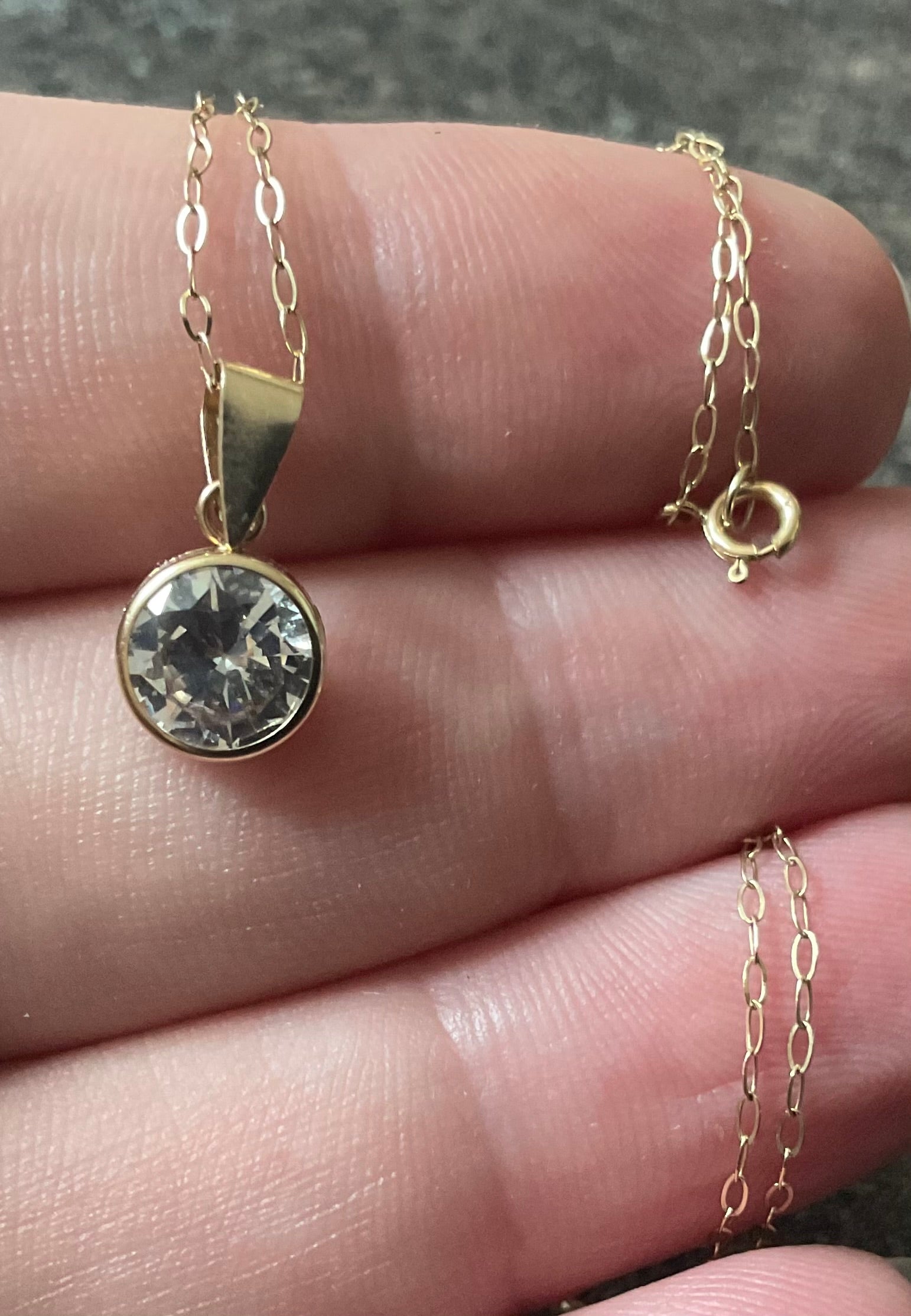 This is a very pretty, dainty little necklace. The 6mm round cut cubic zirconia stone is bezel set into a pendant that measures 1.3cm long from the top of the bale and 7mm wide. The back of the bale is stamped 375CZIBB. The 16” trace chain is very fine and is stamped 9K on the clasp. The necklace is very light weight, so should be comfortable to wear all day. This necklace is preloved and does have light surface marks to the gold on close inspection. It will come in a gift box.