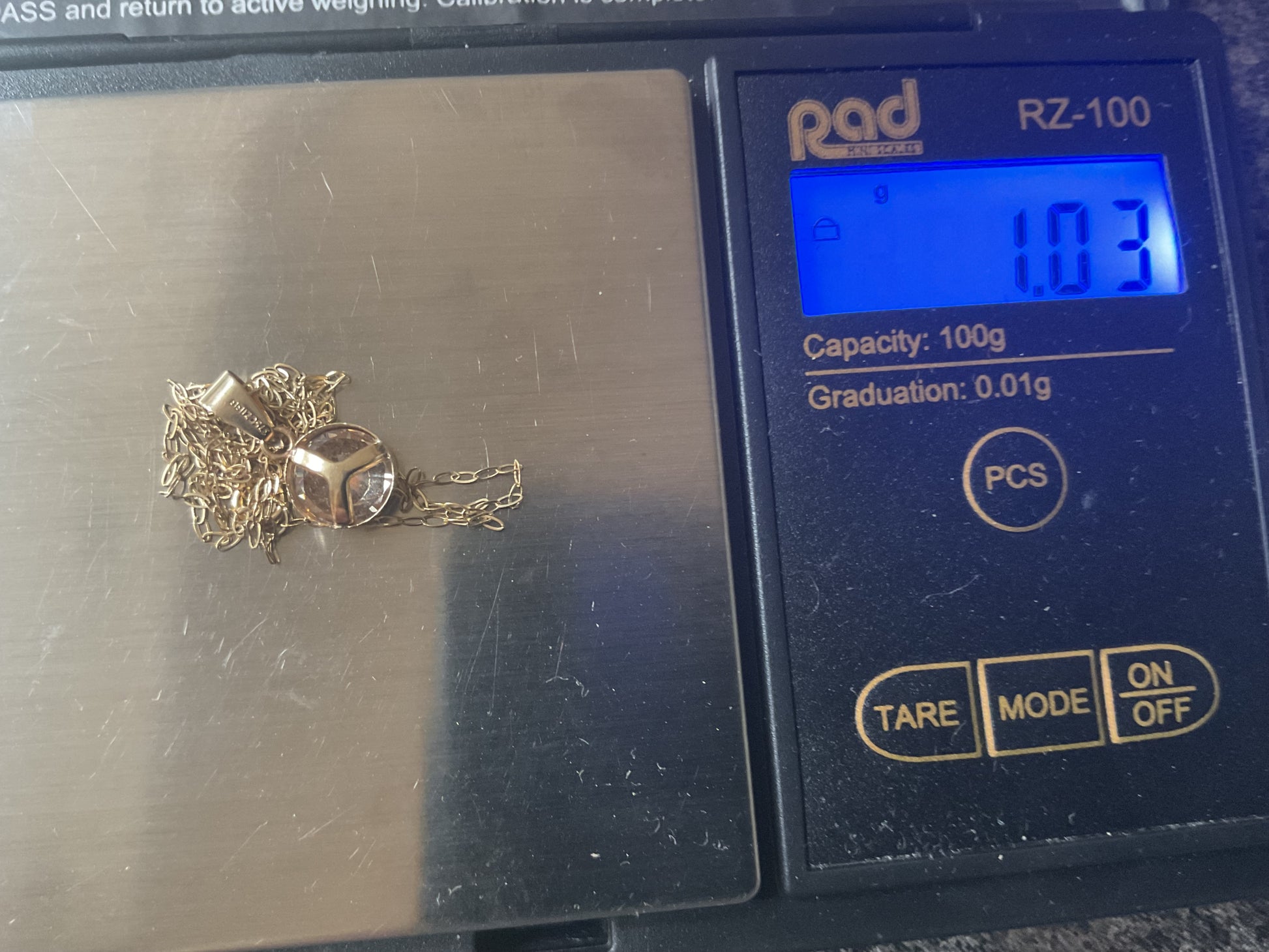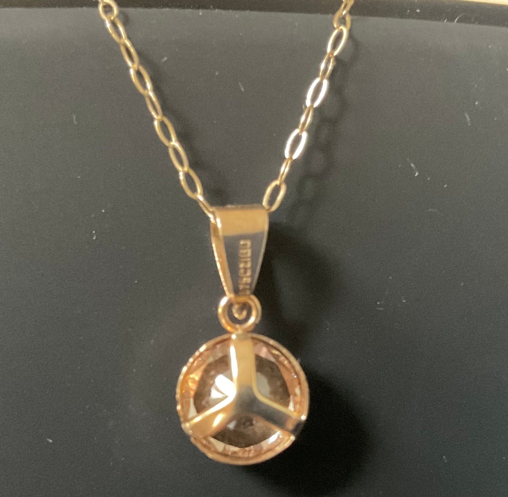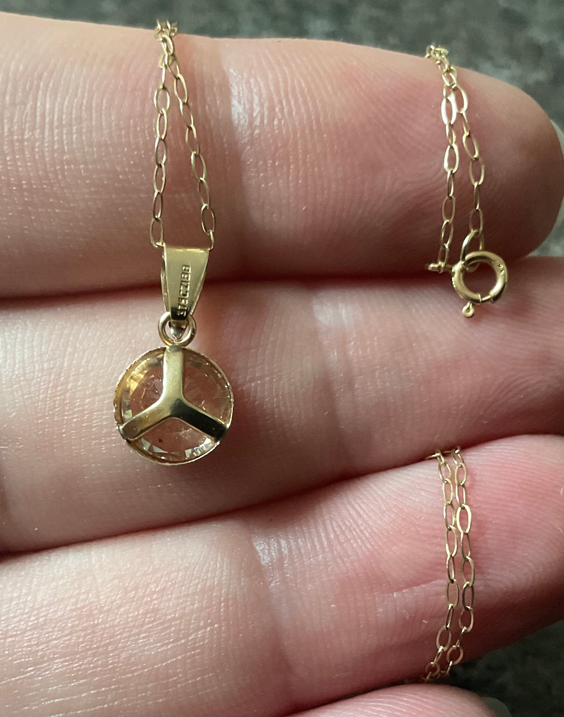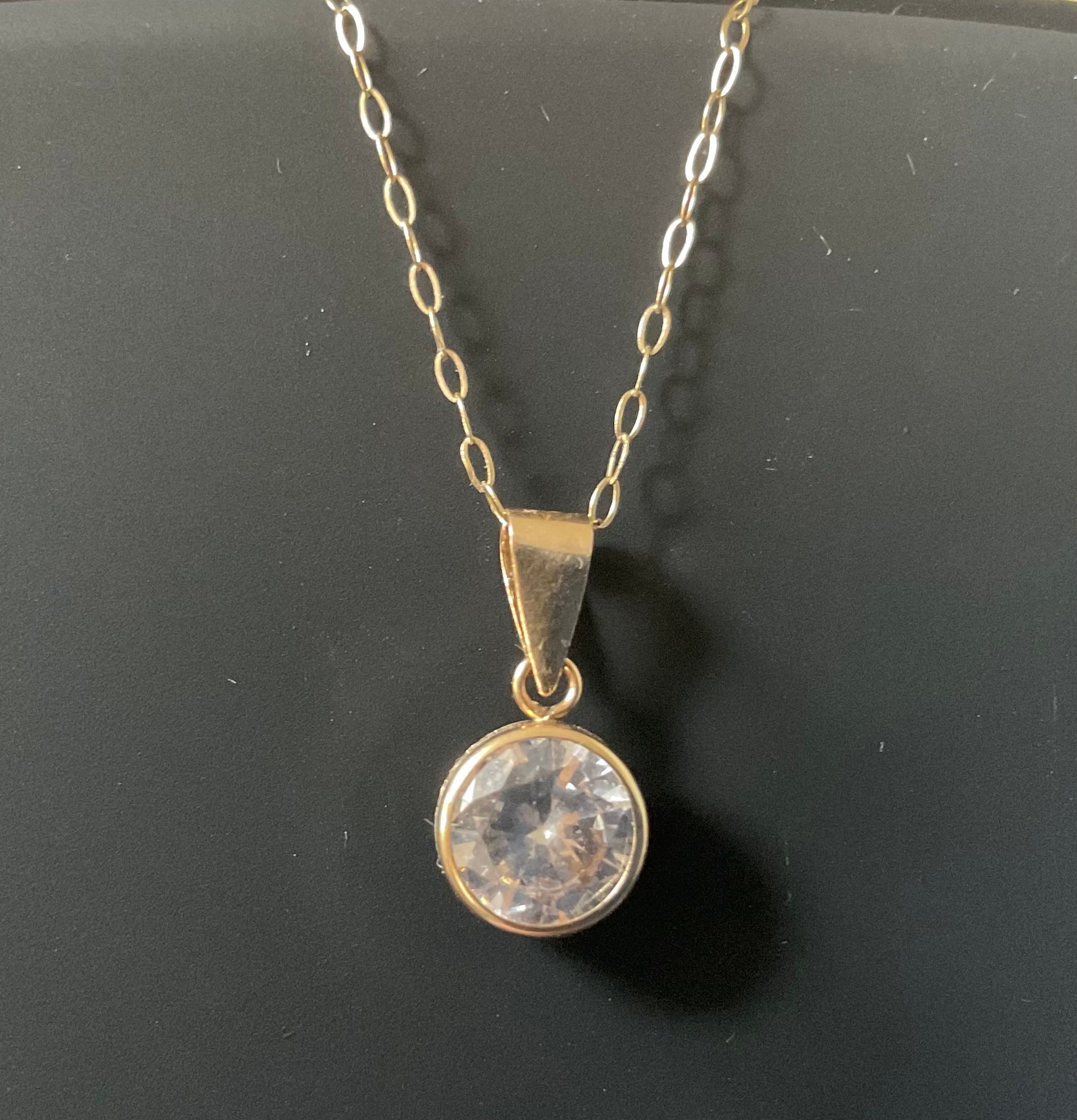 This is a very pretty, dainty little necklace. The 6mm round cut cubic zirconia stone is bezel set into a pendant that measures 1.3cm long from the top of the bale and 7mm wide. The back of the bale is stamped 375CZIBB. The 16” trace chain is very fine and is stamped 9K on the clasp. The necklace is very light weight, so should be comfortable to wear all day. This necklace is preloved and does have light surface marks to the gold on close inspection. It will come in a gift box.