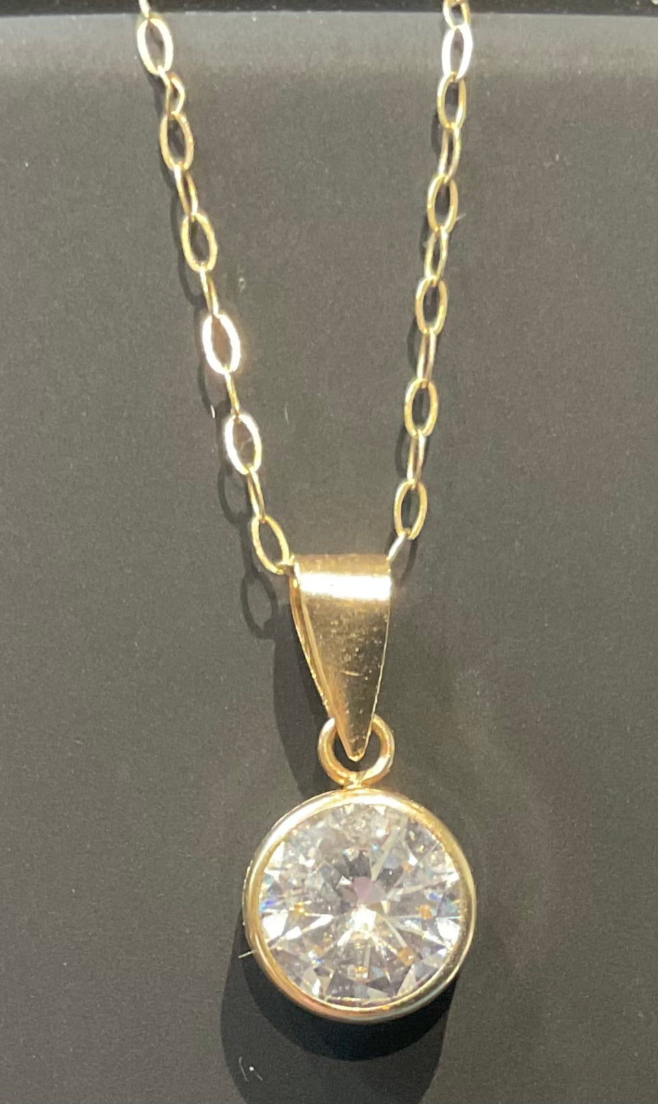IBB 9ct Cubic Zirconia round bezel set solitaire pendant on 16" fine trace chain