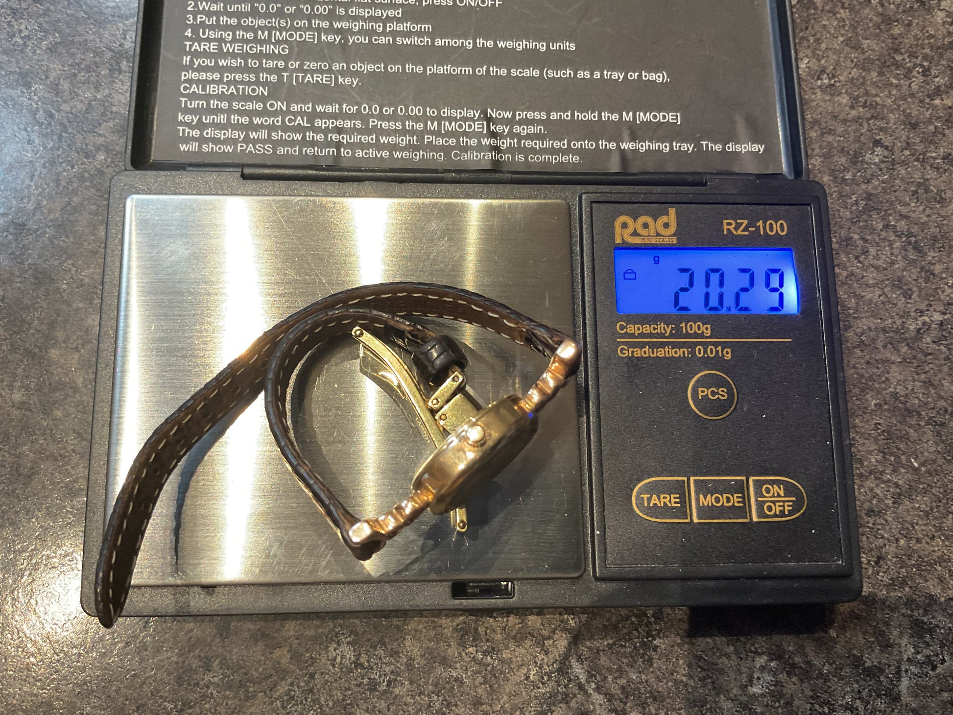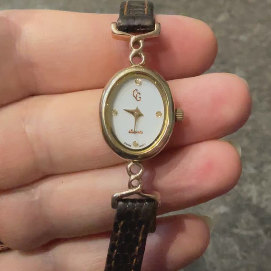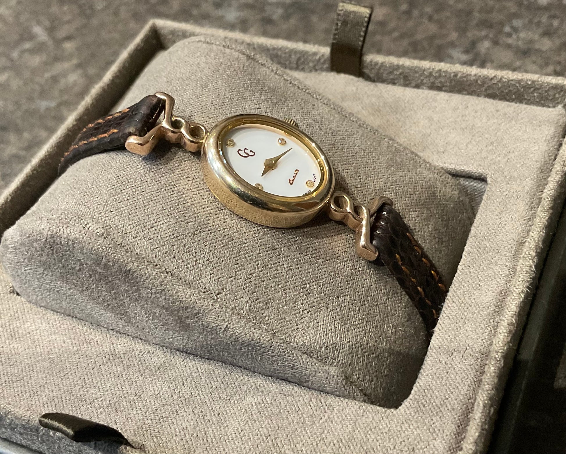 This is a very attractive Clogau Ladies watch, which is fully working with a new battery recently added. The oval face of the watch is white and I believe is mother of pearl but I’m not 100% sure on this. At the 12, 3, 6 and 9 positions are tiny sparkling diamond accents. The case is 9ct yellow gold with the serial number, Clogau stamps and gold hallmarks on the back. The twist designs are solid 9ct rose gold. The writing on the face says CG, Quartz and SWISS MOVT. The visible face measures 1.5x1.2cm. The whole design including watch face and arms measures 4cm in length. The gold plated, stainless steel clasp allows the watch to be adjusted in length between 16.5 and 19.5cm. This watch was a preowned purchase and shows signs of wear in the form of surface marks, wear to the gold plating on the clasp and the leather strap. One end of the strap looks like it may have slipped or been restuck badly, so although it seems to be holding well, you may want to replace the original strap at a later date. This watch comes double boxed as shown and the price takes into account the wear described and the possible need to replace the strap in future.