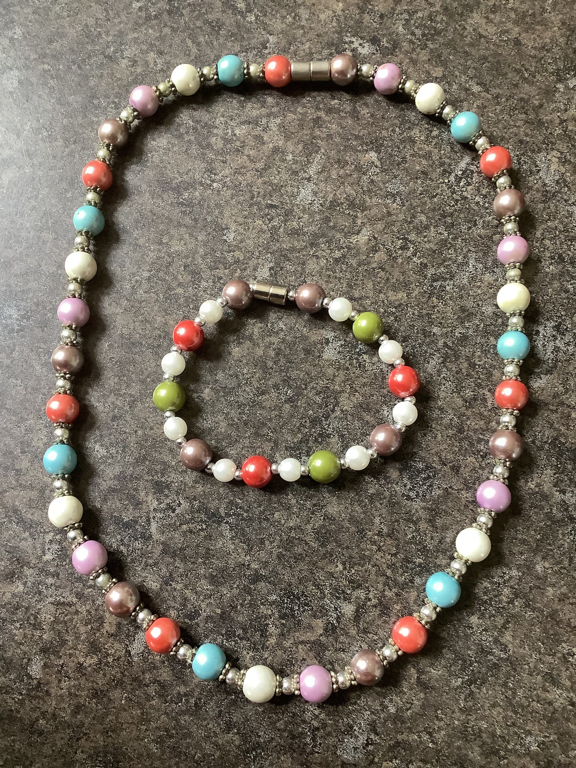 magnetic multicoloured bead silver tone necklace and bracelet set