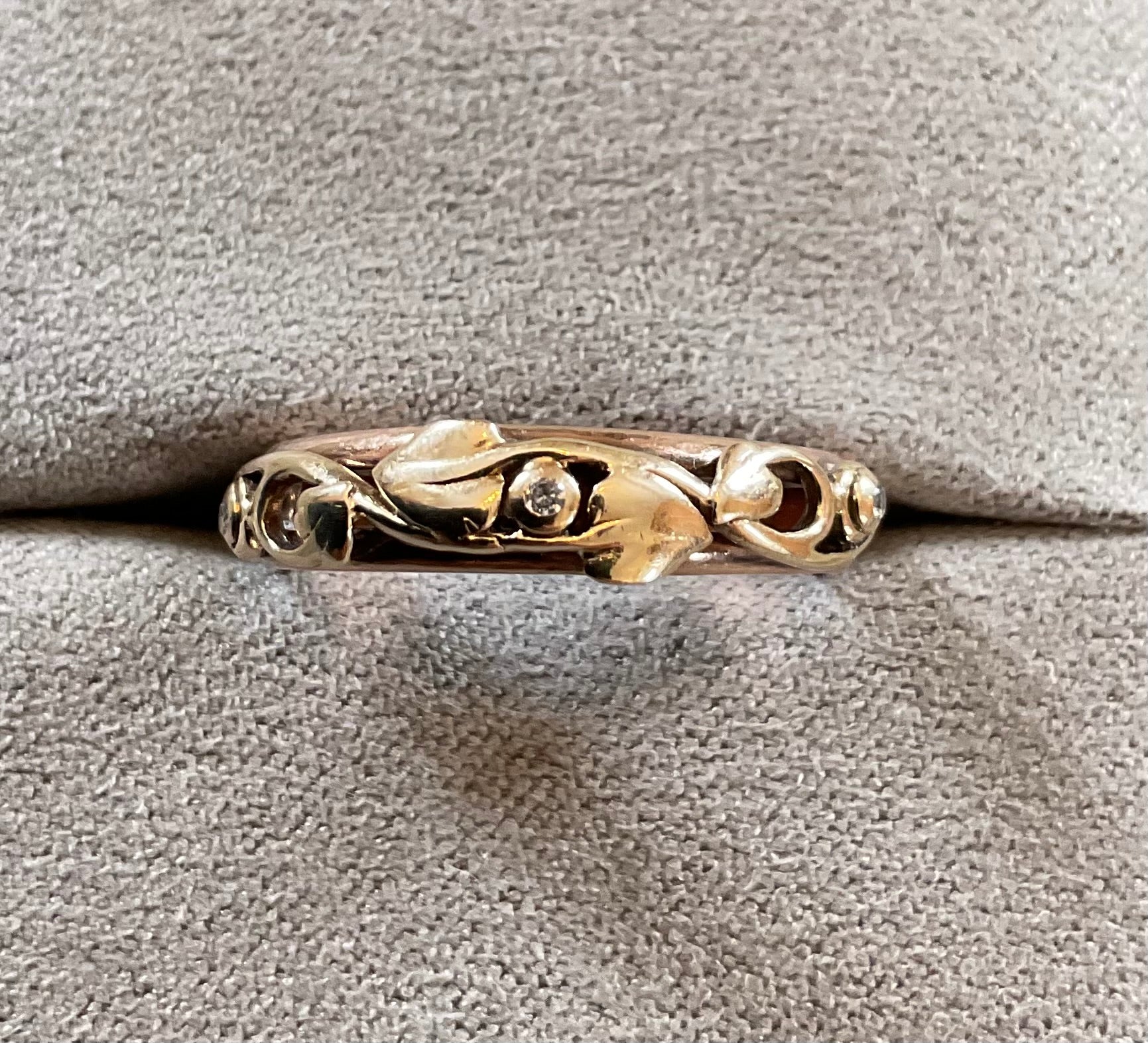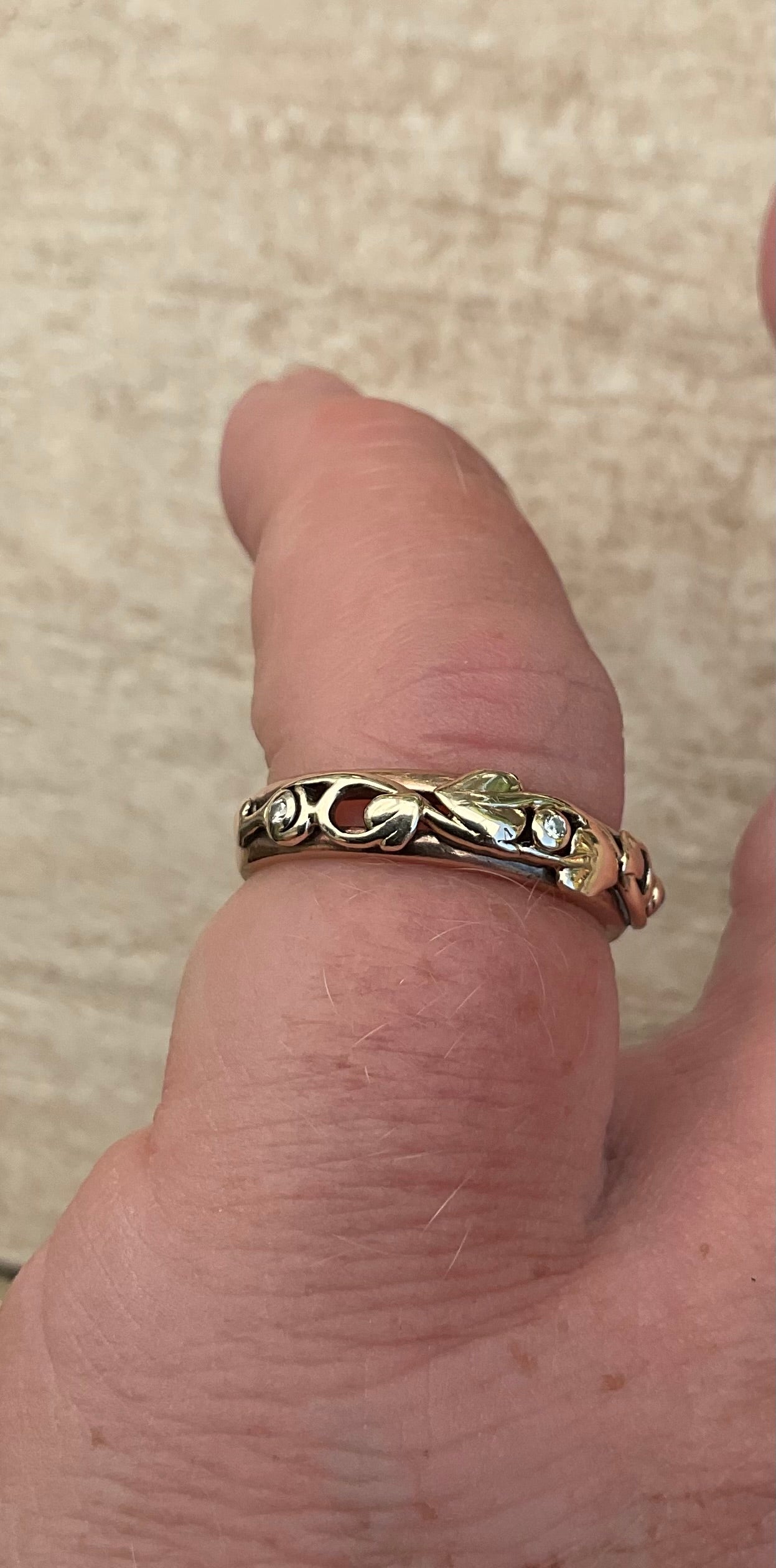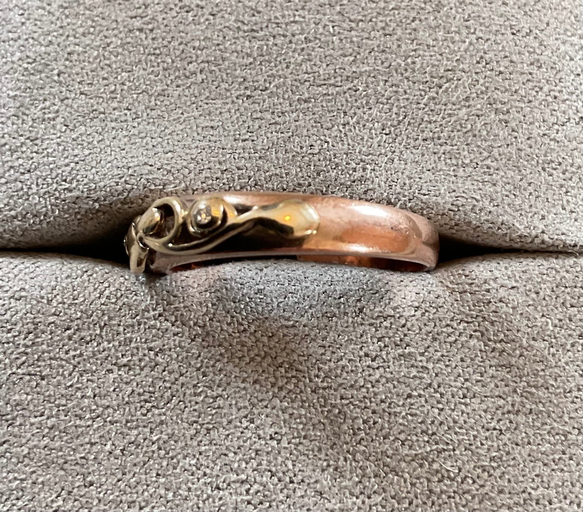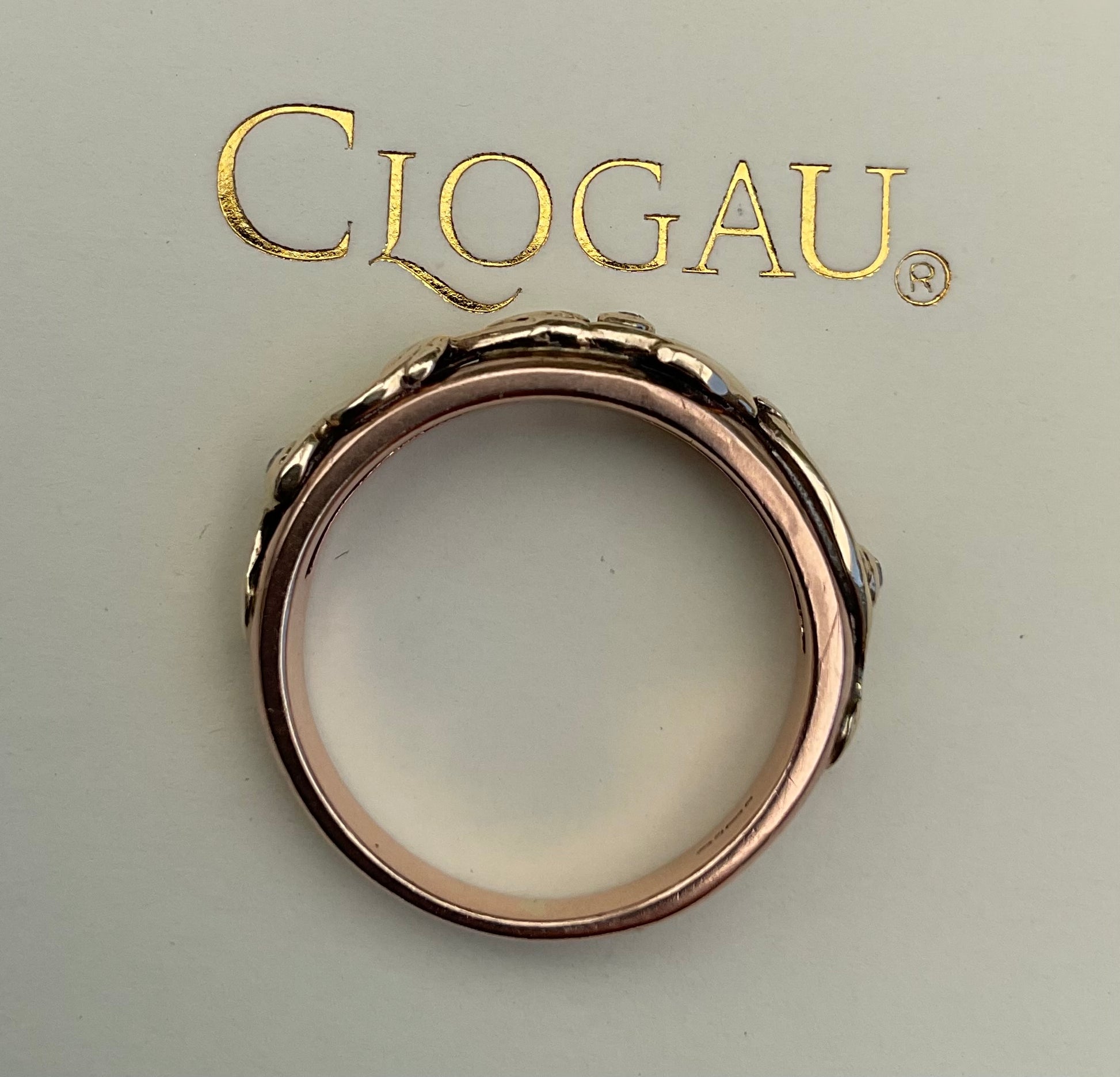This is a very pretty ring and hard to find, as it actually has a rose gold band with yellow gold Tree of Life detailing. At the centre and to each side are 3 small, round cut sparkling diamonds. It measures 4mm across at the widest point and has the Clogau gold hallmark. It is preloved and has signs of wear, I also feel that this has been resized in the past, as when I look through the magnifying loupe, there is a tiny strip of yellow gold at the back of the rose gold band. It’s been very well done but I am disclosing my suspicions anyway. My price has been based on these findings. It will come in a Clogau box.
