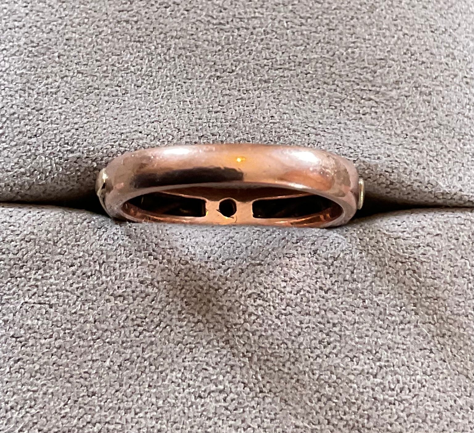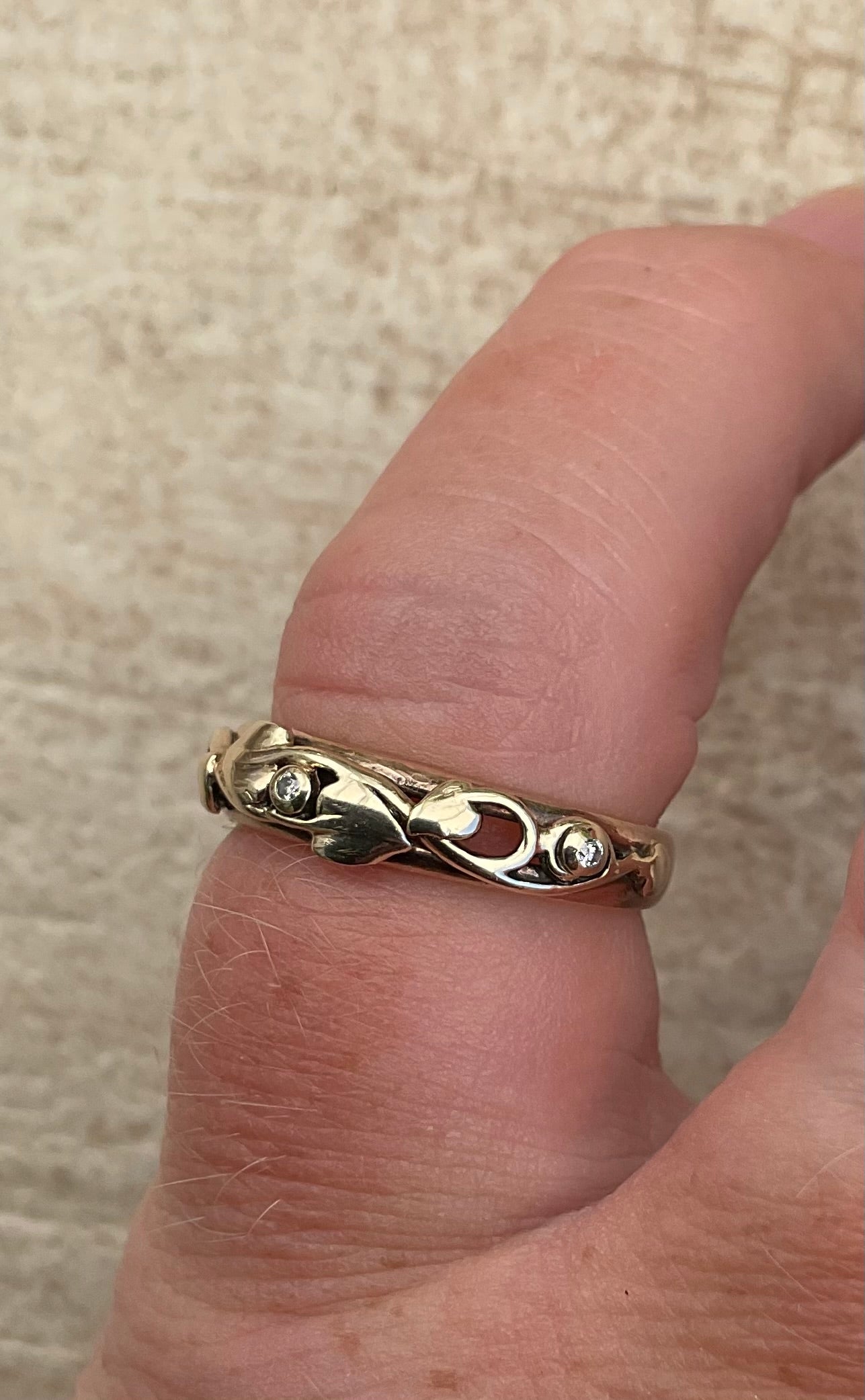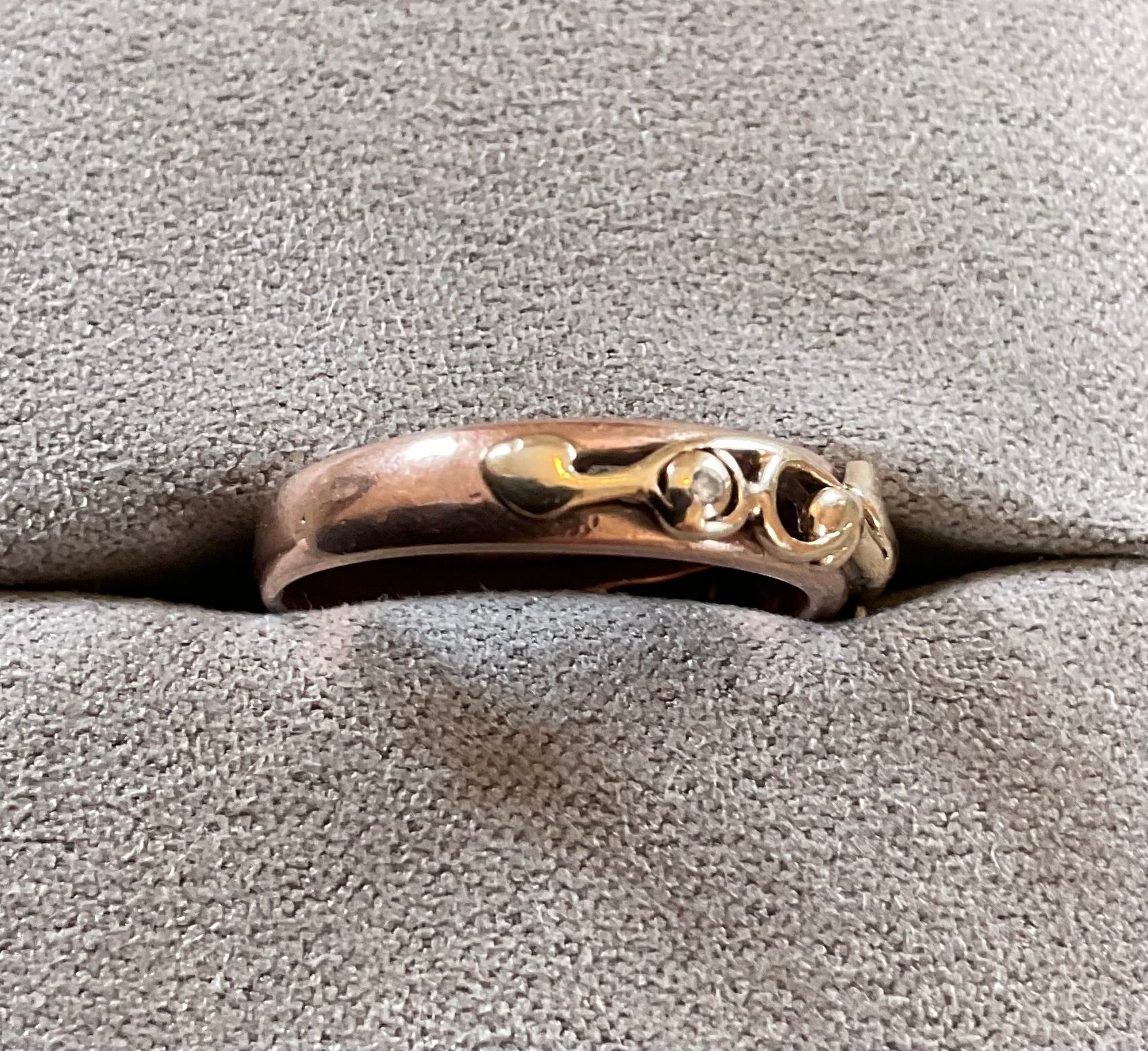 This is a very pretty ring and hard to find, as it actually has a rose gold band with yellow gold Tree of Life detailing. At the centre and to each side are 3 small, round cut sparkling diamonds. It measures 4mm across at the widest point and has the Clogau gold hallmark. It is preloved and has signs of wear, I also feel that this has been resized in the past, as when I look through the magnifying loupe, there is a tiny strip of yellow gold at the back of the rose gold band. It’s been very well done but I am disclosing my suspicions anyway. My price has been based on these findings. It will come in a Clogau box.