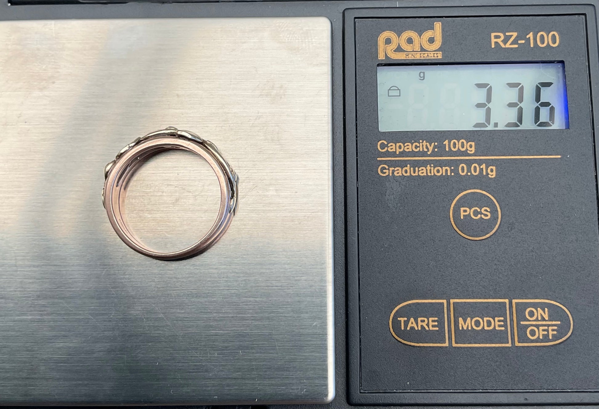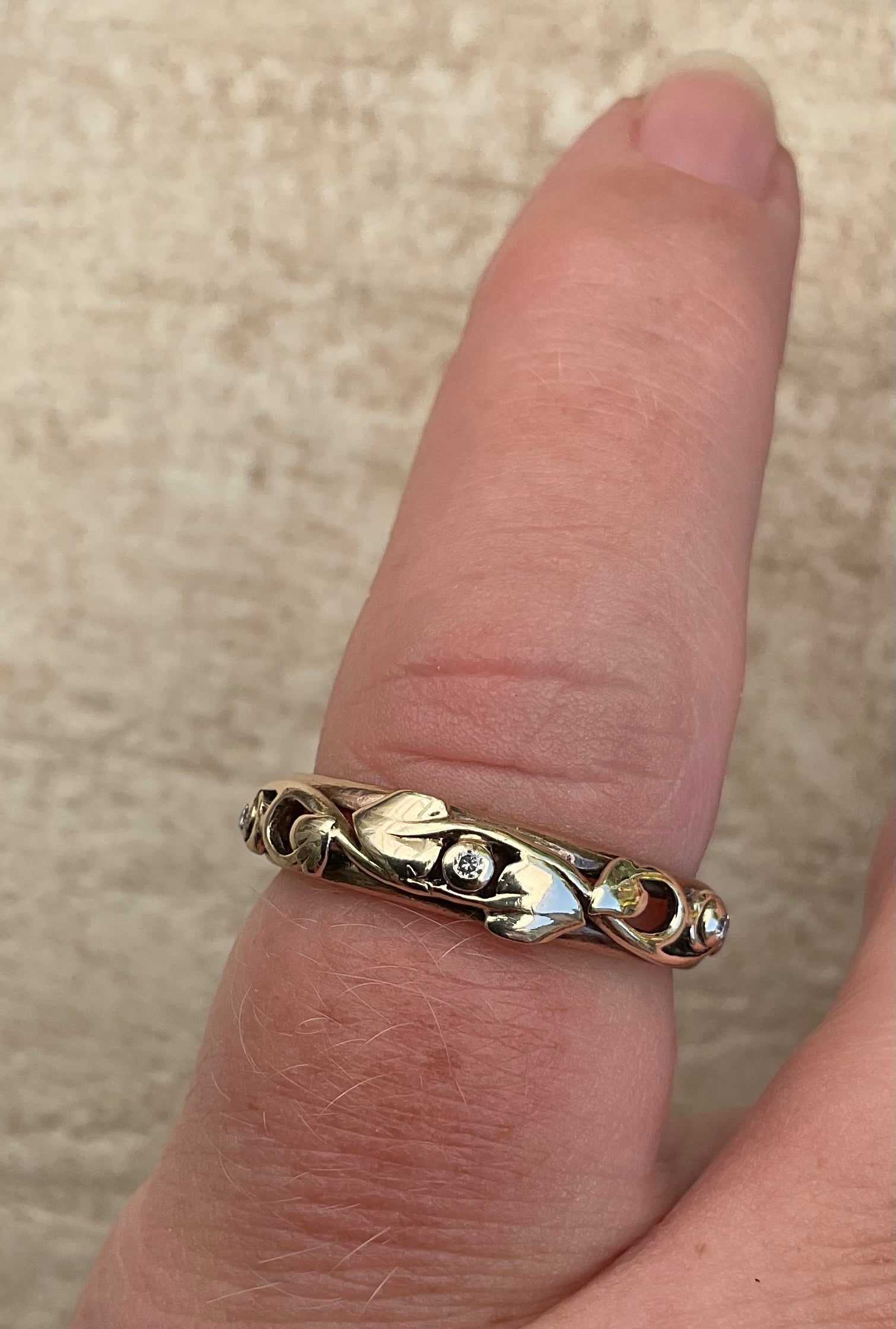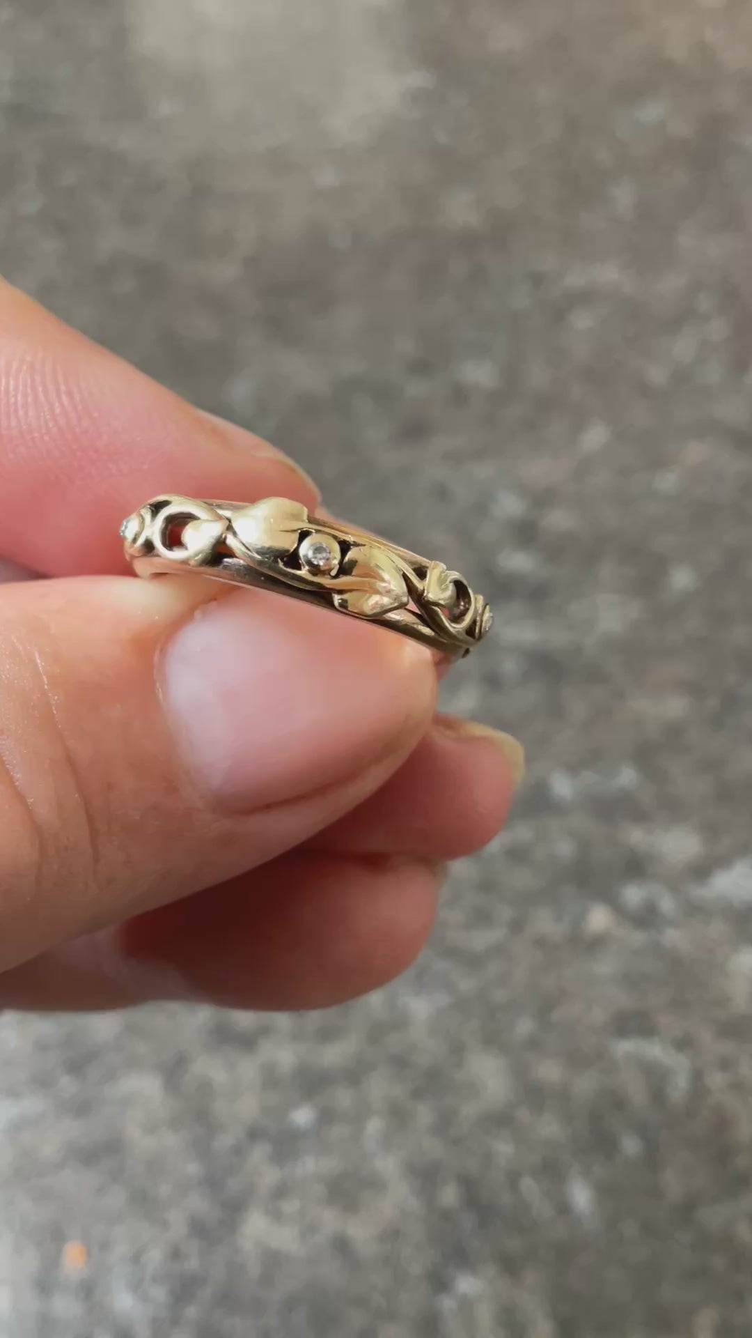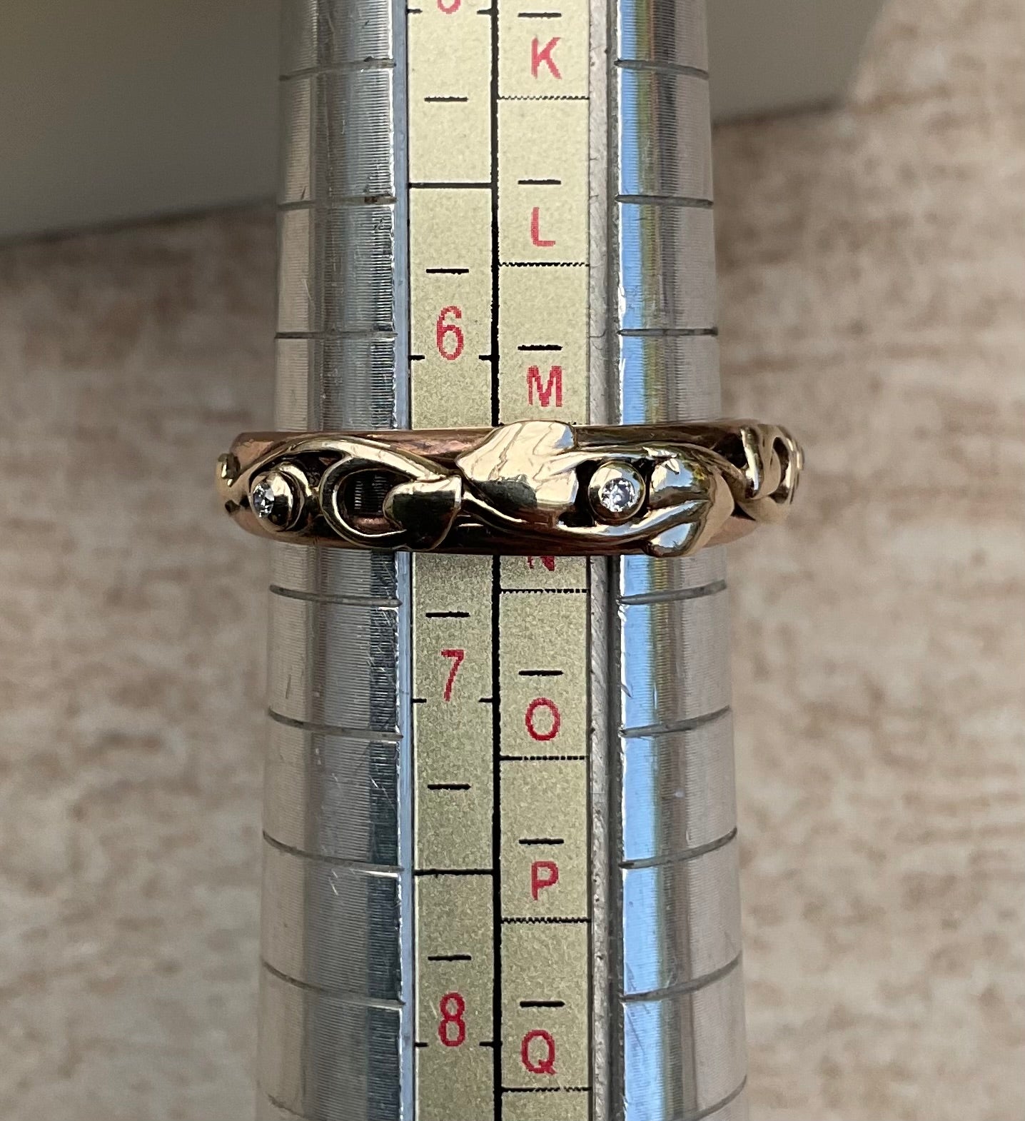 This is a very pretty ring and hard to find, as it actually has a rose gold band with yellow gold Tree of Life detailing. At the centre and to each side are 3 small, round cut sparkling diamonds. It measures 4mm across at the widest point and has the Clogau gold hallmark. It is preloved and has signs of wear, I also feel that this has been resized in the past, as when I look through the magnifying loupe, there is a tiny strip of yellow gold at the back of the rose gold band. It’s been very well done but I am disclosing my suspicions anyway. My price has been based on these findings. It will come in a Clogau box.