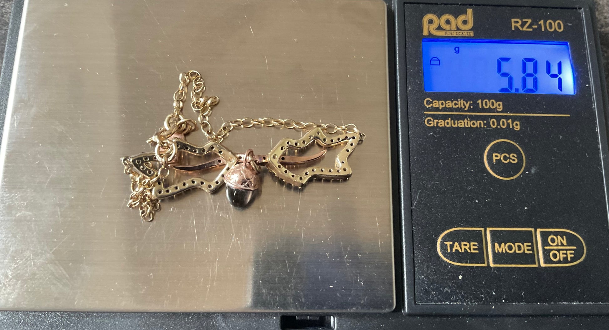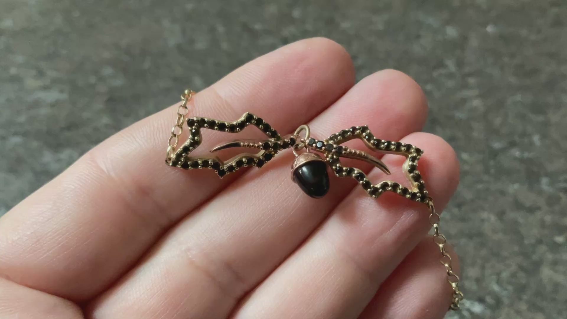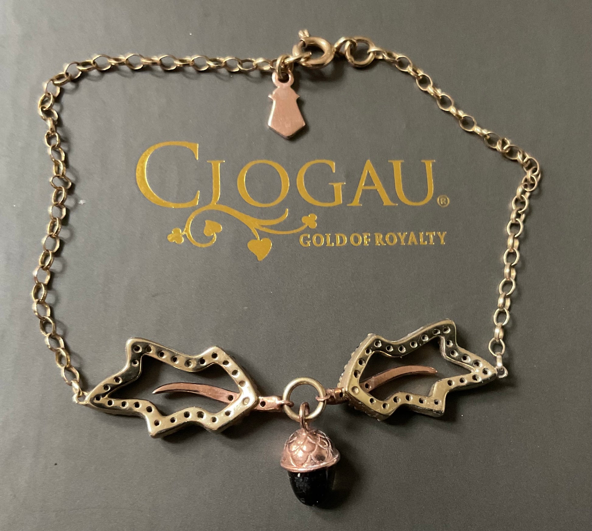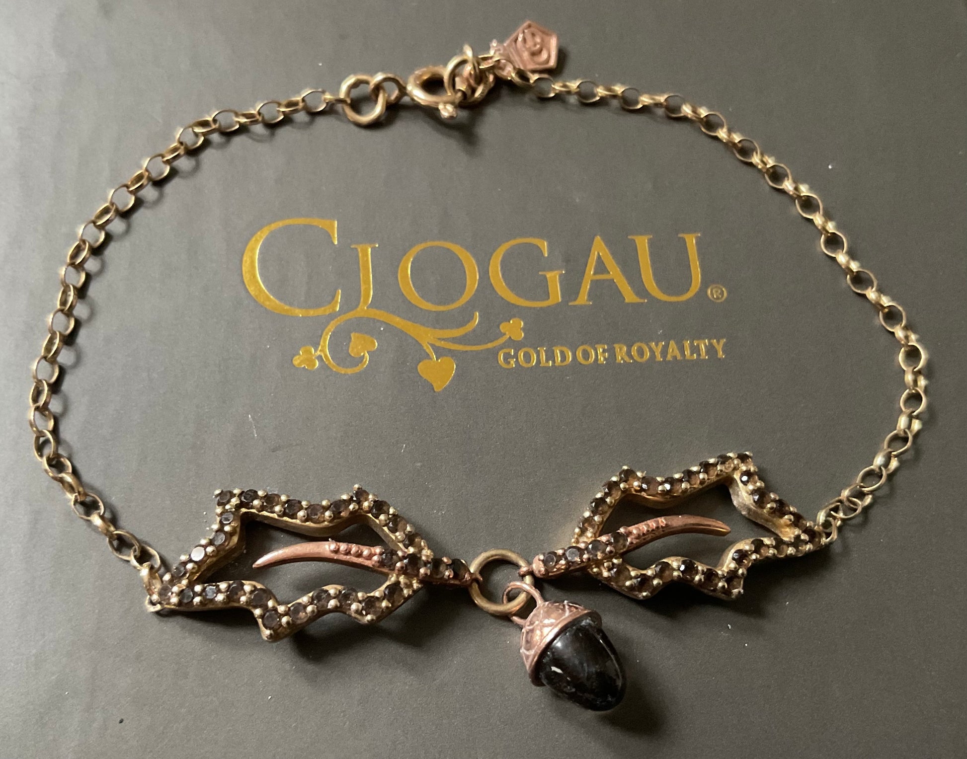 This unusual bracelet is gorgeous and not seen very often. It is from the 2011 Royal Oak range and features two oak leaves adorned with round cut Smokey quartz and a Smokey quartz acorn dangling between them. The whole design is 5cm across and the bracelet measures 19.5cm in length. It weighs 5.84g and has the Clogau rose gold tag and is hallmarked for 9ct gold on the link near the clasp. It’s in nice preloved condition with no obvious signs of wear. It will come in the box shown with the little certificate of authenticity booklet.