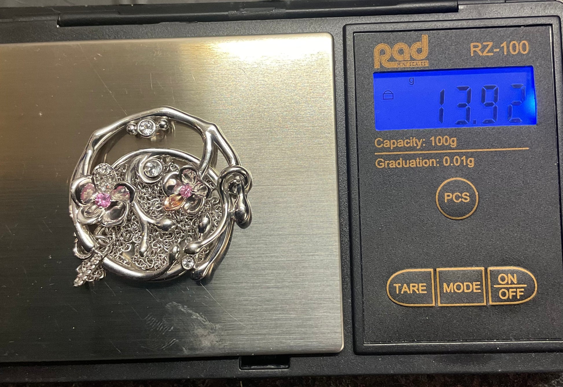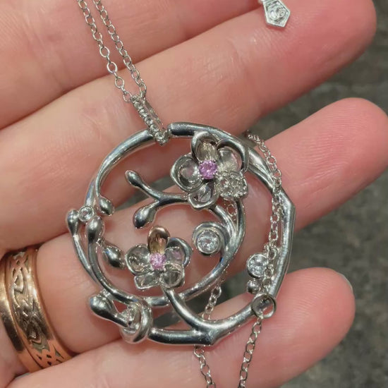 Rare Clogau Pink Sapphire and White Topaz Orchid Circular pendant necklace in silver and rose gold 20-24”