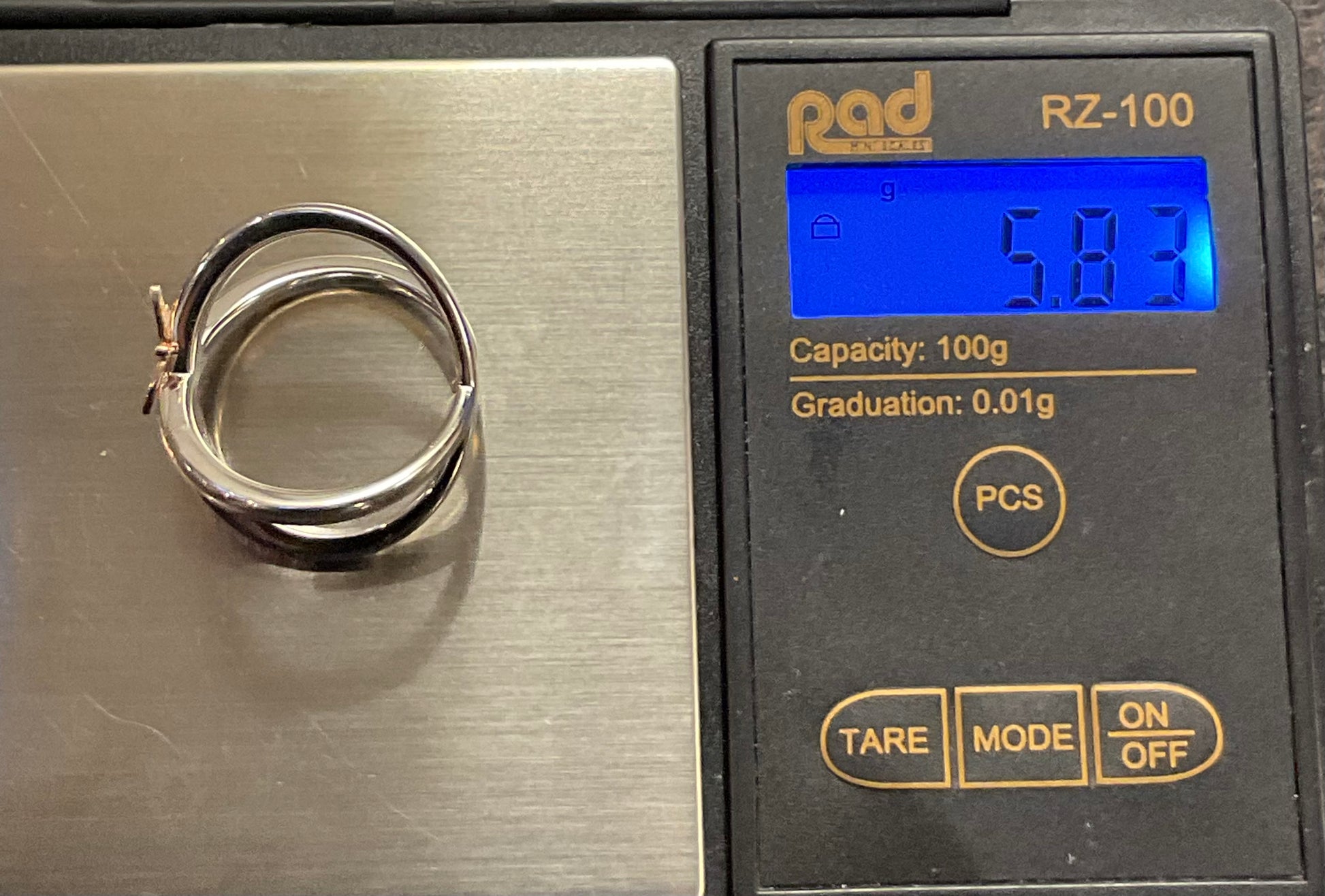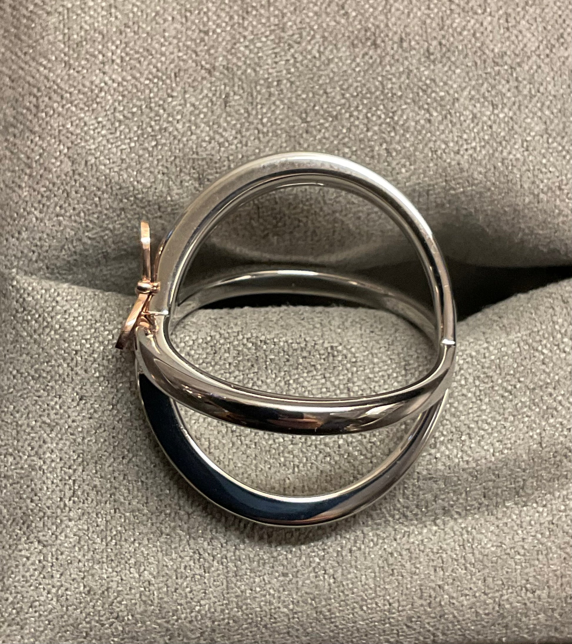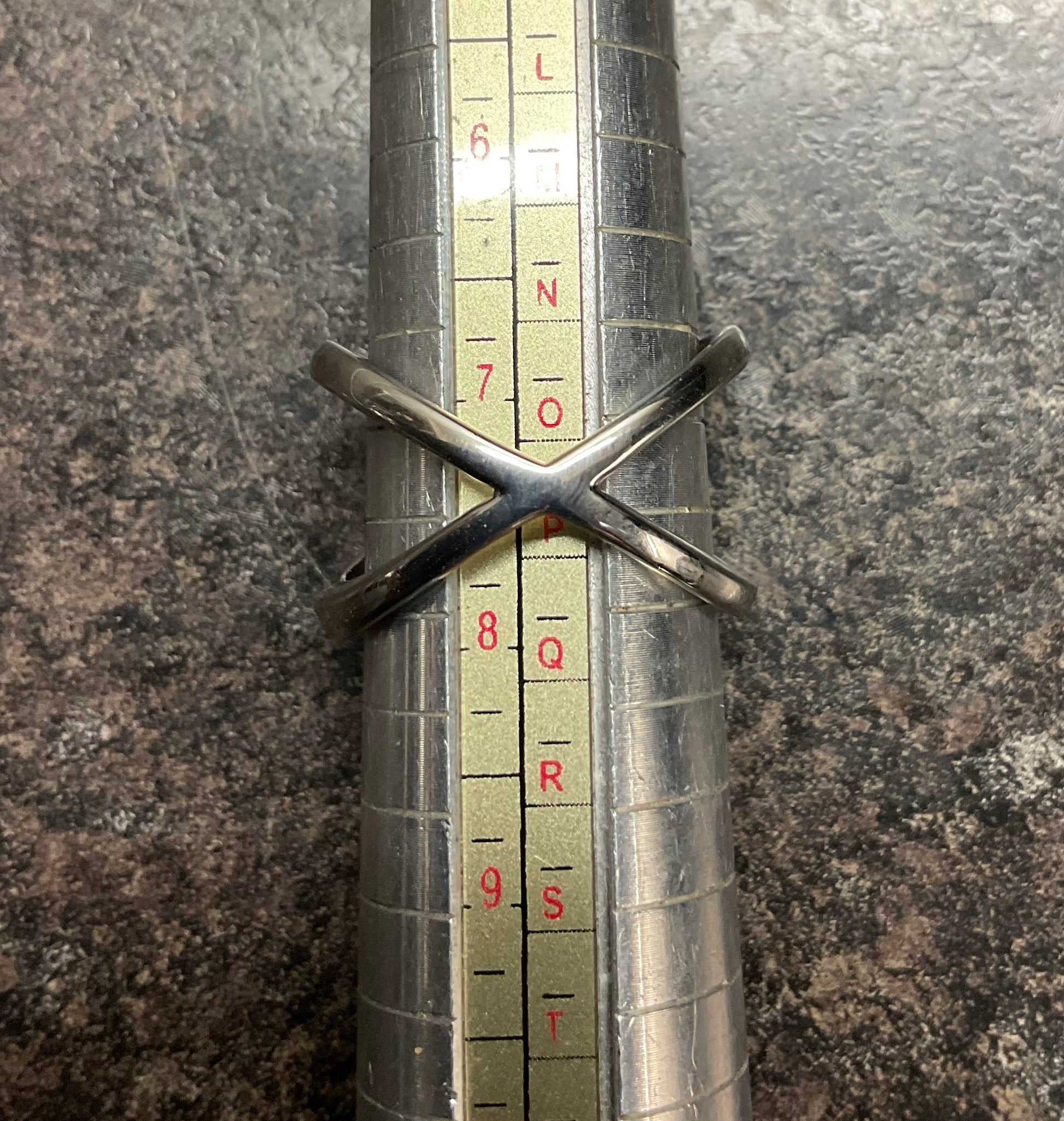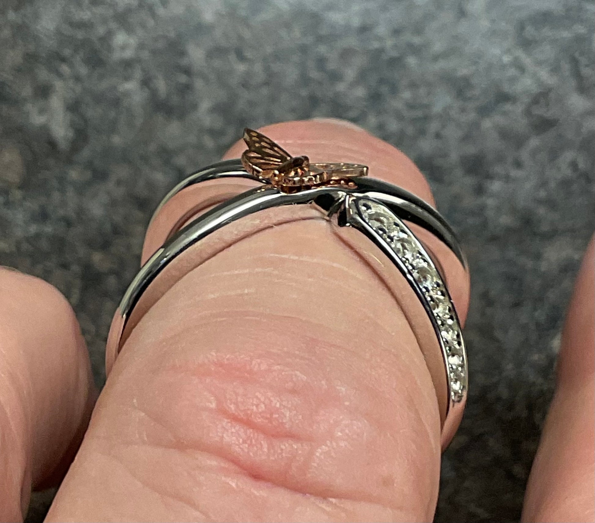 This is such a beautiful and rare Clogau ring, featuring a crossover or kiss design in sterling silver, with a gorgeous little rose gold butterfly sitting just to the left of where the two bands cross. One of the shoulders is set with lovely sparkling white topaz stones. Whilst looking quite delicate, this ring weighs a substantial 5.83g, with the bands feeling very sturdy. It’s supposed to be a size P but you can see from the ring sizer that the centre of the ring sits at around a size O1/2. Due to the split, it measures 1.5cm wide along the finger. I think it would make a fabulous thumb ring! The inner band has all the expected Clogau stamps and hallmarks. It’s in excellent condition, I can’t see any wear with the naked eye but there are small surface marks in places under the magnifying loupe. It will come in a Clogau box with Clogau cleaning cloth.
