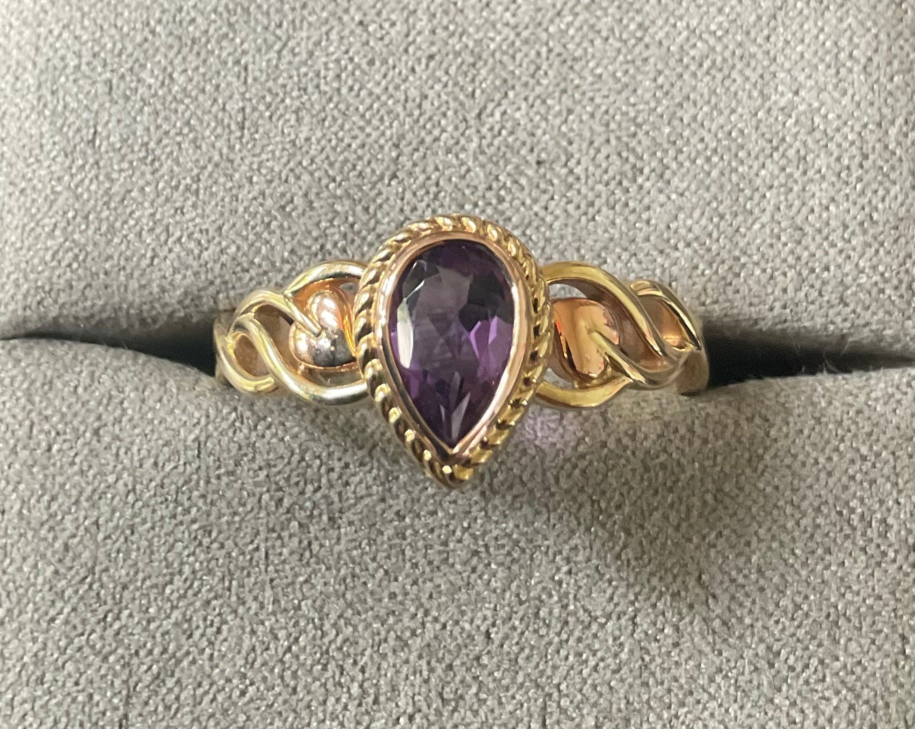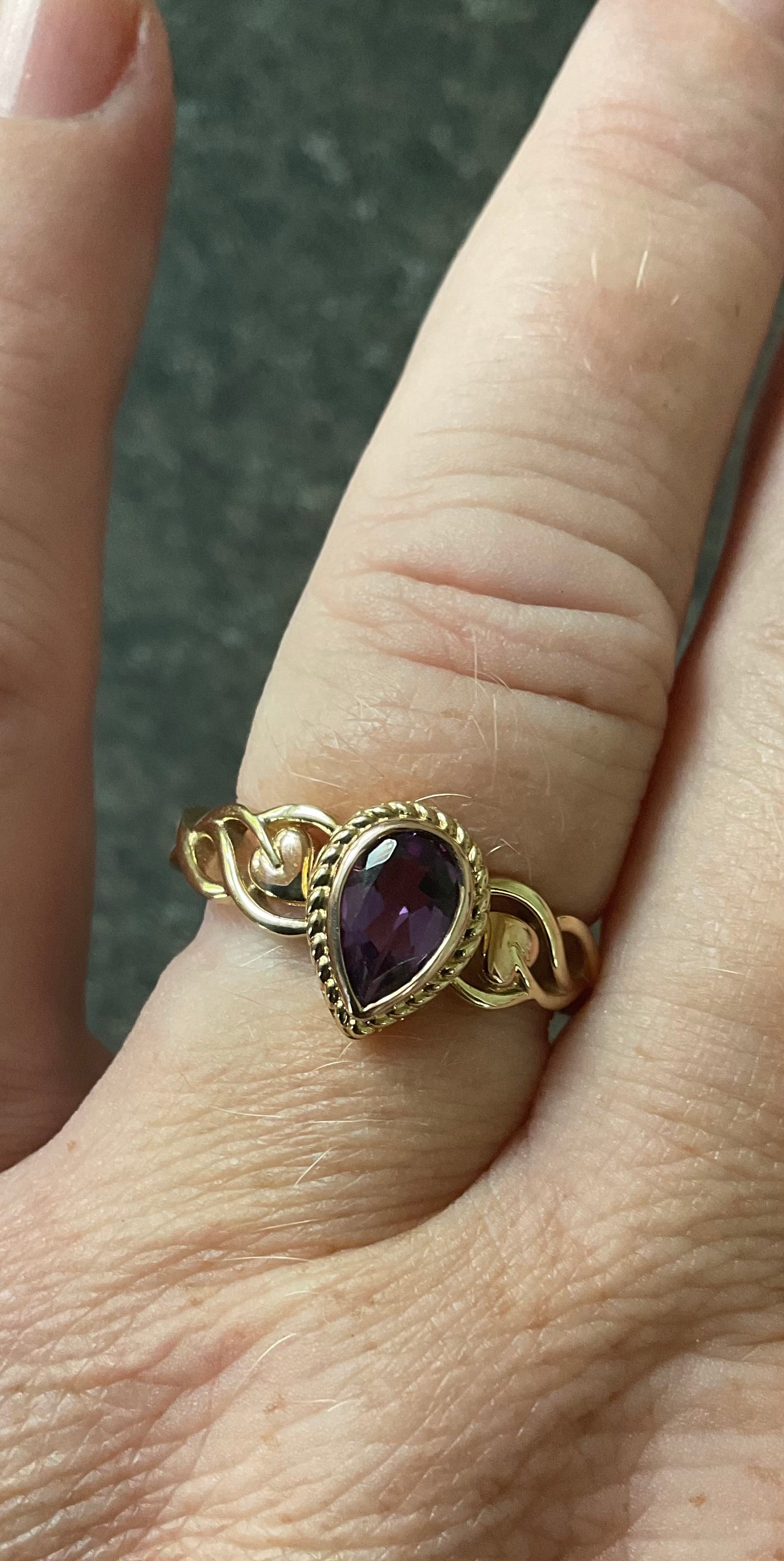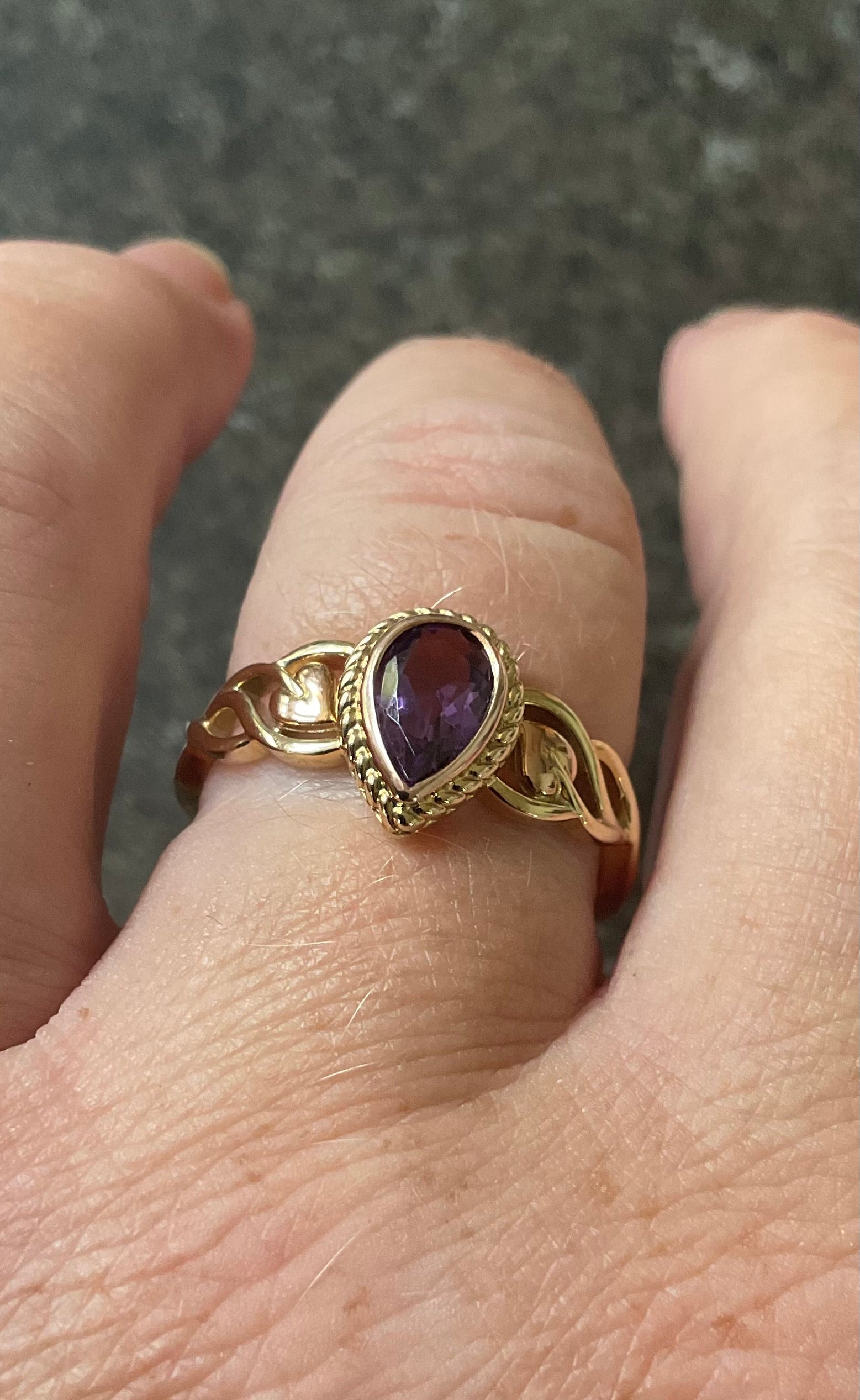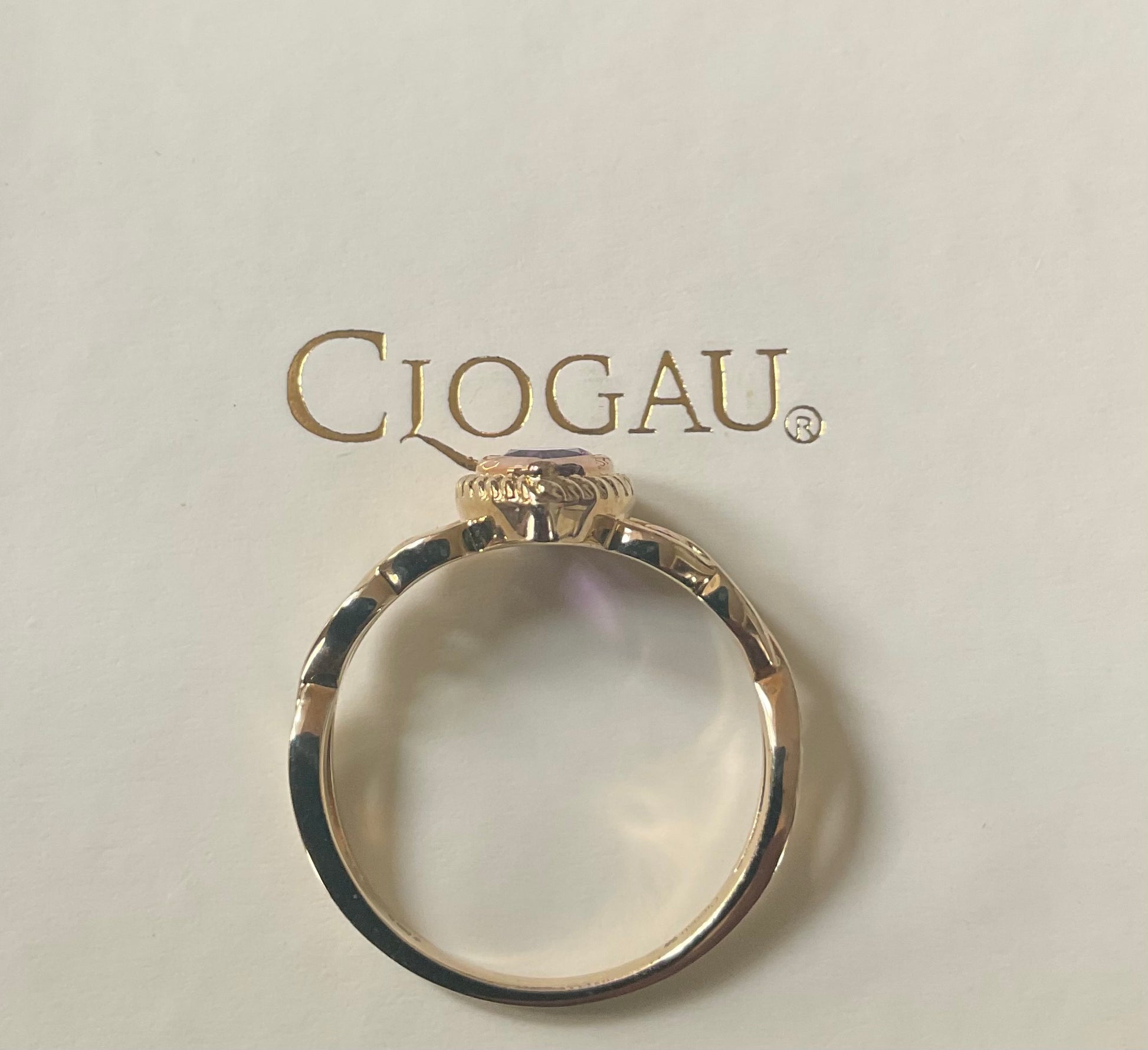 This 9ct Royal Clogau Delphinium Amethyst ring is absolutely stunning! The star of the show is the central pear cut Delphinium purple 8x5mm Amethyst stone. This is bezel set into a band of rose gold, which is surrounded by a rope of yellow gold. Each shoulder has flowing yellow gold vines, entwined around a rose gold leaf, it’s so pretty. The ring is a size T, weighs 3.54g and has the Clogau stamp and hallmark on the inner band. It’s preloved but is in excellent condition with very small signs of wear to the surface of the band and stone that in my opinion are only visible when looking through a loupe. It will come in a white Clogau box. This ring is still available to purchase from Clogau at £600.