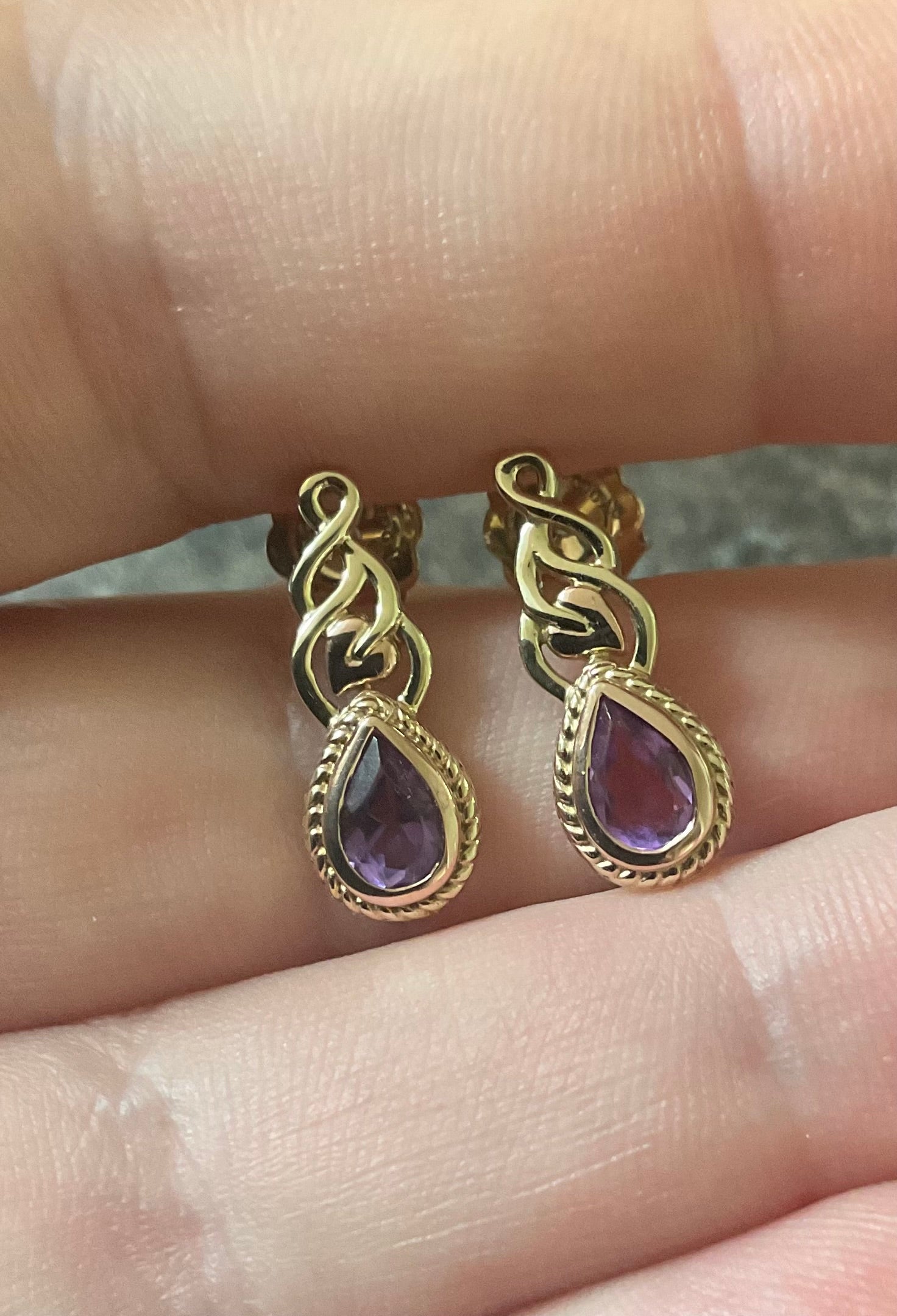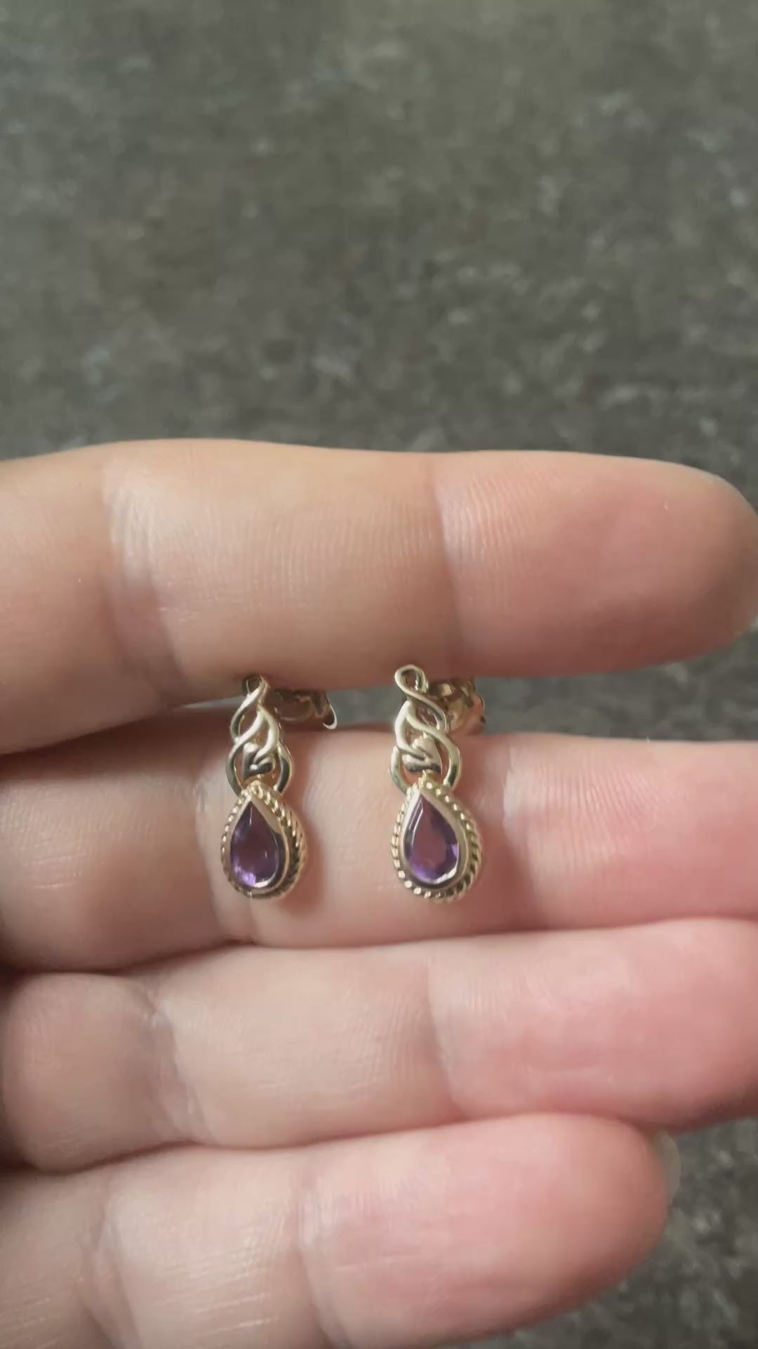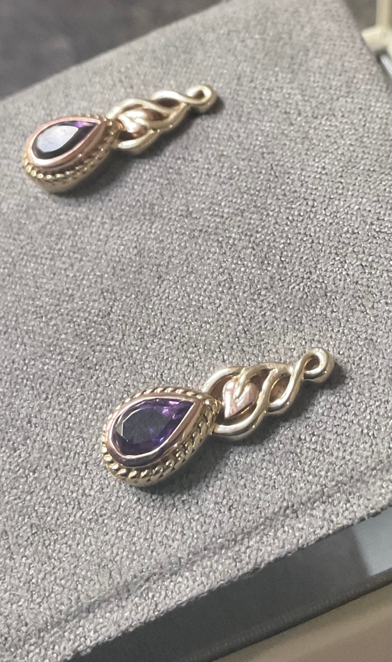These absolutely beautiful Royal Clogau 9ct gold earrings feature a gorgeous Delphinium purple pear cut 6x4mm Amethyst stone, bezel set into a band of rose gold and then surrounded by a rope of yellow gold. Sitting above this is a cascade of solid yellow gold vines with a rose gold leaf nestled in the middle. The earrings measure 1.8cm long and 7mm wide. The posts, back of the earrings and the butterflies all have the expected Clogau stamps and 9ct gold hallmarks on. They are preloved but in excellent condition, I’m not sure they’ve been worn, you’d certainly need a loupe to see any wear. I’m not sure the posts are 100% straight/original angle but I’m never sure with posts and you wouldn’t notice it when wearing them at all. They will come in the white Clogau earring box. You can still buy these from Clogau for £500.
