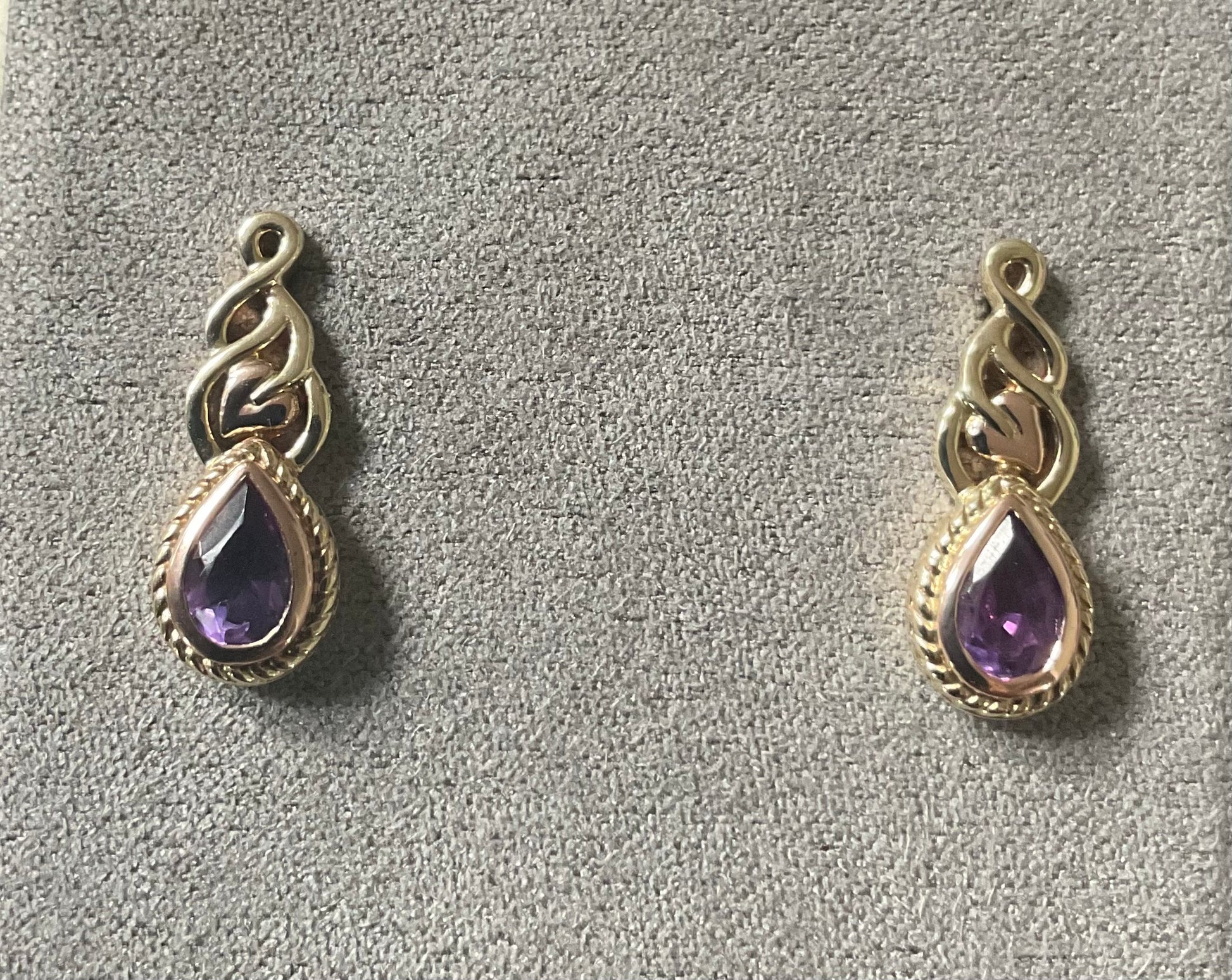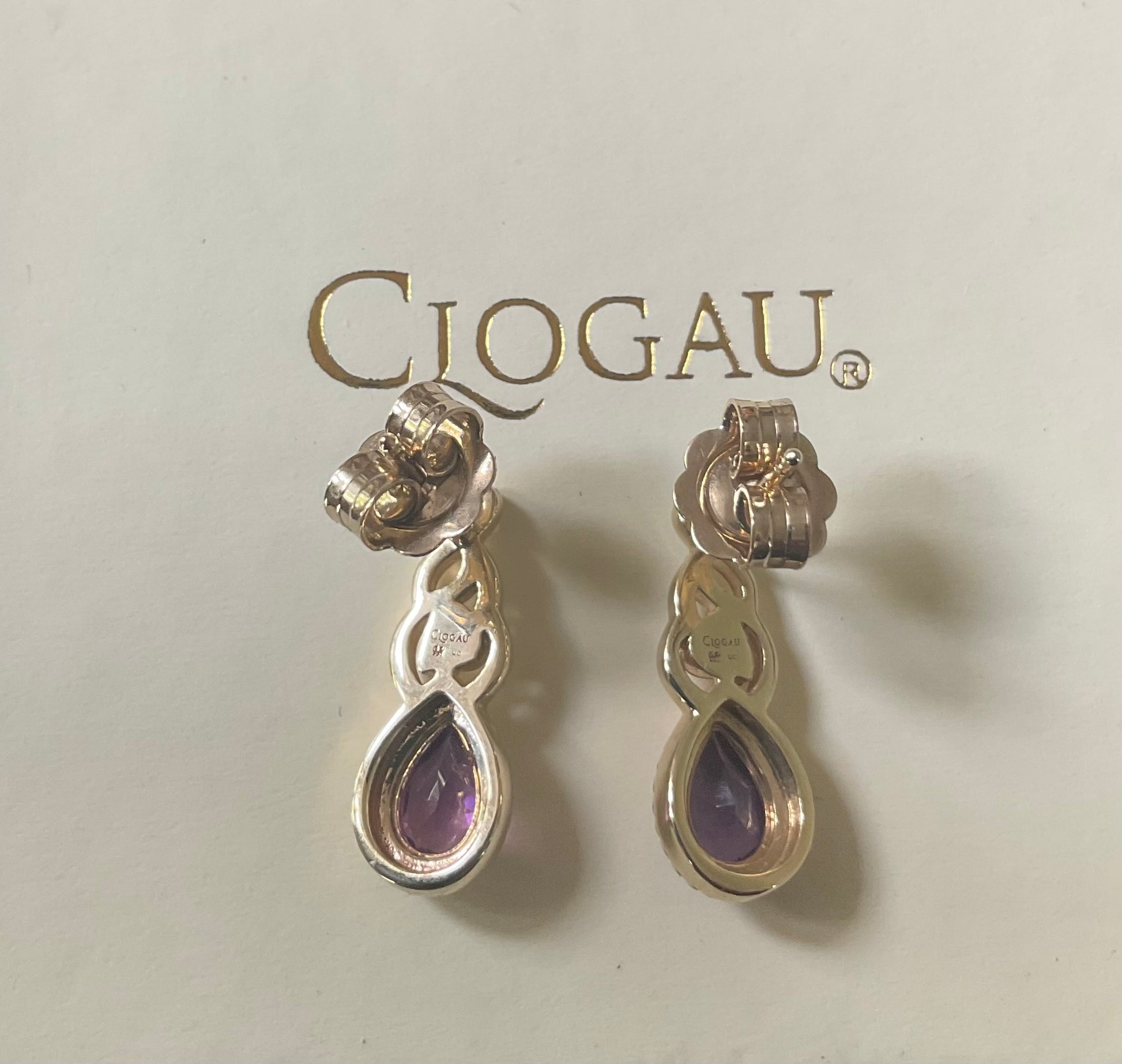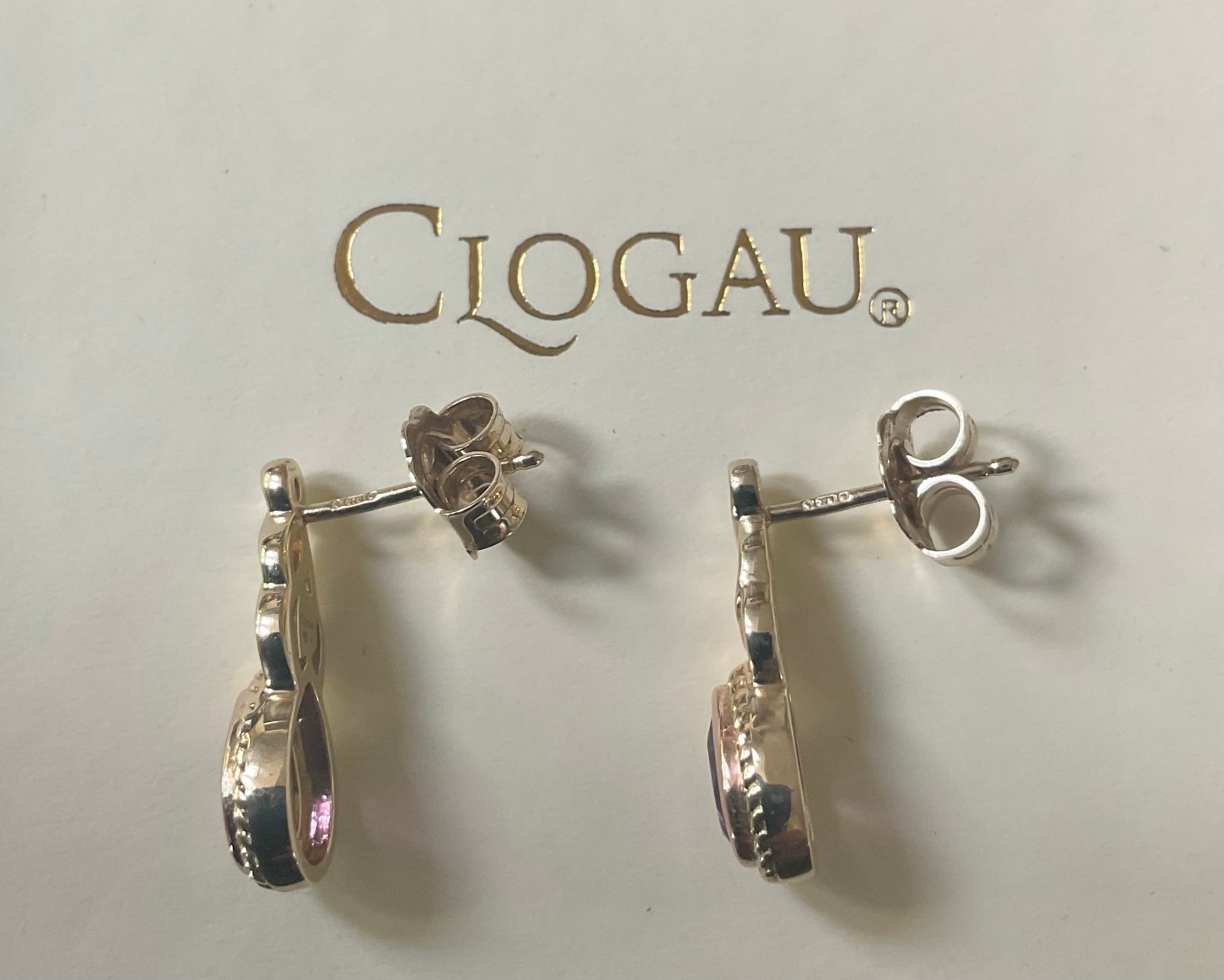 These absolutely beautiful Royal Clogau 9ct gold earrings feature a gorgeous Delphinium purple pear cut 6x4mm Amethyst stone, bezel set into a band of rose gold and then surrounded by a rope of yellow gold. Sitting above this is a cascade of solid yellow gold vines with a rose gold leaf nestled in the middle. The earrings measure 1.8cm long and 7mm wide. The posts, back of the earrings and the butterflies all have the expected Clogau stamps and 9ct gold hallmarks on. They are preloved but in excellent condition, I’m not sure they’ve been worn, you’d certainly need a loupe to see any wear. I’m not sure the posts are 100% straight/original angle but I’m never sure with posts and you wouldn’t notice it when wearing them at all. They will come in the white Clogau earring box. You can still buy these from Clogau for £500.