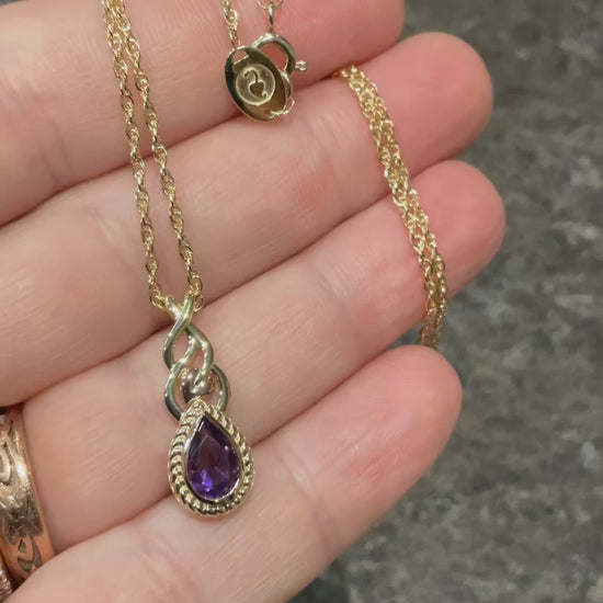 This stunning Clogau necklace features a beautiful 8x5mm pear cut Delphinium purple amethyst gemstone, bezel set into a surrounding rose gold band and then surrounded by a rope of yellow gold. Above the stone is a twisting vine of yellow and rose gold. The pendant measures 23mm long by 9mm wide and has the Clogau stamps on the back. It is set on a gorgeous, sparkling 9ct yellow gold twist chain, that can be worn at 18, 20 or 22” and has the little tag with the Clogau stamps and the gold hallmark. This necklace is in new condition, having only been taken out of the box for these photos. It comes in a white Clogau box with a Clogau cleaning cloth. It retails at £600, so this is a great price! I am also selling the matching earrings in my other items.
