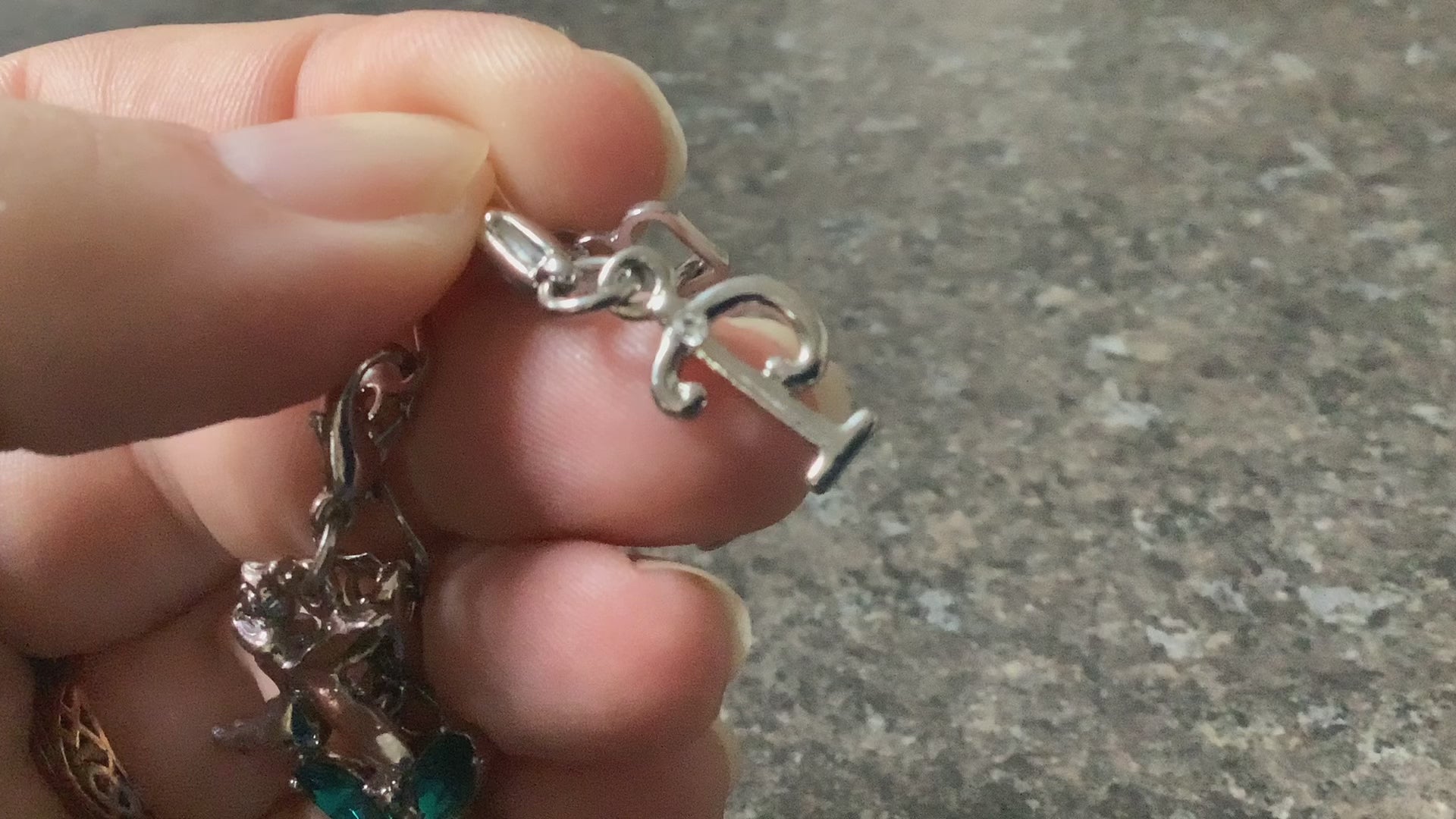 This is a really pretty bracelet that has got some weight to it, it’s nice quality. I don’t know what the metal is but it’s a nice bright silver tone and I can’t find any makers marks, etc. The main chain is made up of little heart links with a heart t-bar fastening and measures about 18cm in length. Then you have the 10 little charms that can be removed due to their lobster claw clasps, so you could wear the bracelet by itself with no charms, with all the charms or any combination of the charms, making it a very versatile bracelet. It’s in good preloved condition but a couple of the little clear stones are missing. This isn’t very noticeable at all when wearing it.