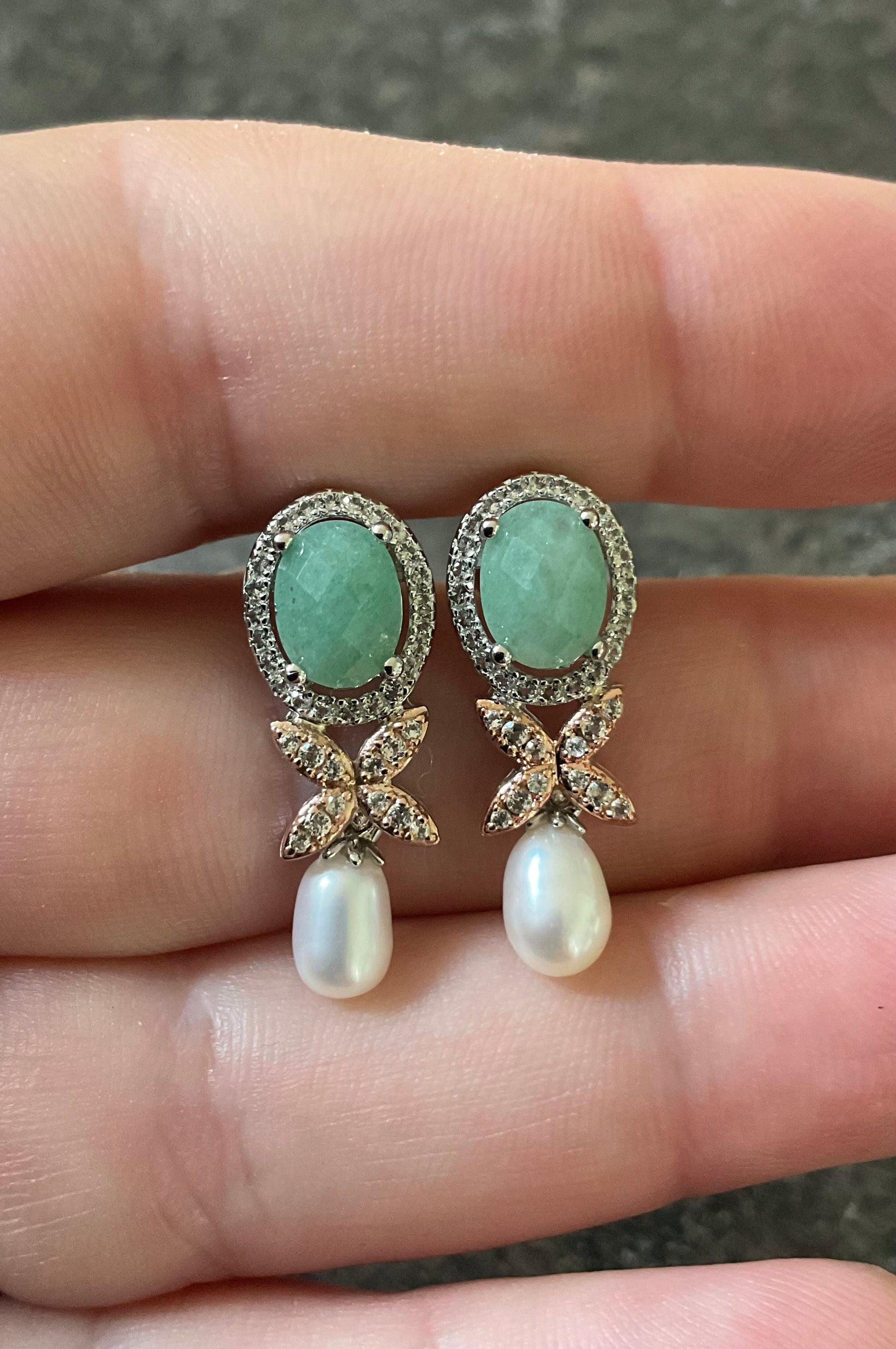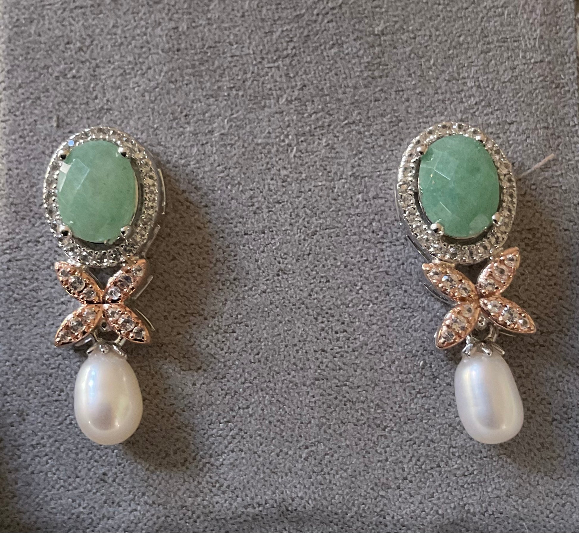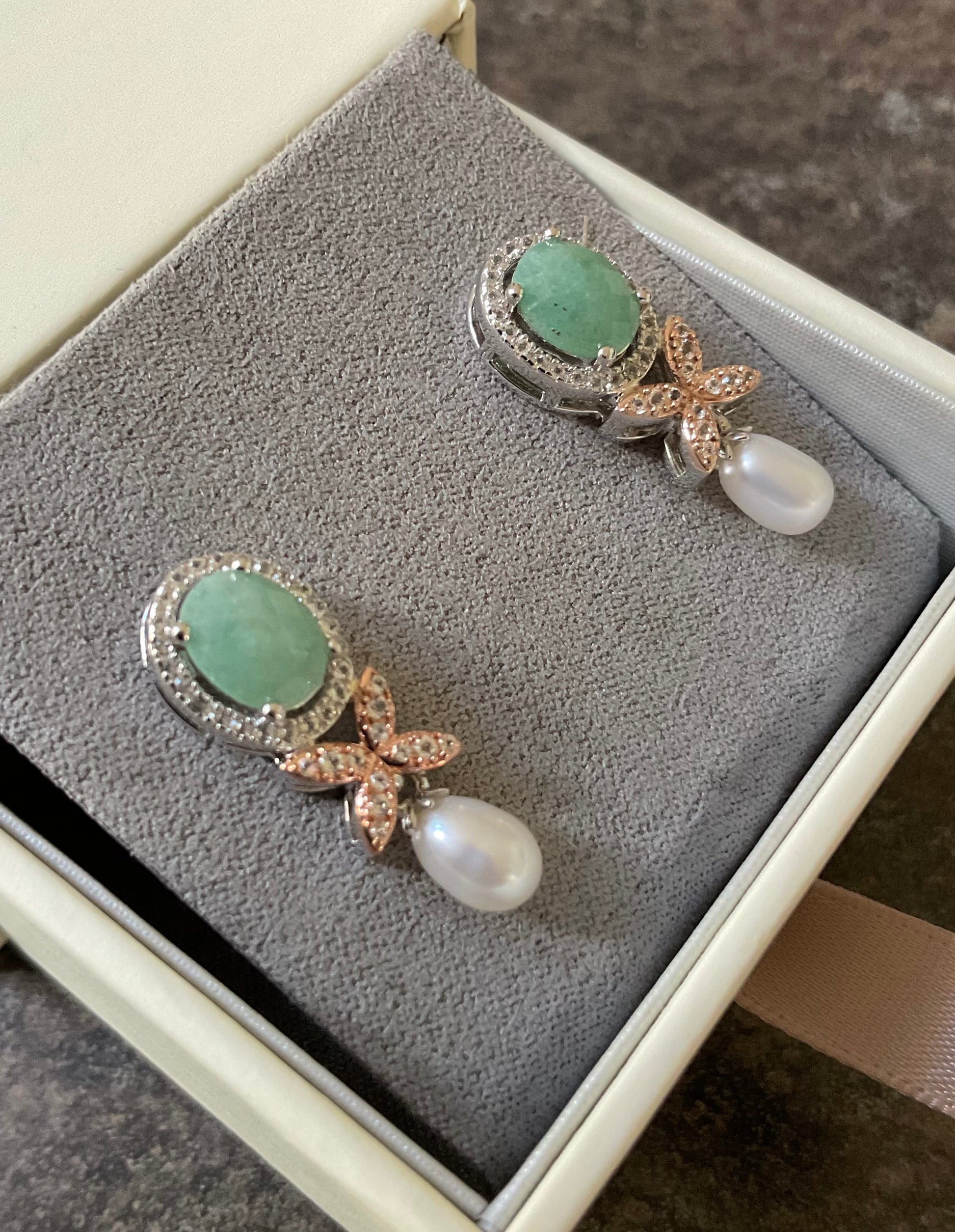 These earrings are absolutely stunning and retailed at £330! They feature an 8x6mm green Aventurine stone, surrounded by sparkling white topaz, in an oval halo design. Below this are more white topaz, set into a rose gold flower and dangling from this is a tear drop pearl. In total they measure 2.5cm in length and 1cm wide. They are brand new and have only been taken out of the box for these photos. They come in the new box shown, with the Clogau cleaning cloth. I have these same earrings in the London Blue Topaz version and the Amethyst version, all now discontinued by Clogau.