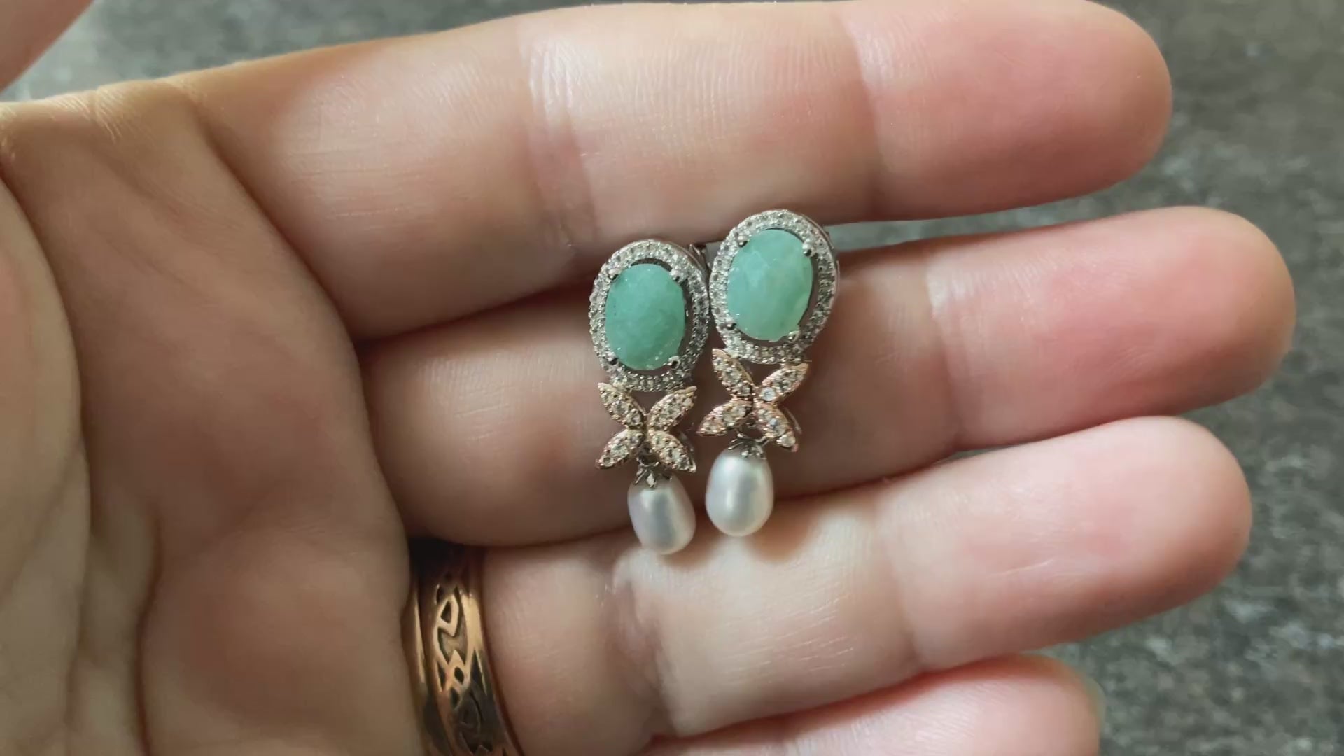 SUPERBLOOM Clogau Aventurine and Pearl drop earrings with white topaz in silver and rose gold