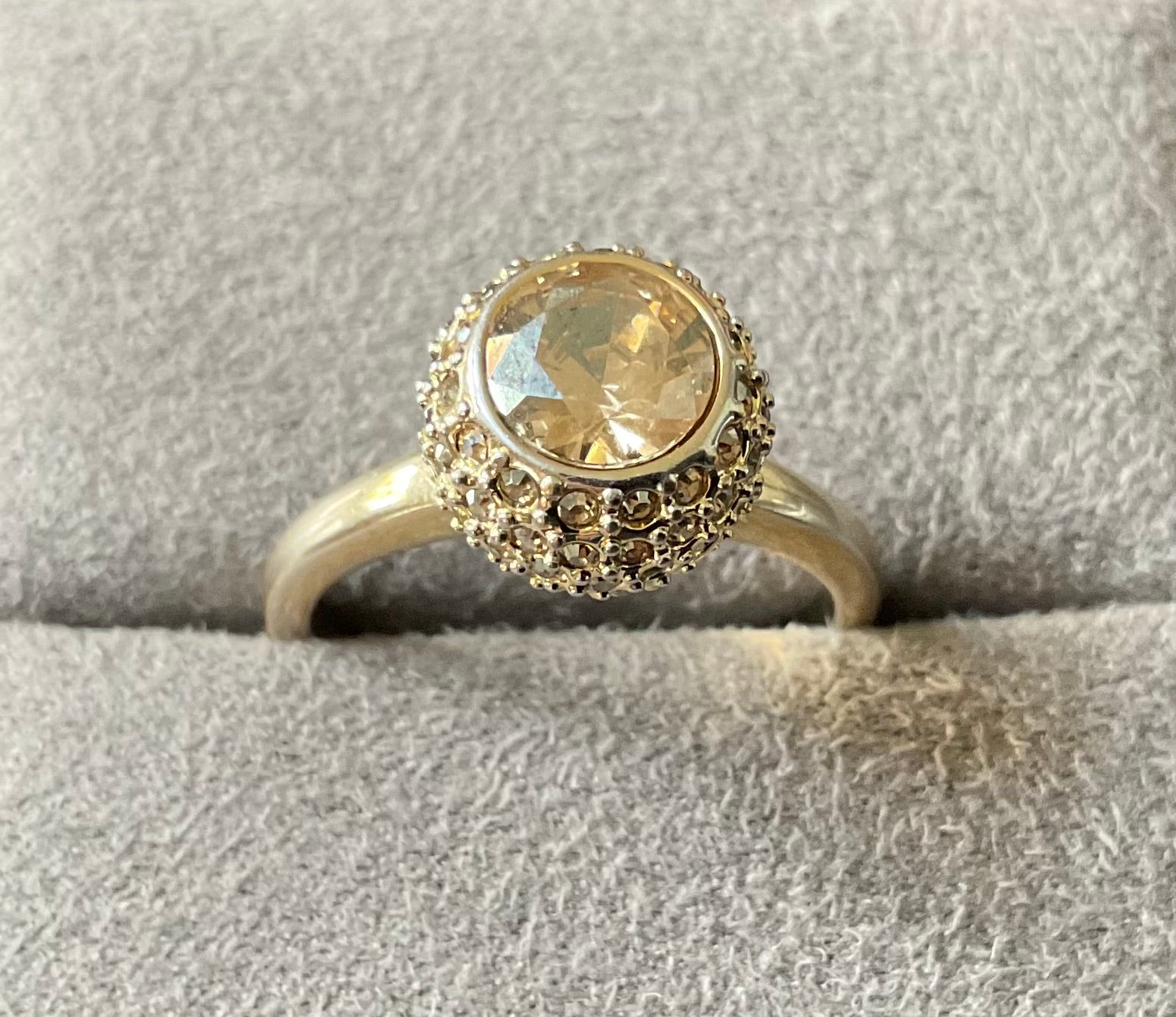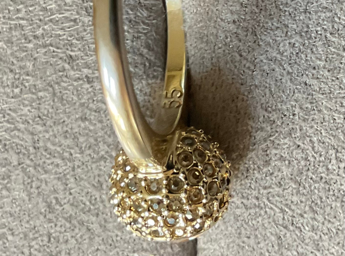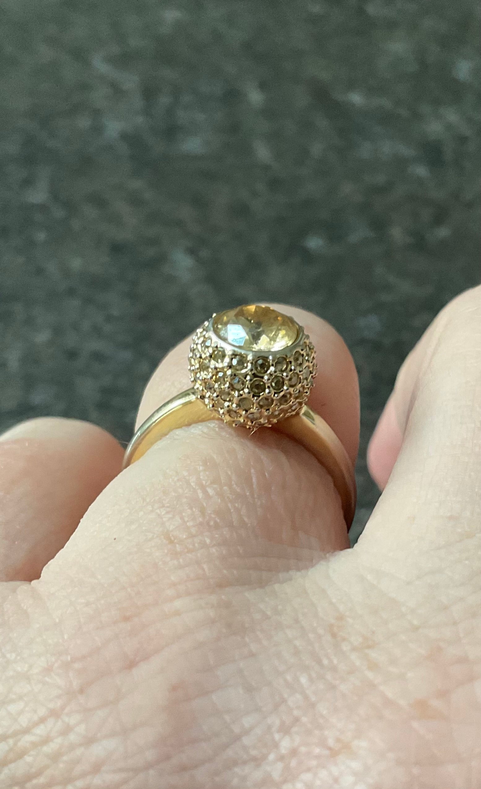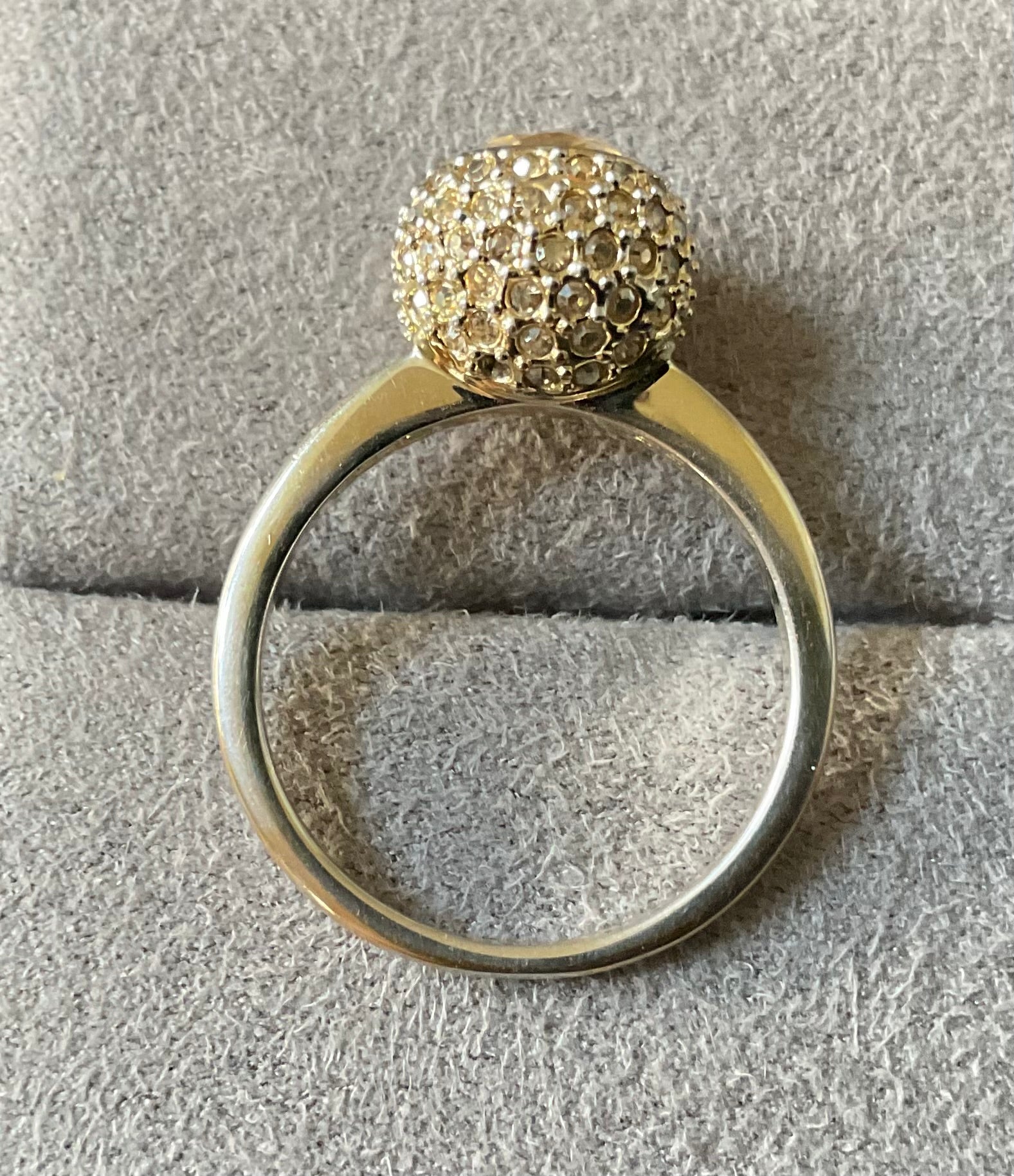 This is such a pretty ring. It has the Swarovski Swan stamp inside and the size 55 which equates to an N on the ring sizer. The beautiful, sparkling pale yellow round central Swarovski crystal measures 6mm across and this is surrounded by a ball of smaller pale yellow crystals. Unfortunately some of these are missing, although this isn’t too obvious when you are wearing the ring, unless you are looking for them. The ring is yellow gold plated but this plating is fading away to giving a mix of gold and silvery appearance. It’s still a very pretty ring and has been greatly reduced in price because of these issues. It will come in a black box (not branded).
