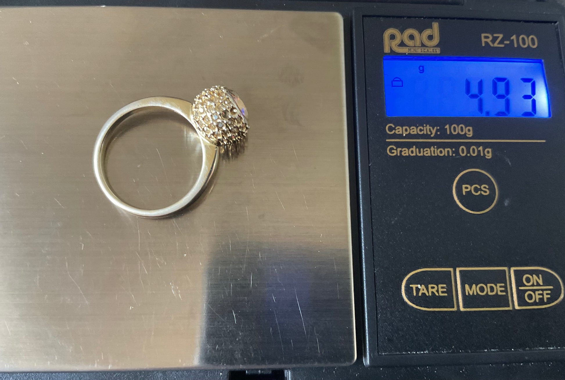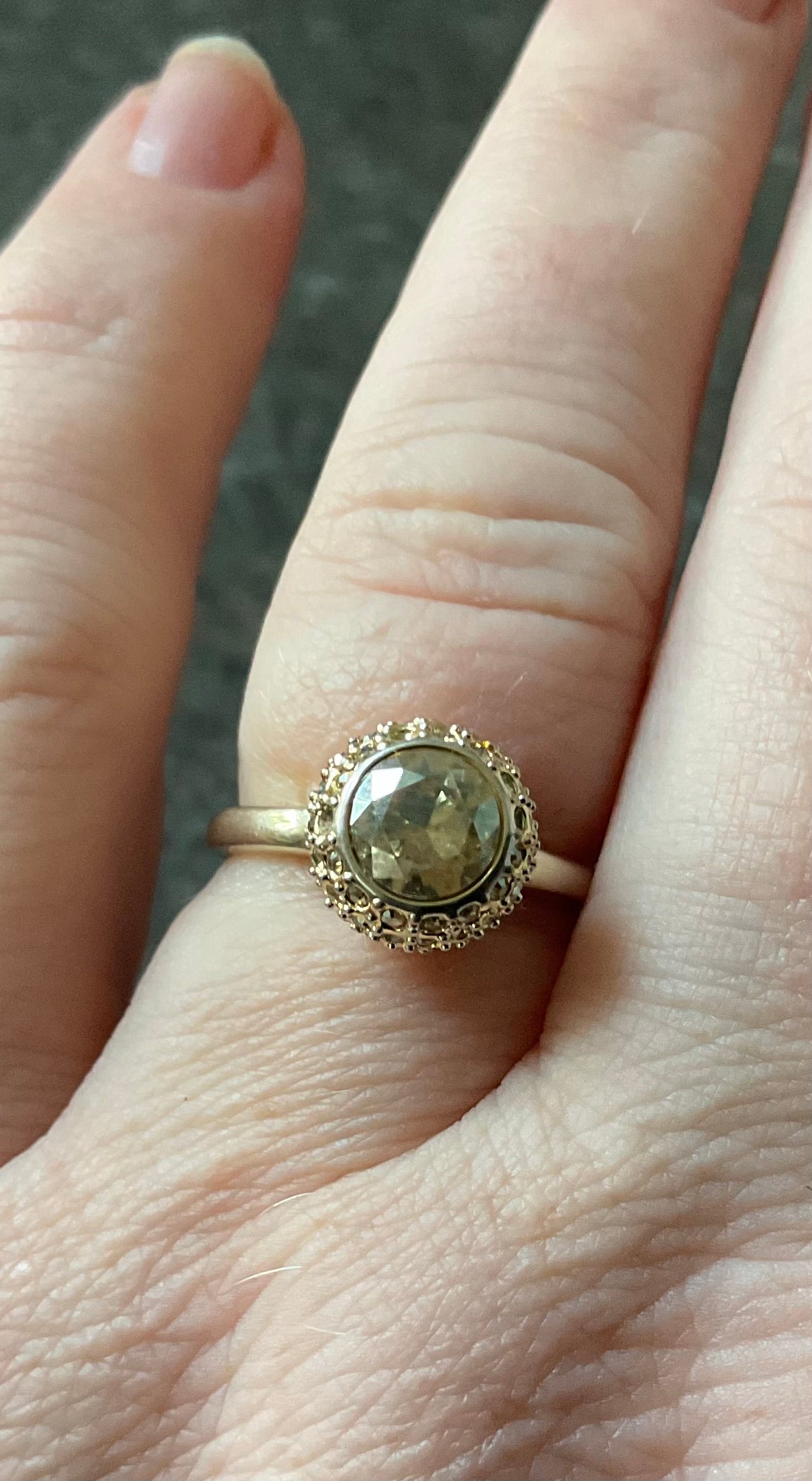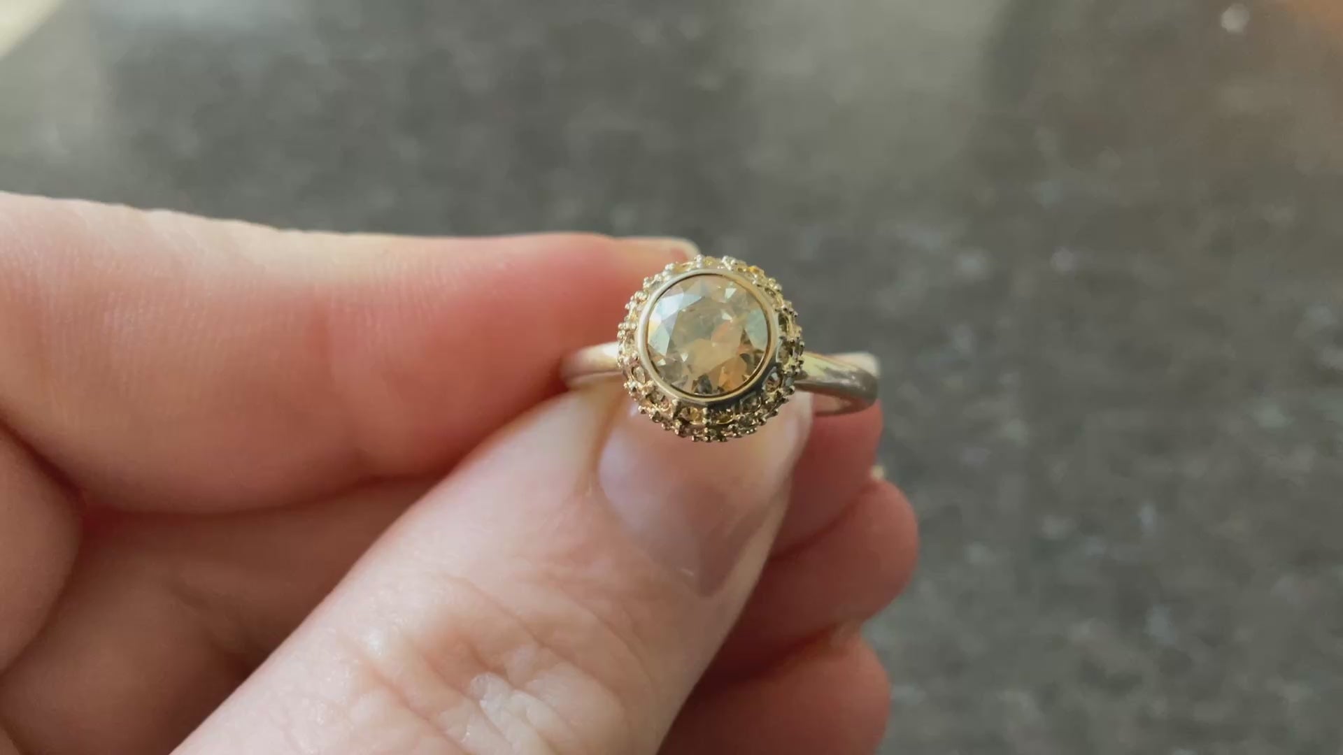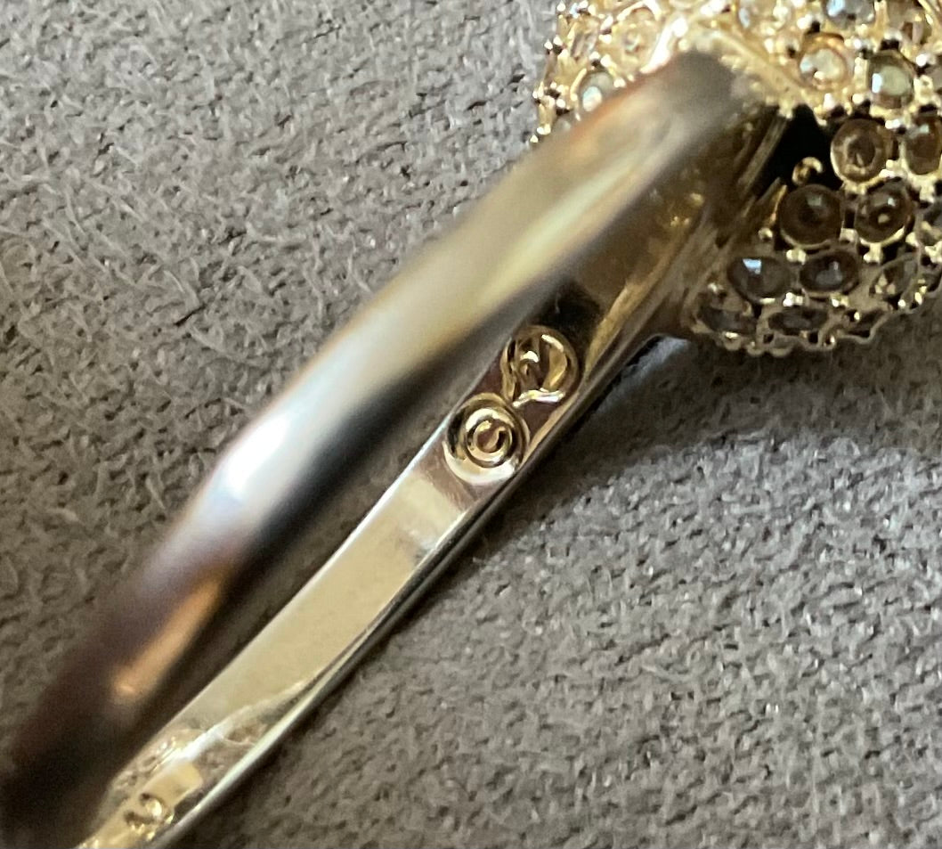 This is such a pretty ring. It has the Swarovski Swan stamp inside and the size 55 which equates to an N on the ring sizer. The beautiful, sparkling pale yellow round central Swarovski crystal measures 6mm across and this is surrounded by a ball of smaller pale yellow crystals. Unfortunately some of these are missing, although this isn’t too obvious when you are wearing the ring, unless you are looking for them. The ring is yellow gold plated but this plating is fading away to giving a mix of gold and silvery appearance. It’s still a very pretty ring and has been greatly reduced in price because of these issues. It will come in a black box (not branded).