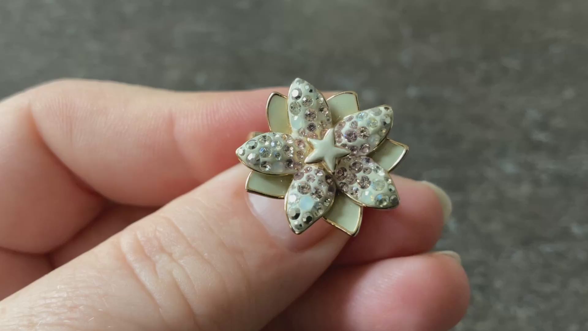 This is such a pretty ring. It has the Swarovski Swan stamp inside and the size 58 which equates to a P1/2 on the ring sizer. The enamel petals look creamy in some lights and a pale green in others. The other petals are covered in beautiful, sparkling Swarovski crystals. Unfortunately, one of these crystals is missing (I point this out in the video) but this really isn’t noticeable when you are wearing the ring, unless you are specifically looking for it. The rest of the ring is in great preloved condition. The flower head measures 2cm across. This will come in a black box (not Swarovski).