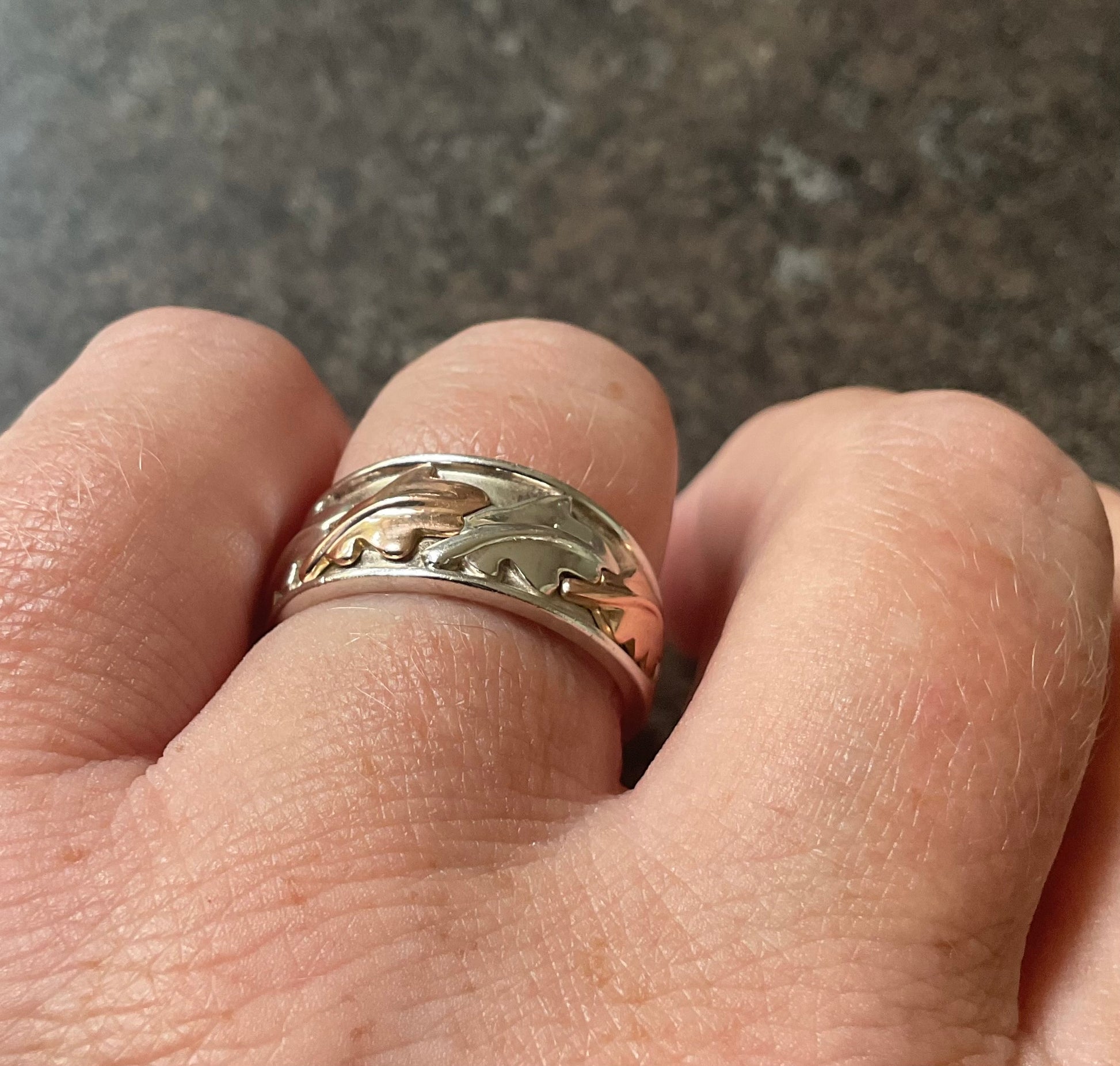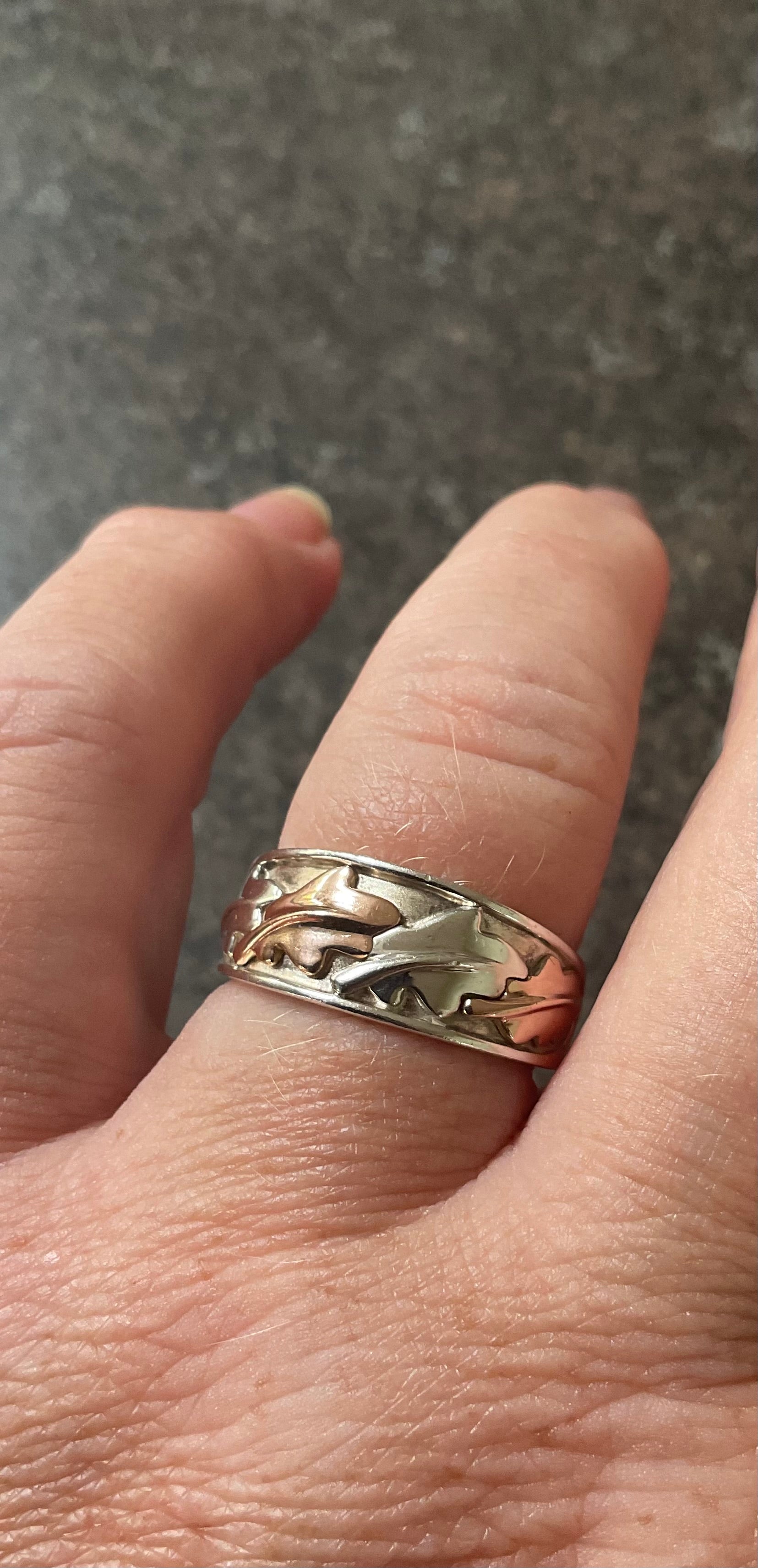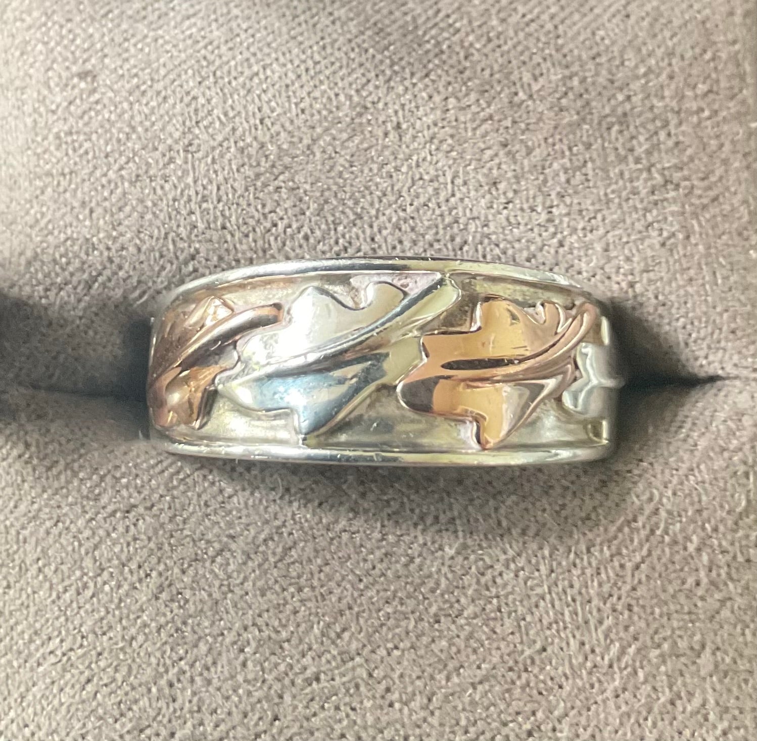 This lovely, eye catching ring would be suitable for ladies and gentlemen alike. It weighs a substantial 6.78g and measures 9mm across at the widest point. The pattern features alternating silver and rose gold large Oak leaves inlayed into the band, you don’t see this design as often. The ring is preloved and there are signs of wear and small marks to the band but it’s still a lovely, solid ring. It will come double boxed as shown.