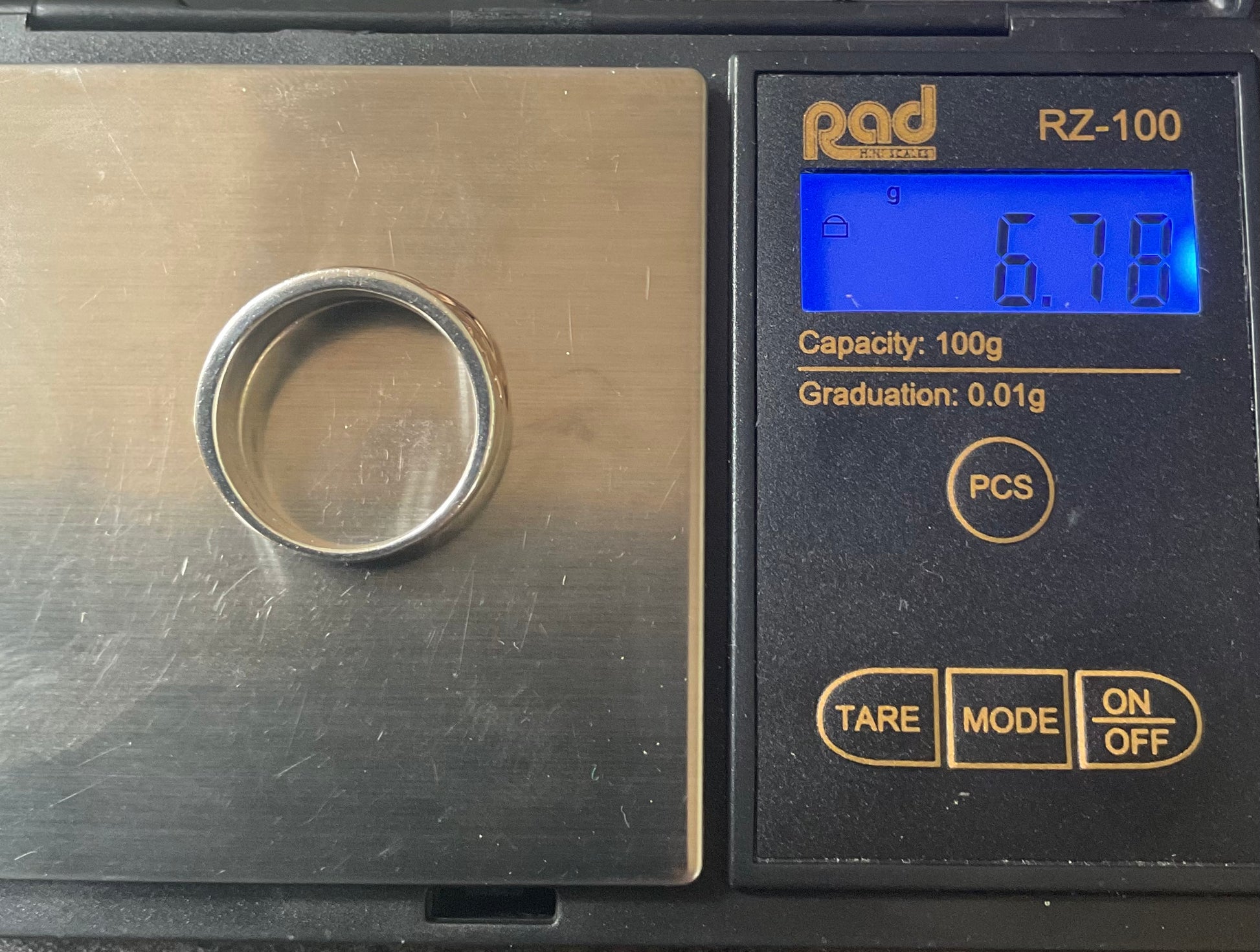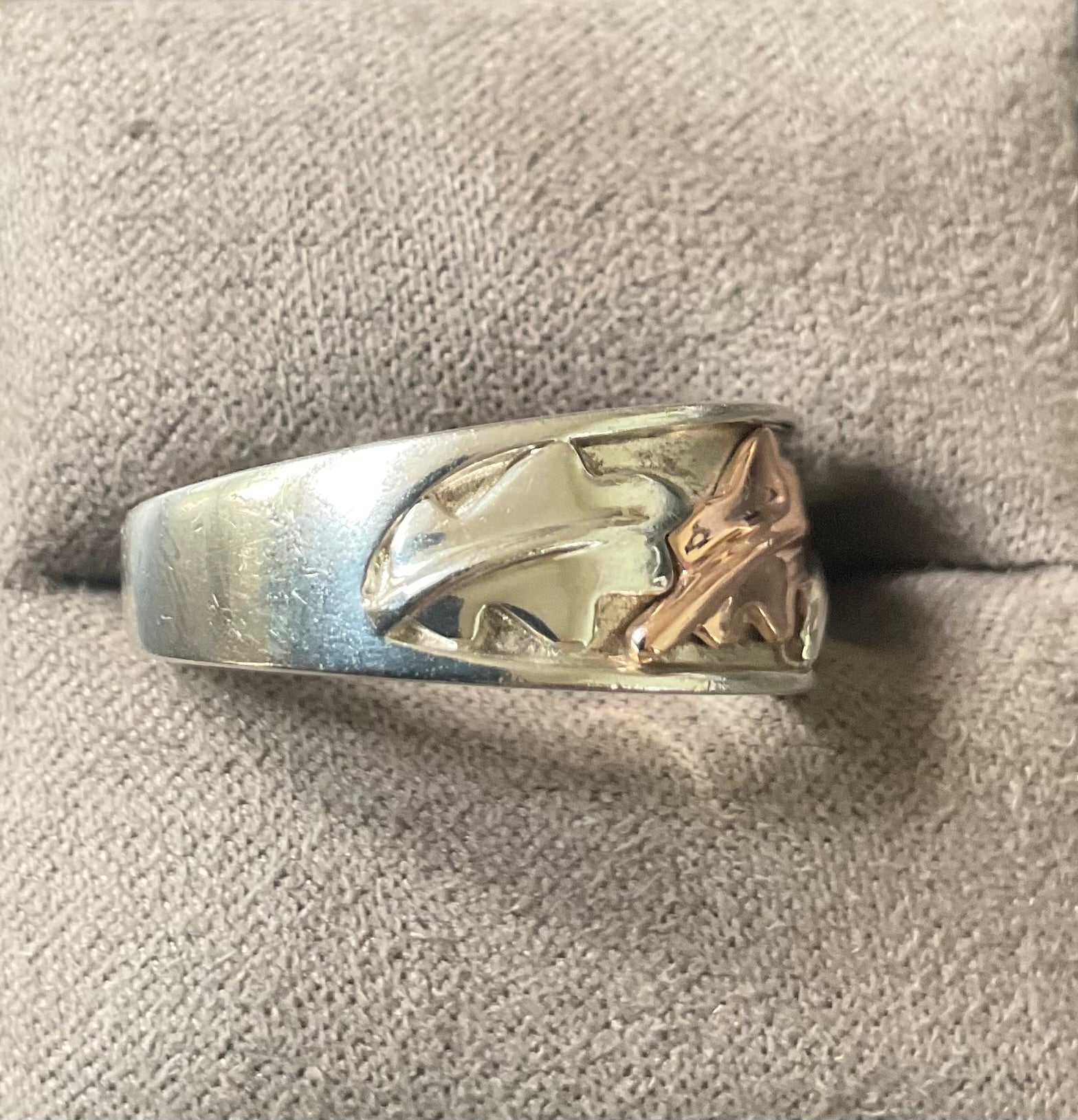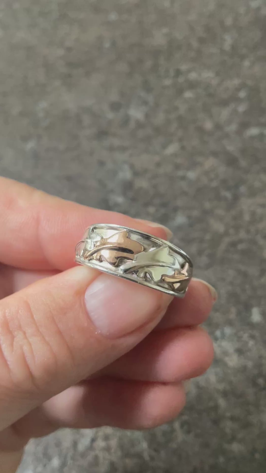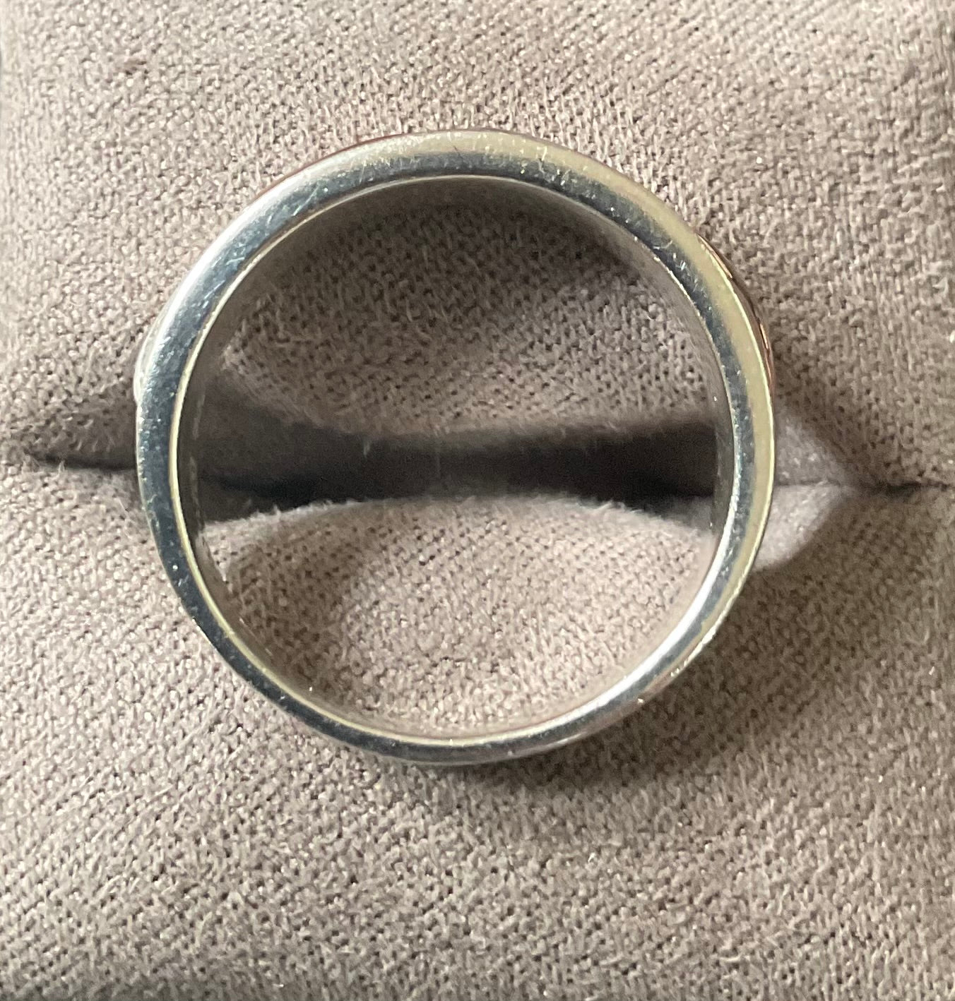 This lovely, eye catching ring would be suitable for ladies and gentlemen alike. It weighs a substantial 6.78g and measures 9mm across at the widest point. The pattern features alternating silver and rose gold large Oak leaves inlayed into the band, you don’t see this design as often. The ring is preloved and there are signs of wear and small marks to the band but it’s still a lovely, solid ring. It will come double boxed as shown.