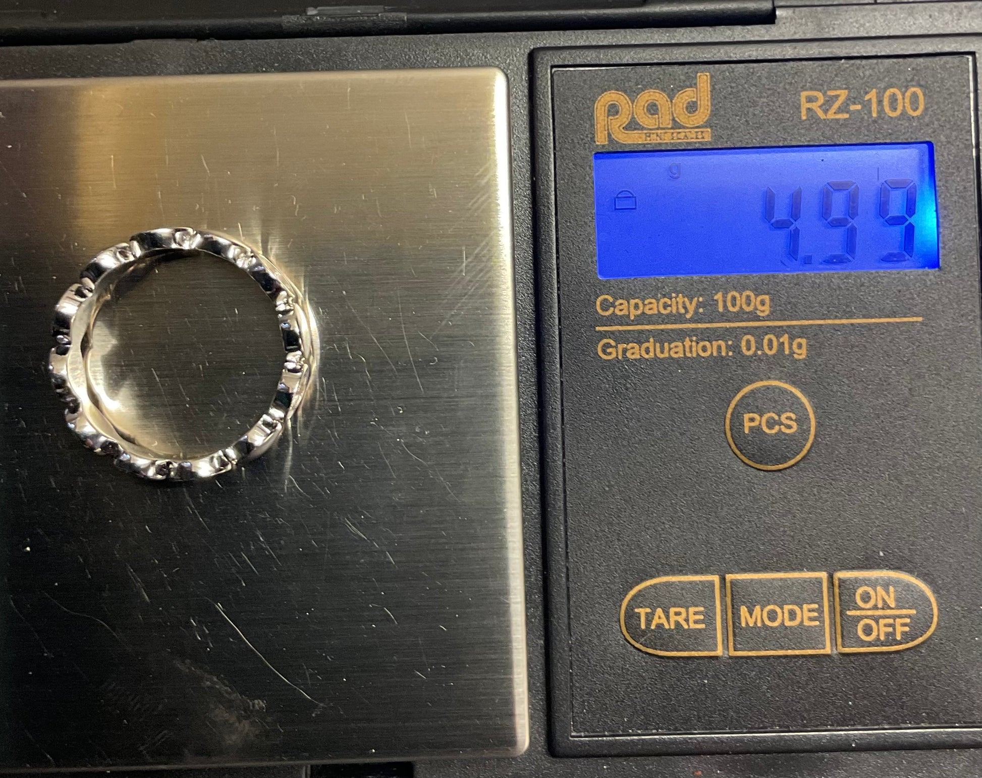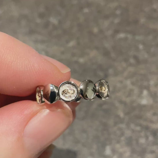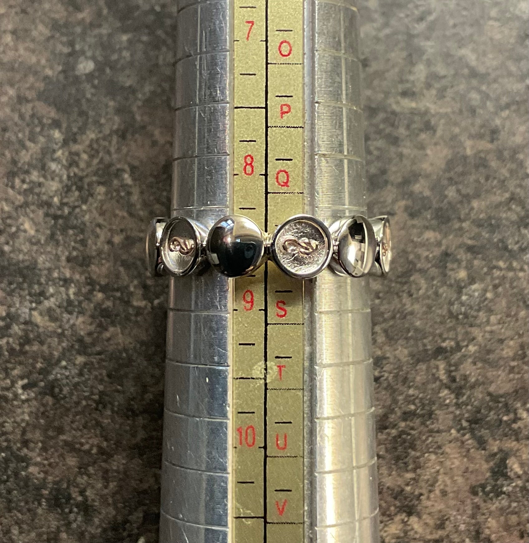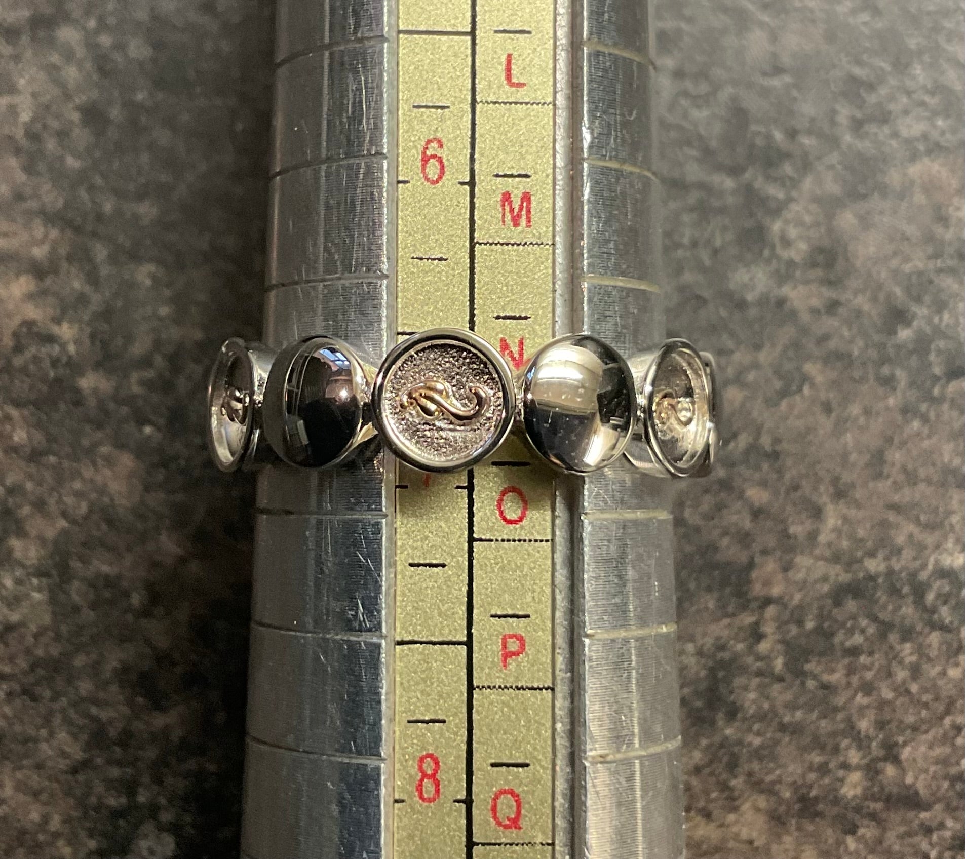 This is a very attractive Clogau ring that I believe is suitable for ladies and gentlemen alike. It features smooth polished and flattened beads of sterling silver, interspersed with silver circles inset with the rose gold Tree of Life Insignia design on a mat silver background. These 5mm beads and circles alternate all the way around the ring. The inner band has all the expected Clogau stamps and silver hallmarks. This ring comes in the Clogau box shown, with a Clogau cleaning cloth. It has only been taken out of the box for these photos, so is in excellent condition. I have this ring in a size N and R.