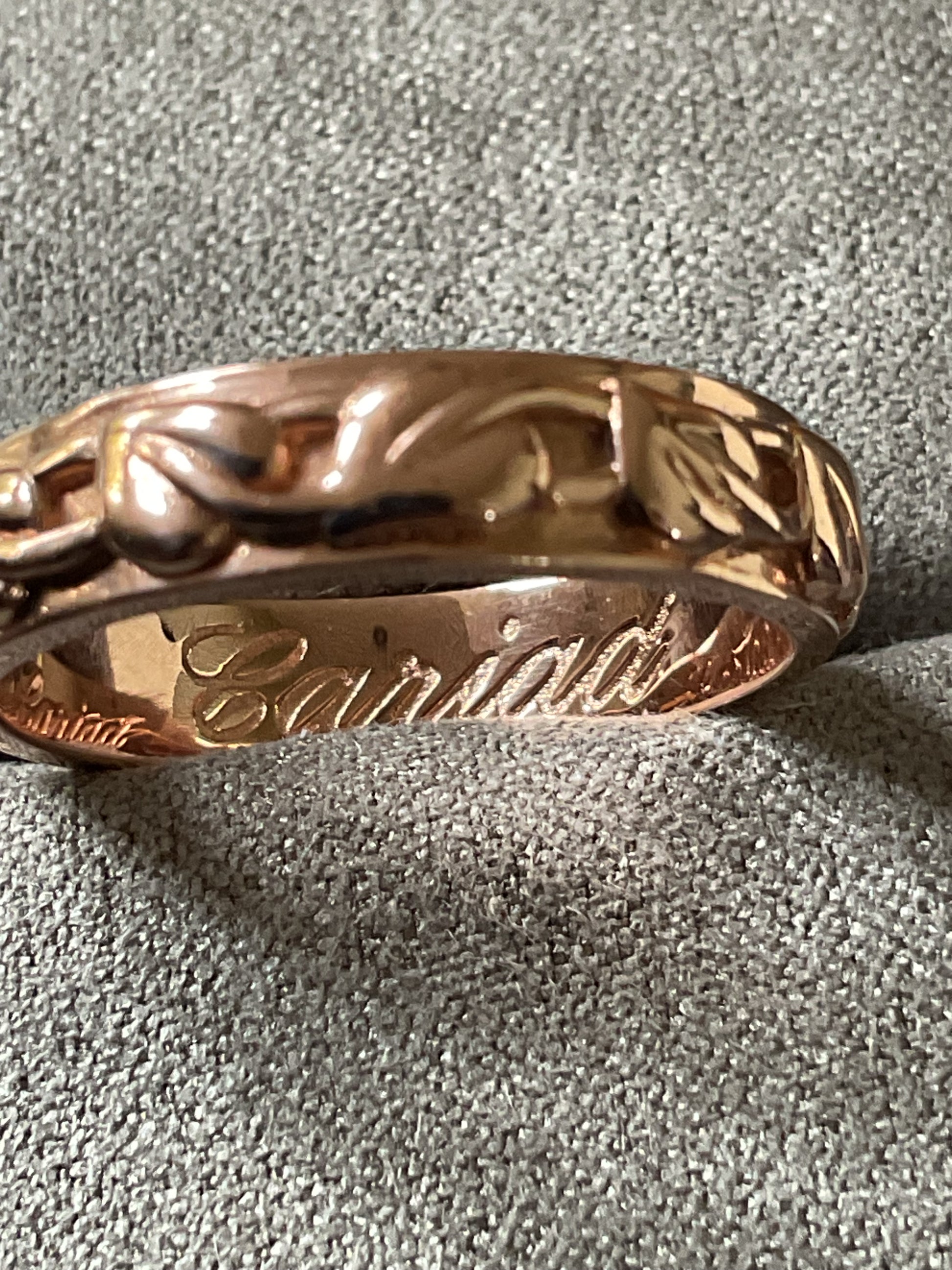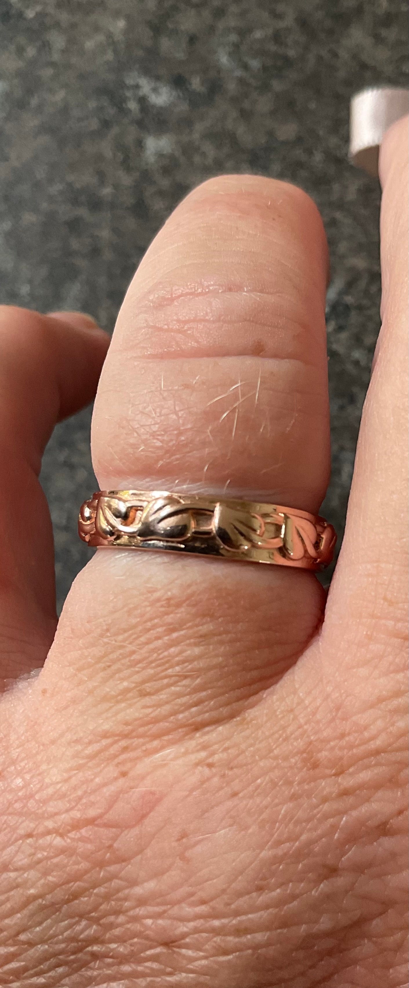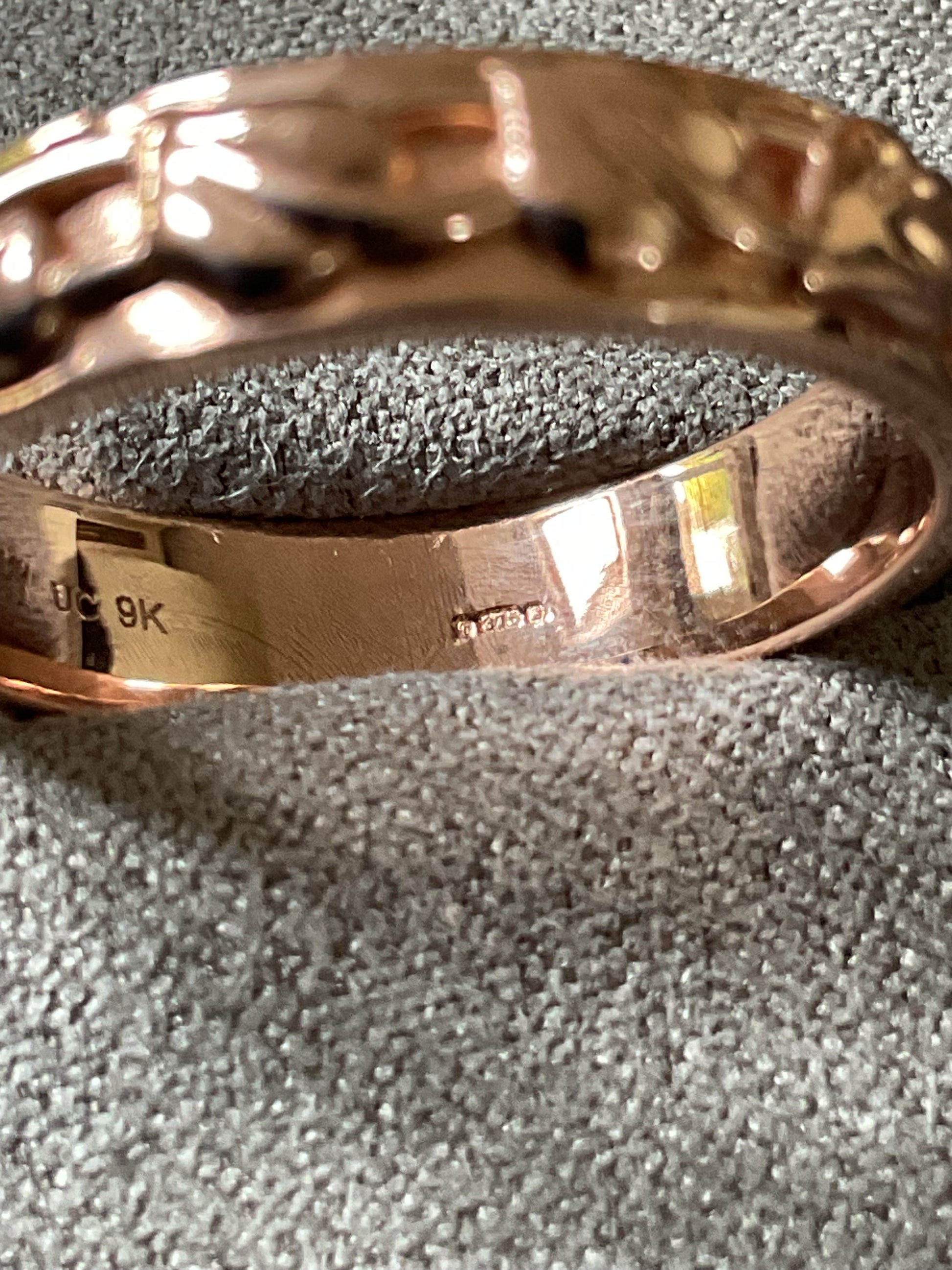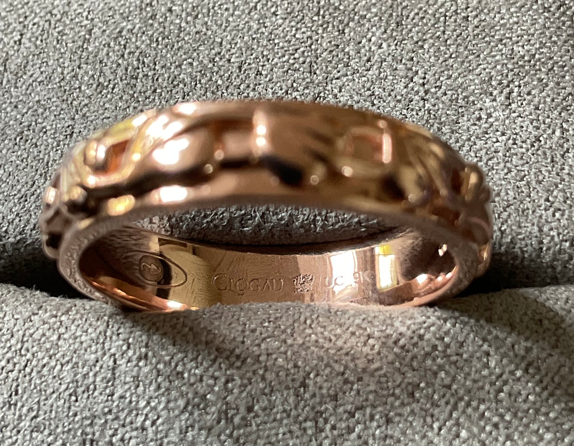 This is a lovely Clogau ring, in a warm 9ct rose gold. It has the Tree of Life pattern going all the way around. It measures 5mm across, weighs a substantial 5.05g and is a size P. I believe it is suitable for ladies and gents and would make a lovely wedding ring, stacking ring, thumb ring, anything you like! It is fully hallmarked and stamped for Clogau 9ct gold and is engraved with the Welsh word ‘Cariad’ for love. It’s in great condition with no notable signs of wear with the naked eye. When you look through a jewellers loupe, there is a sort of random pattern on the inside band and it came from Clogau like that but you can’t see it unless you use the magnifying lens. It comes in a Clogau box with a cleaning cloth.