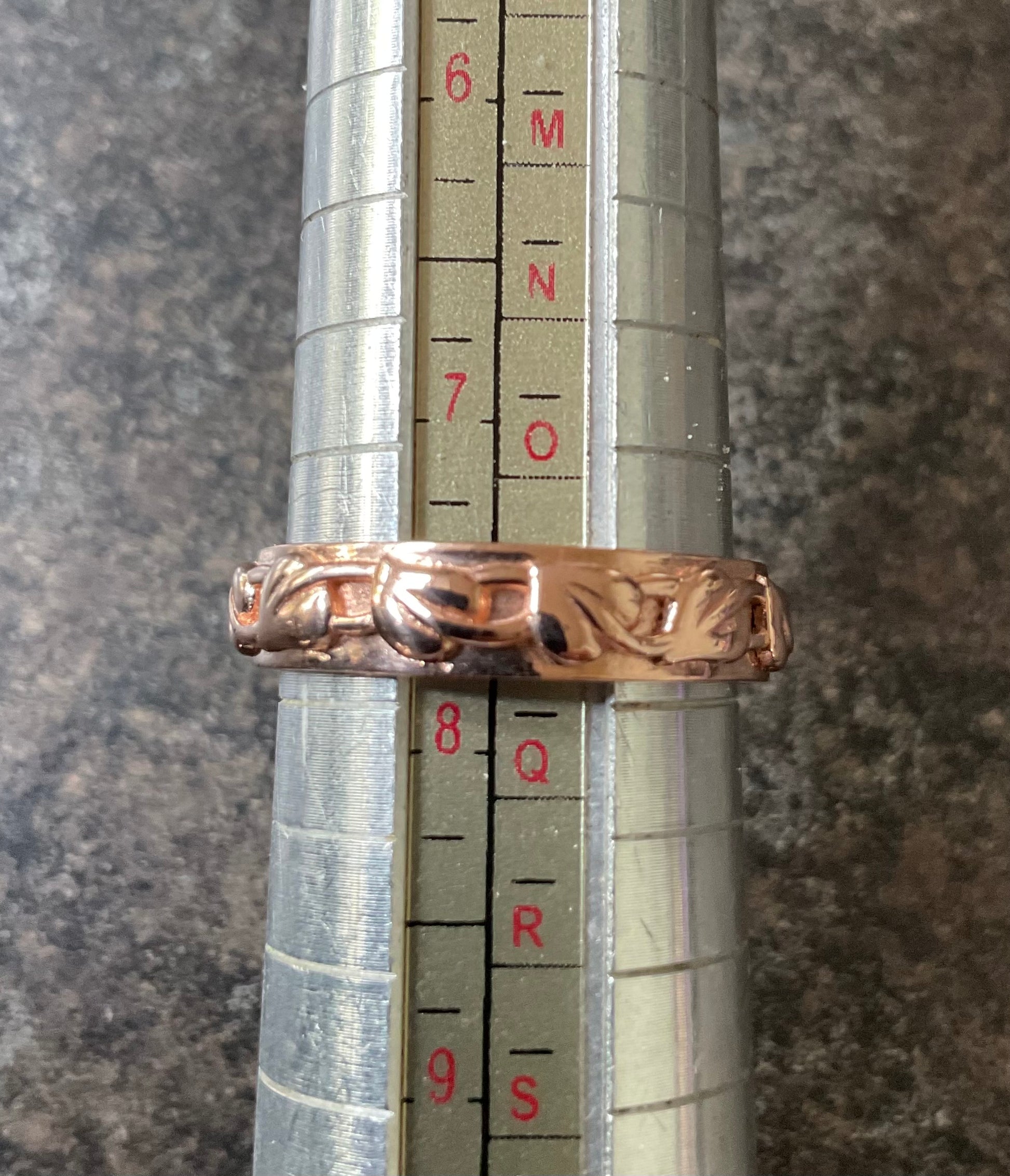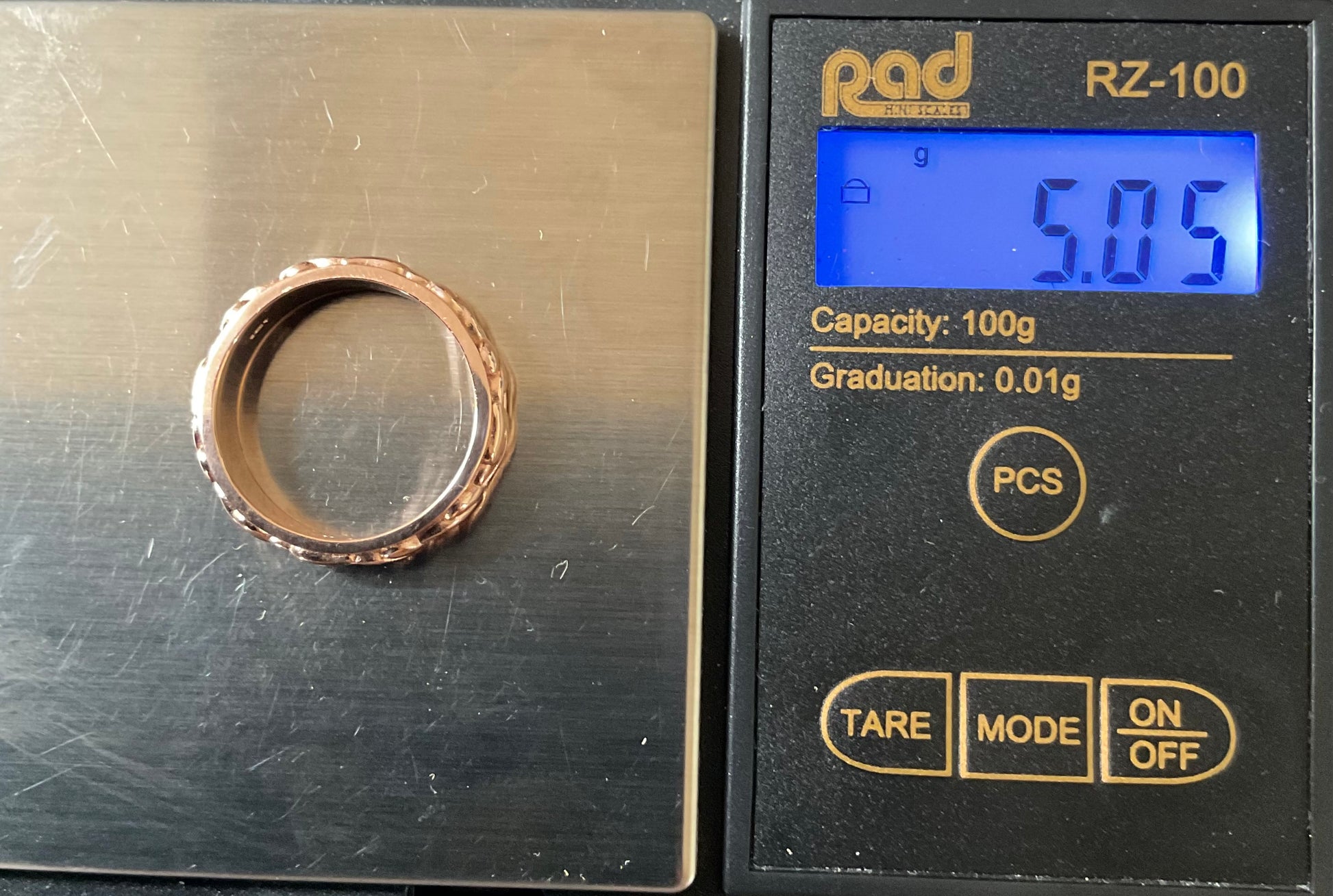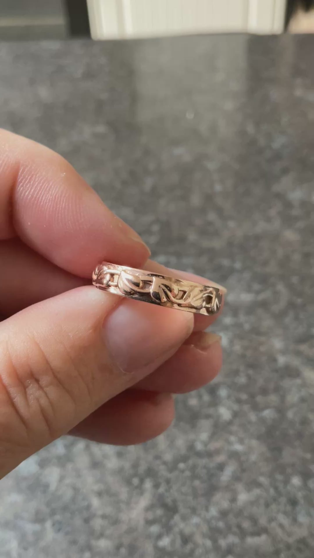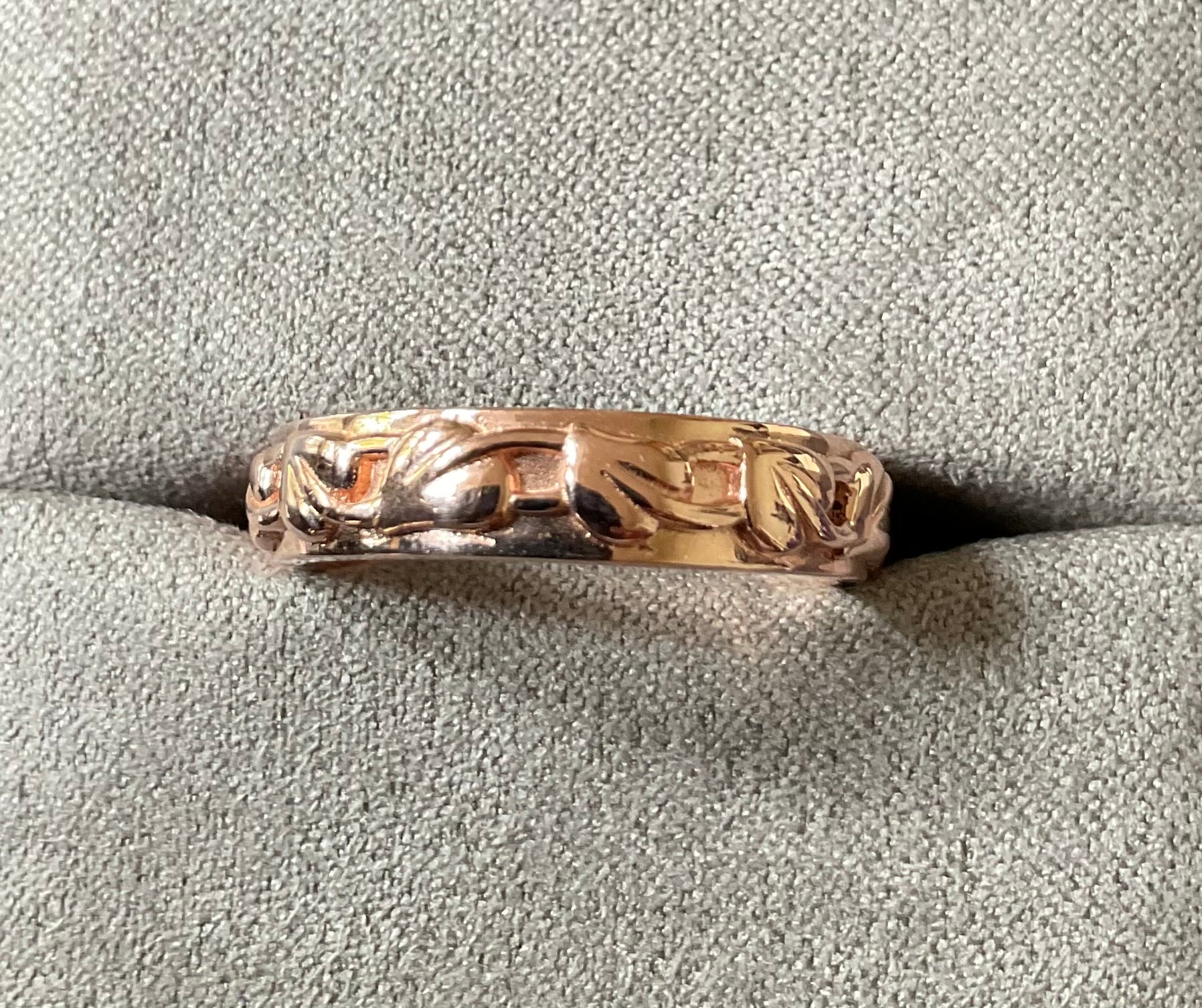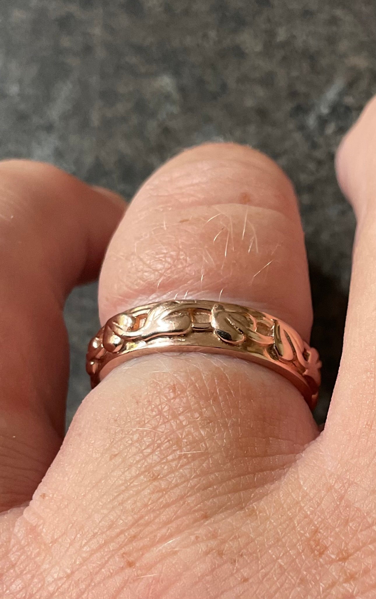 This is a lovely Clogau ring, in a warm 9ct rose gold. It has the Tree of Life pattern going all the way around. It measures 5mm across, weighs a substantial 5.05g and is a size P. I believe it is suitable for ladies and gents and would make a lovely wedding ring, stacking ring, thumb ring, anything you like! It is fully hallmarked and stamped for Clogau 9ct gold and is engraved with the Welsh word ‘Cariad’ for love. It’s in great condition with no notable signs of wear with the naked eye. When you look through a jewellers loupe, there is a sort of random pattern on the inside band and it came from Clogau like that but you can’t see it unless you use the magnifying lens. It comes in a Clogau box with a cleaning cloth.