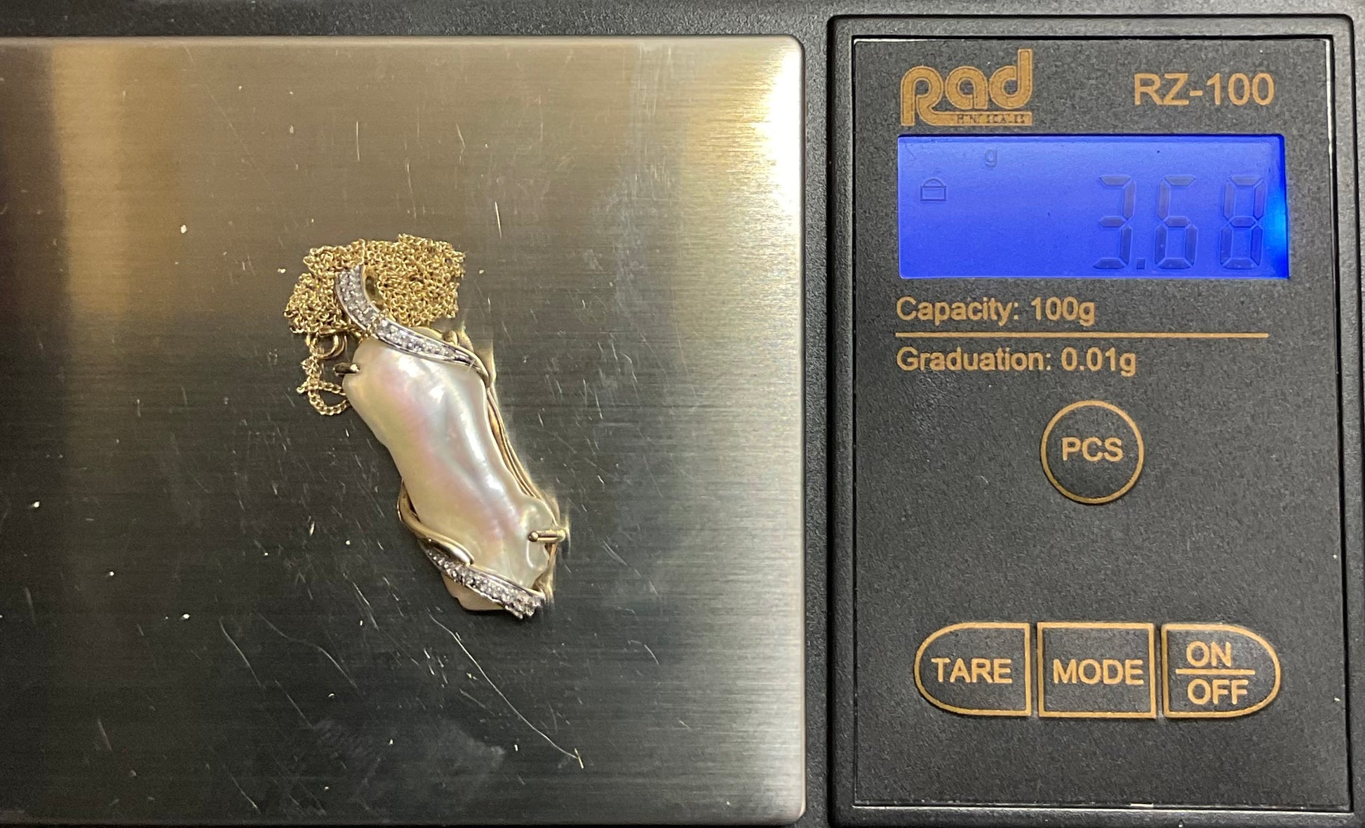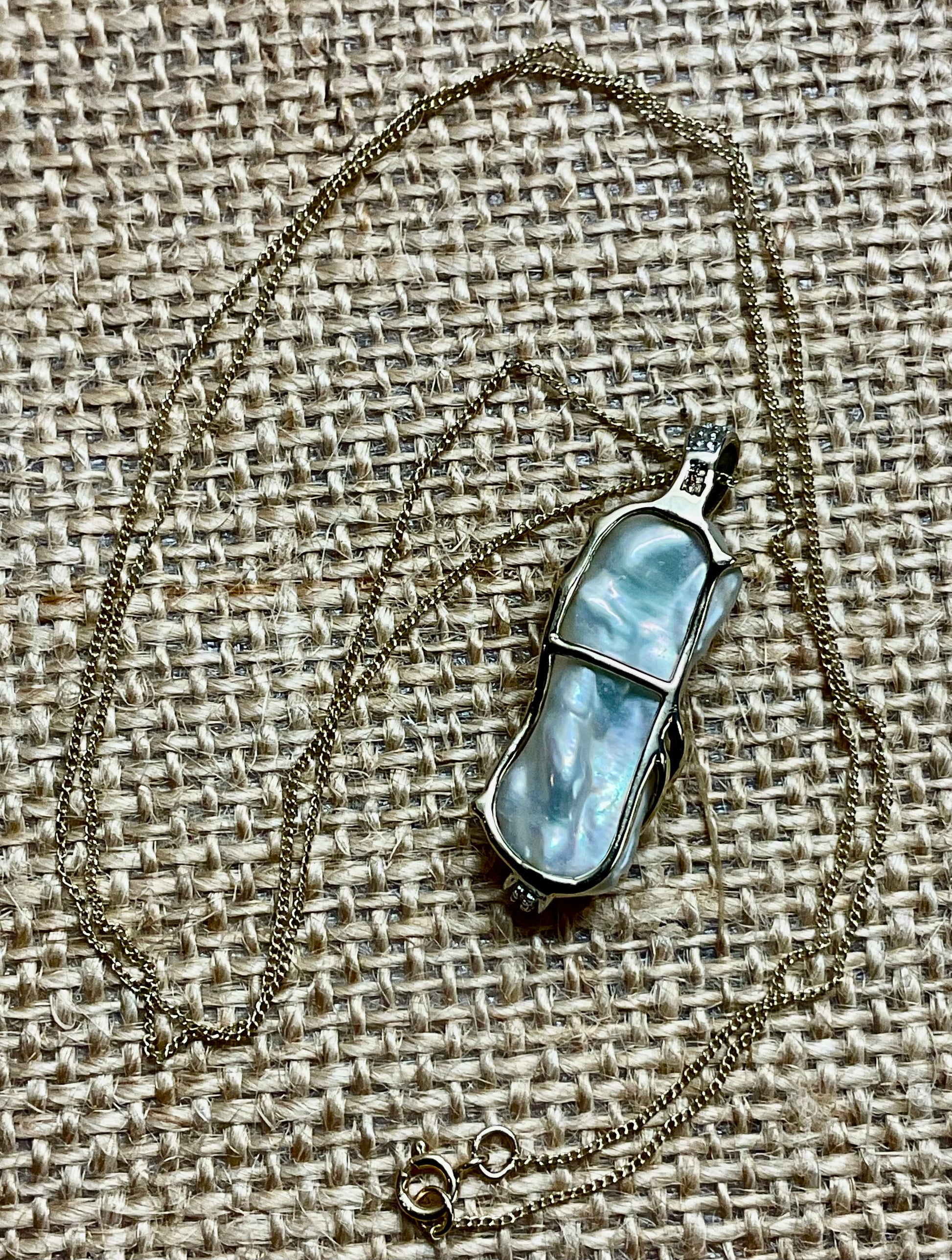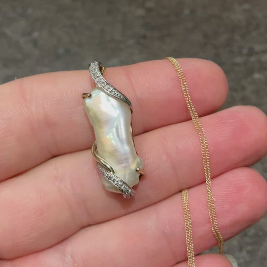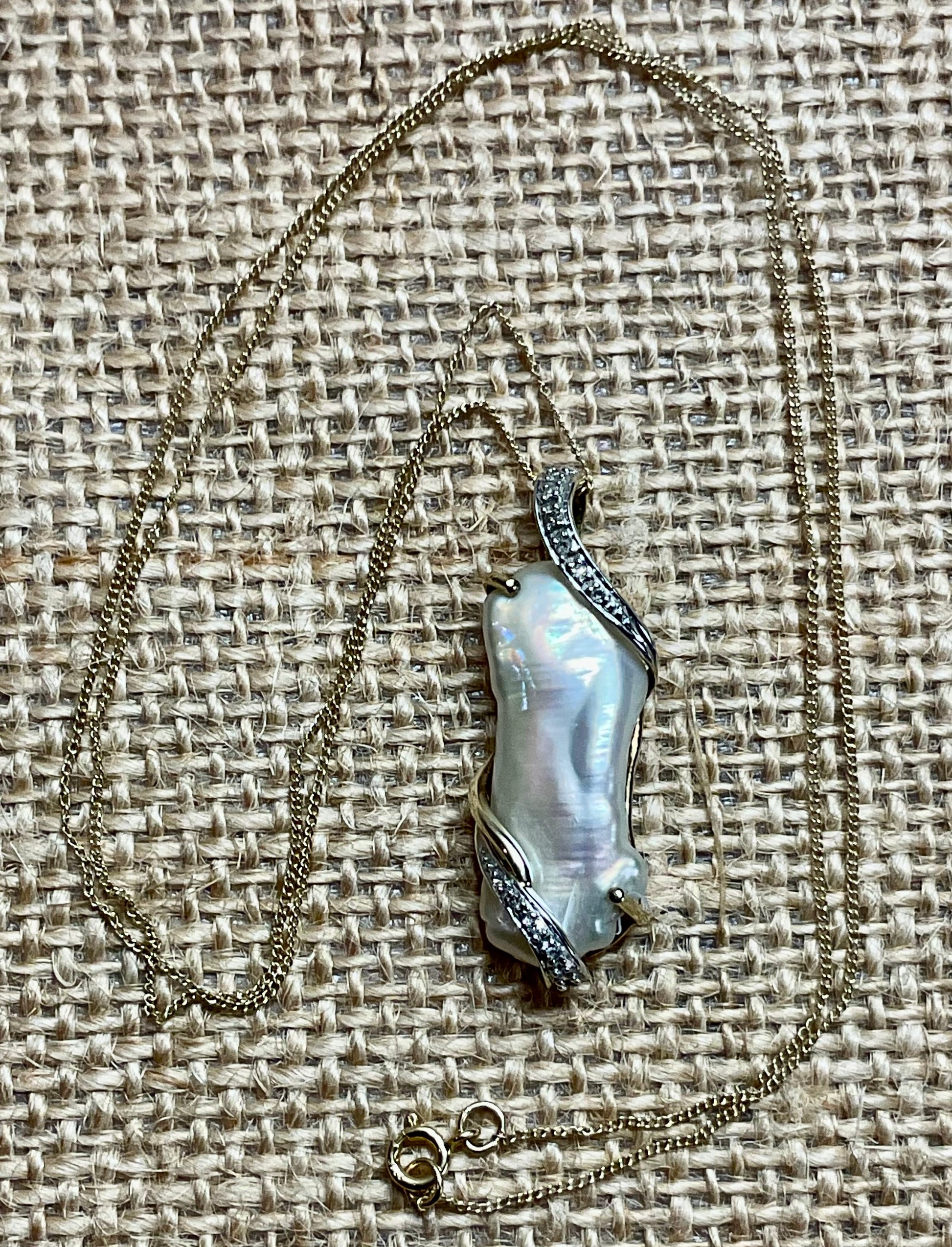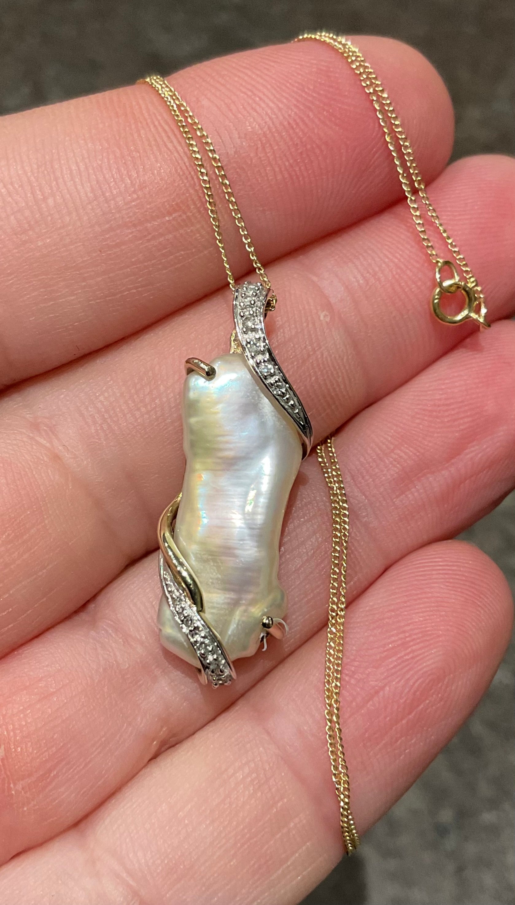 Vintage 9ct Baroque Pearl and Diamond pendant necklace 18” yellow gold