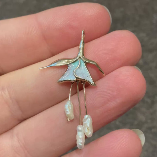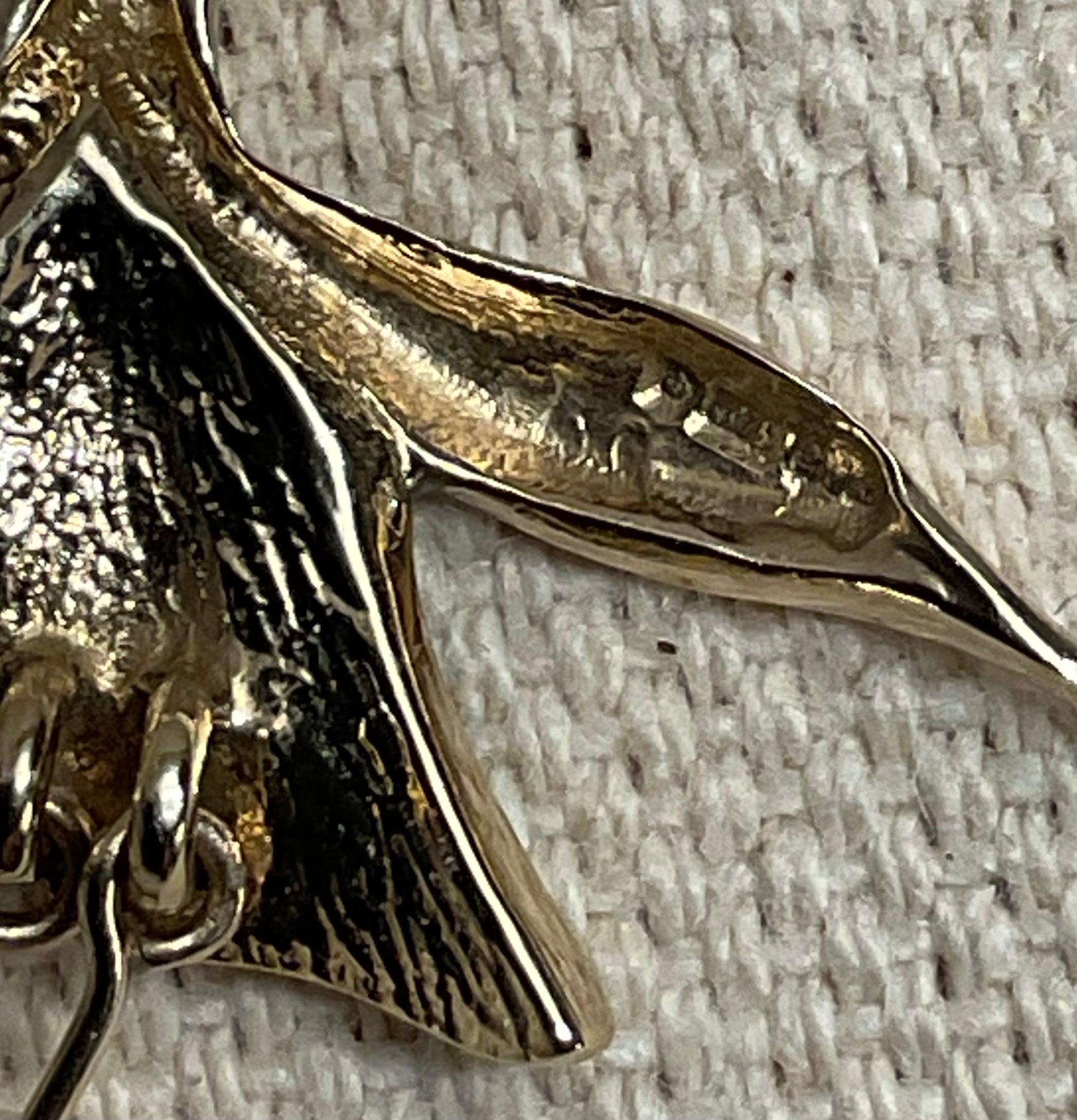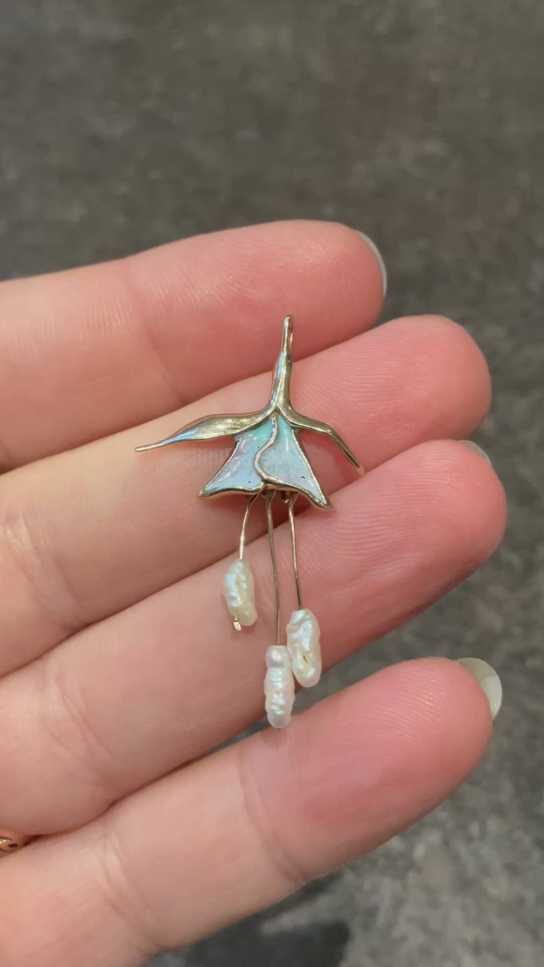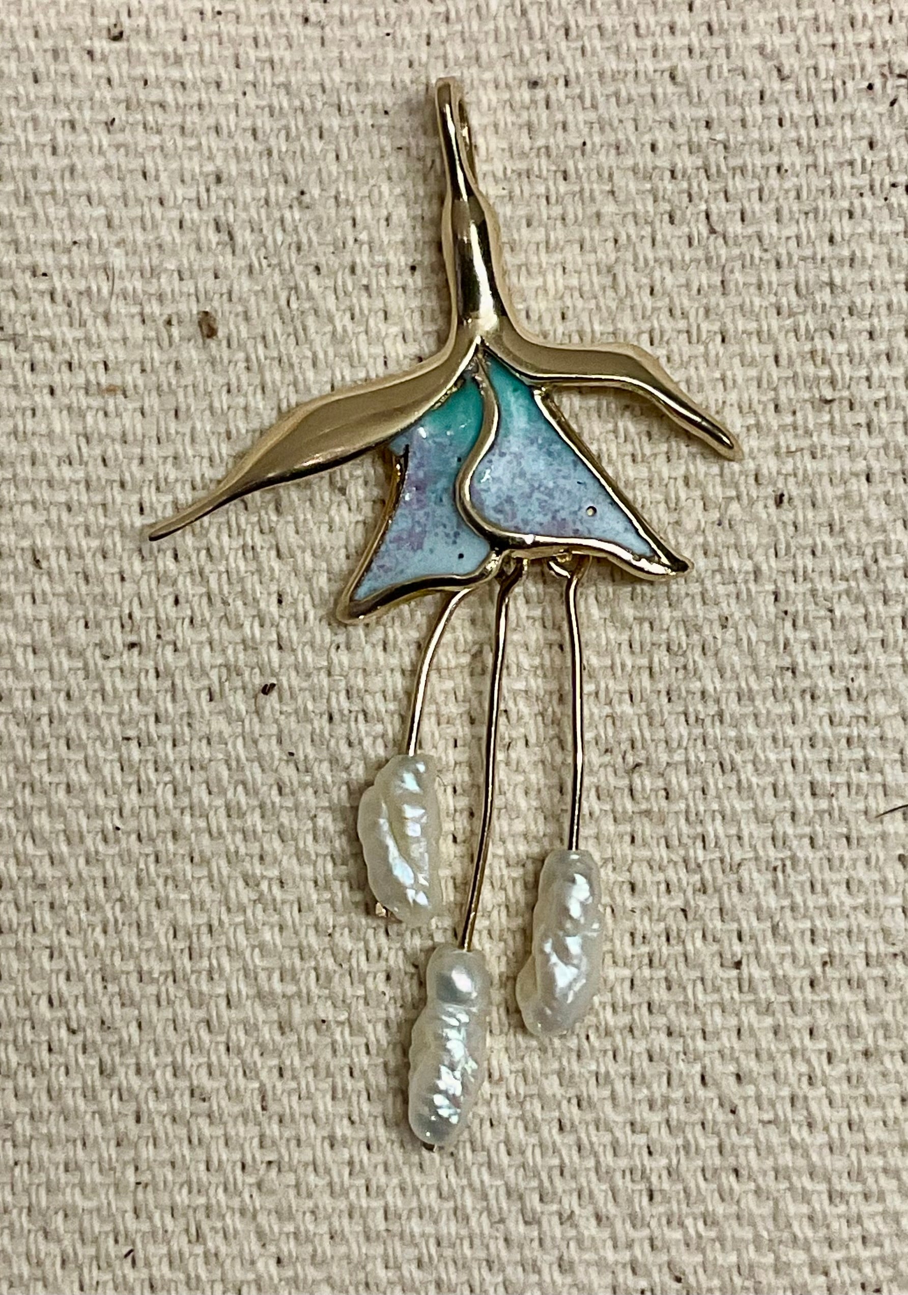 This is a stunning little vintage pendant featuring a pale blueish purplish enamelled flower with 9ct yellow gold sepals and bale. The 3 stamens are made up of gold filaments with rice pearl anthers. Each of these is attached by a link at the top, allowing them to move around independently. The back of the pendant has a hallmark and I can easily make out the crown and 375 (showing it was made between 1975 and 1998) but I think there are other marks that I can’t make out. This pendant is 4cm long and 2.2cm at its widest. It is preloved but in good vintage condition with small signs of wear. It will come in a gift box.