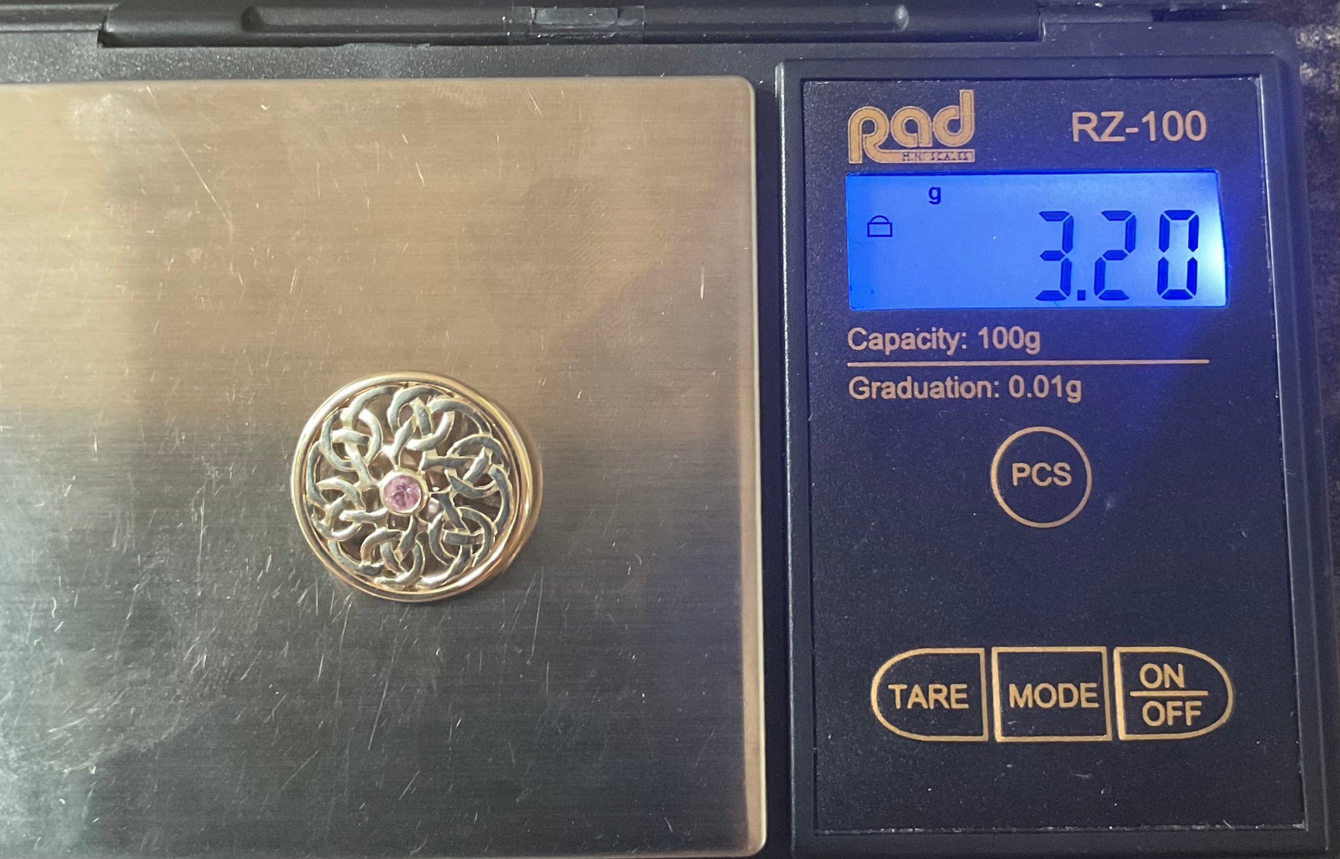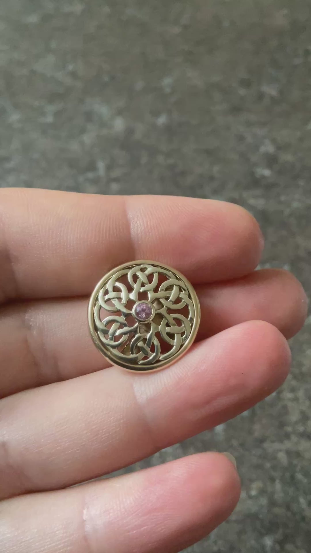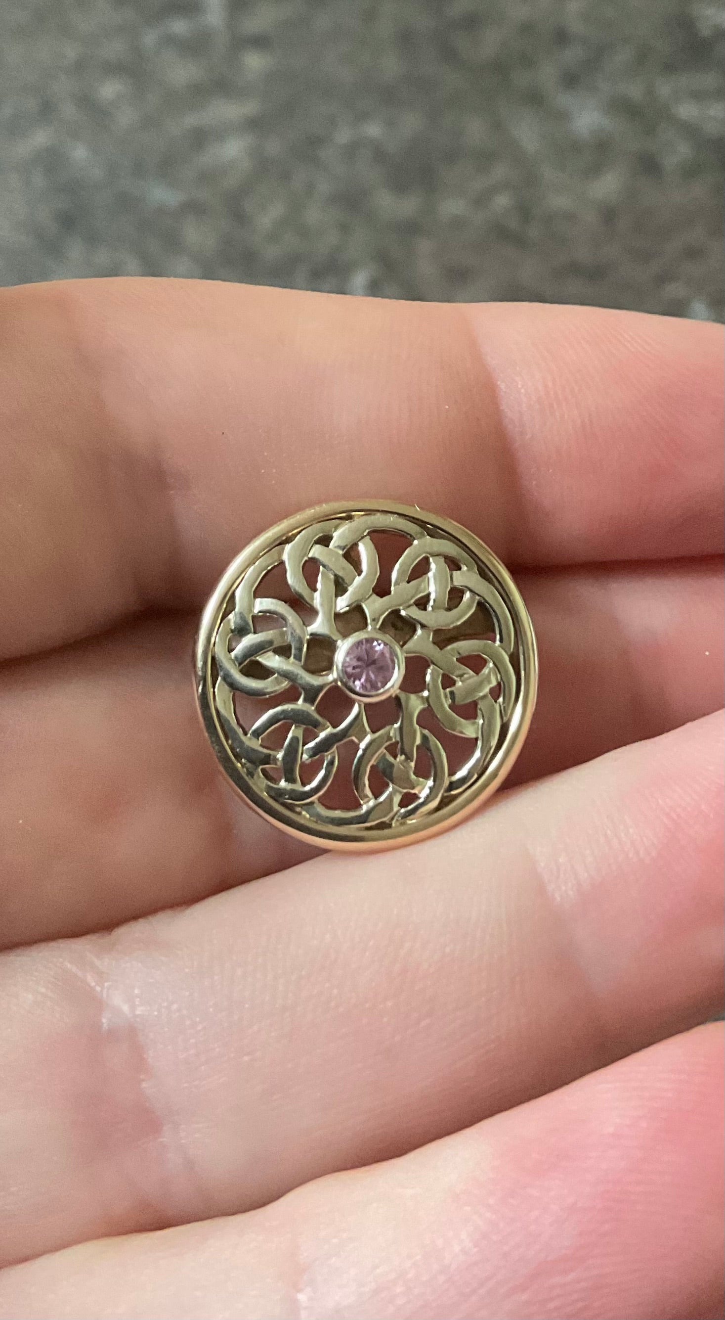 This is a gorgeous little Vintage Clogau piece, that’s not easy to come by. It has a 9ct yellow gold outer circle filled with 9ct white gold Celtic Knots and features a central 3mm round cut pink sapphire. This is from the Moon Gold range which is Clogau’s version of white gold and there is a little crescent moon stamp on the back to show this. There is a full Sheffield 375 hallmark on the back and I think it’s dated 2001. It has a pin on the back that allows it to be worn as a brooch with a little swirl of gold that looks like a piggy tail to clip the pin in and out of. I have shown it as clearly as I can in the video, I don’t think it’s the most secure of designs to be honest. It also has a bale section to the top so that you can wear it as a pendant, so it’s a vey versatile piece. It’s only small, measuring 1.9cm in diameter, so I’ve added a photo of it next to a £1 coin to make its size clear to you. It’s preloved with small signs of wear if you look for them but is in good condition. It will come in a Clogau box and pouch.